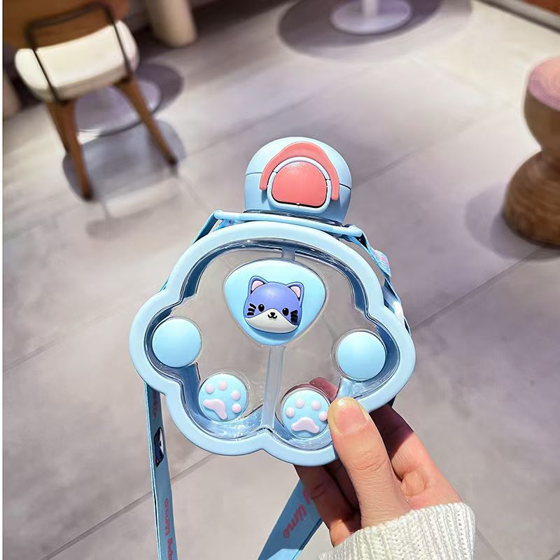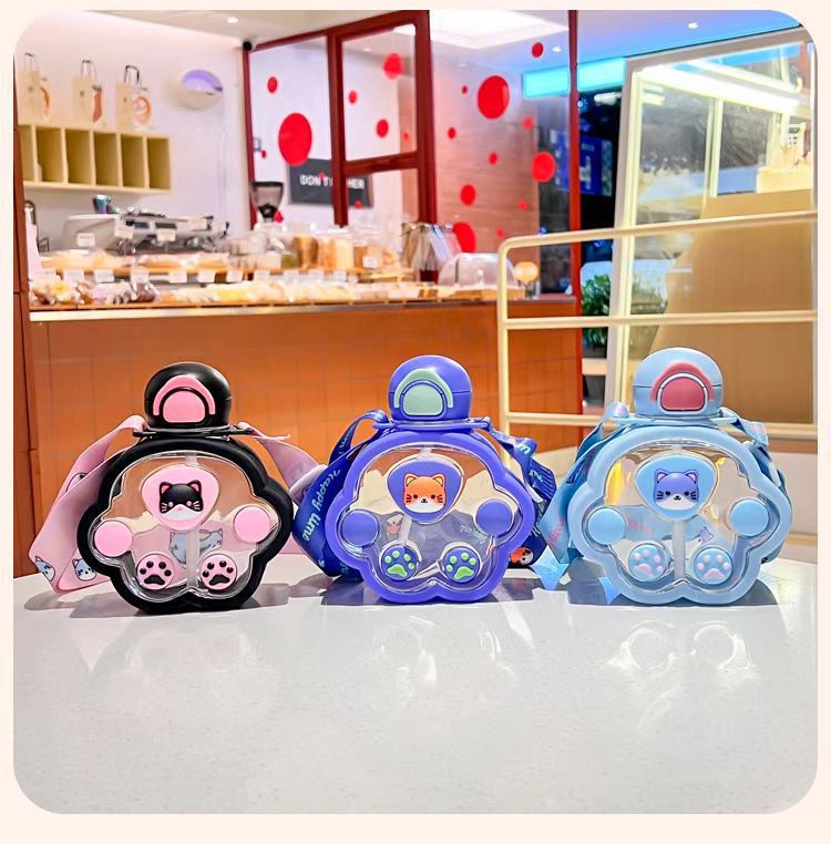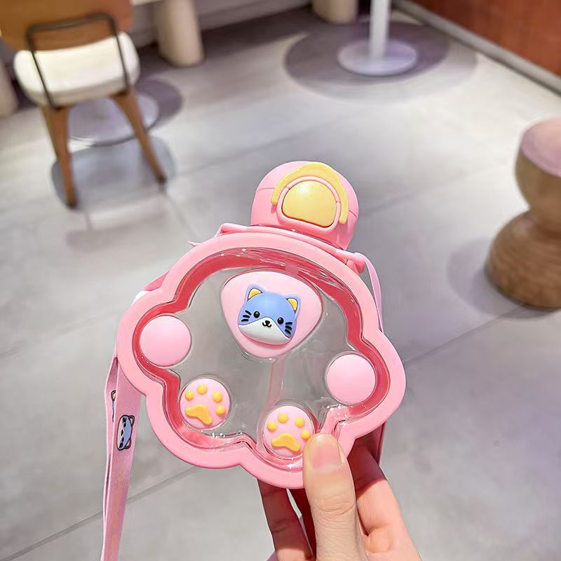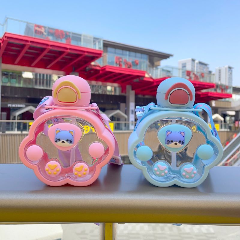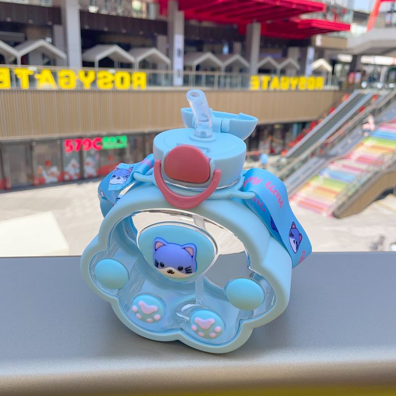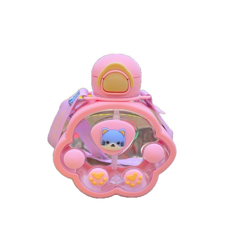 新款儿童猫爪塑料杯卡通吸管水杯创意男女学生背带便携大容量杯子