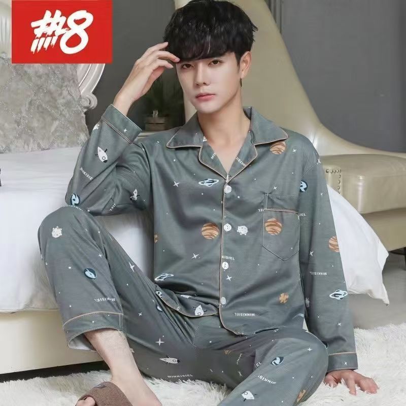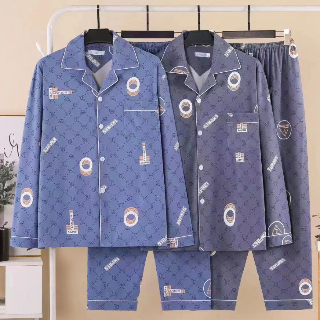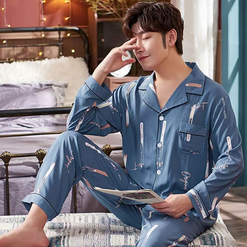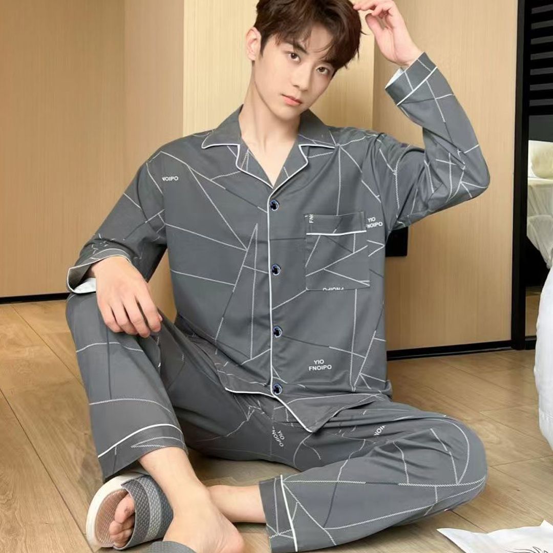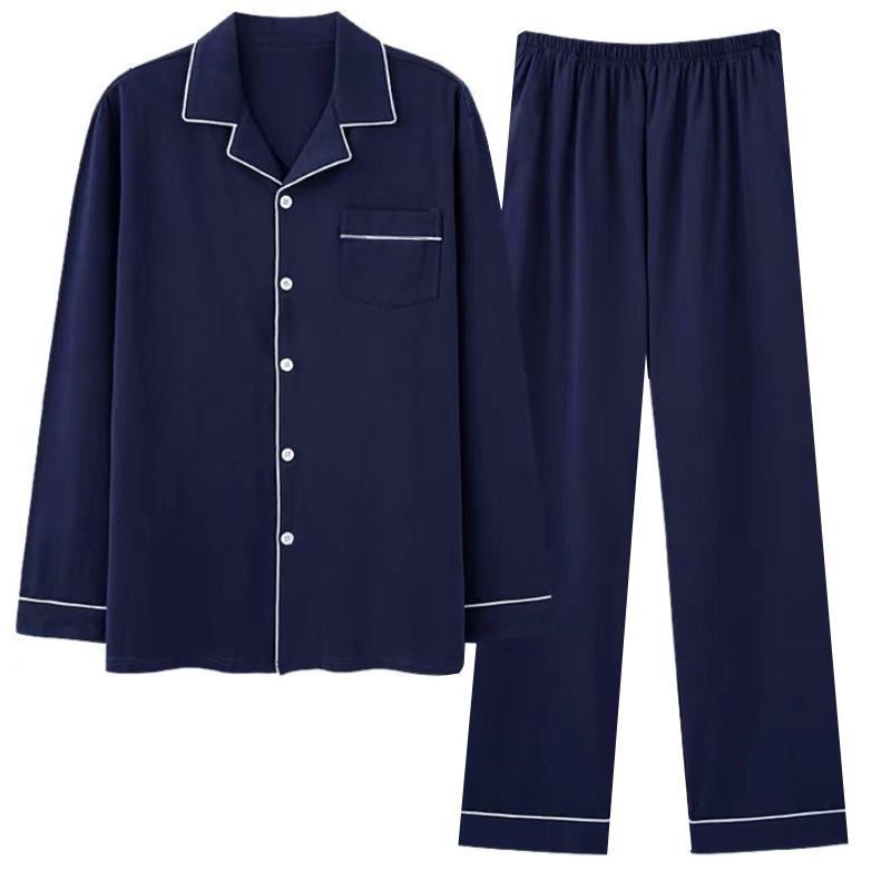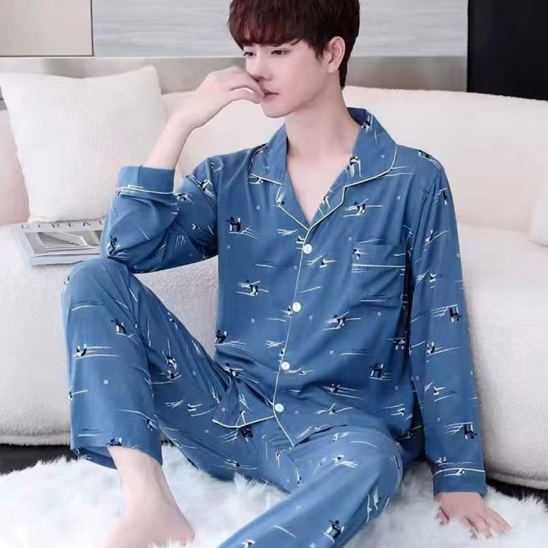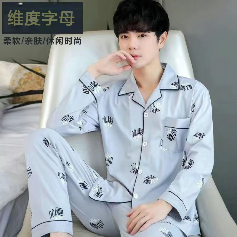 100%纯棉睡衣男士春秋季长袖全棉大码肥佬青年家居服男式开衫套装
