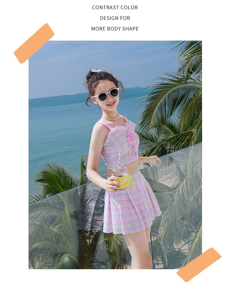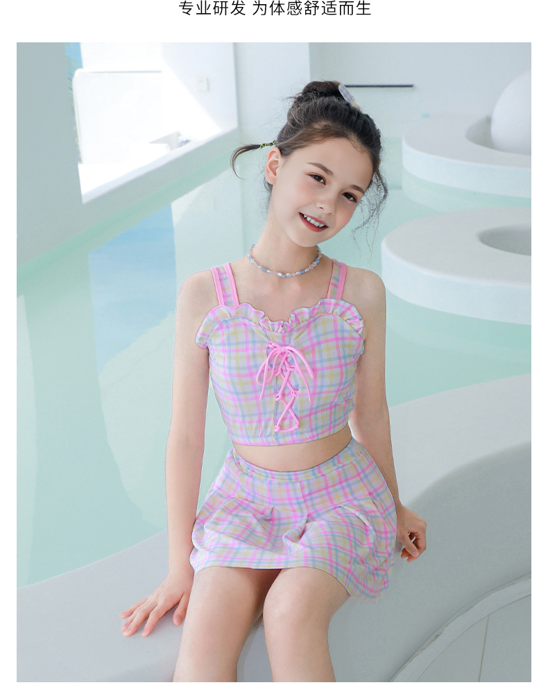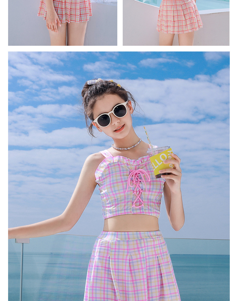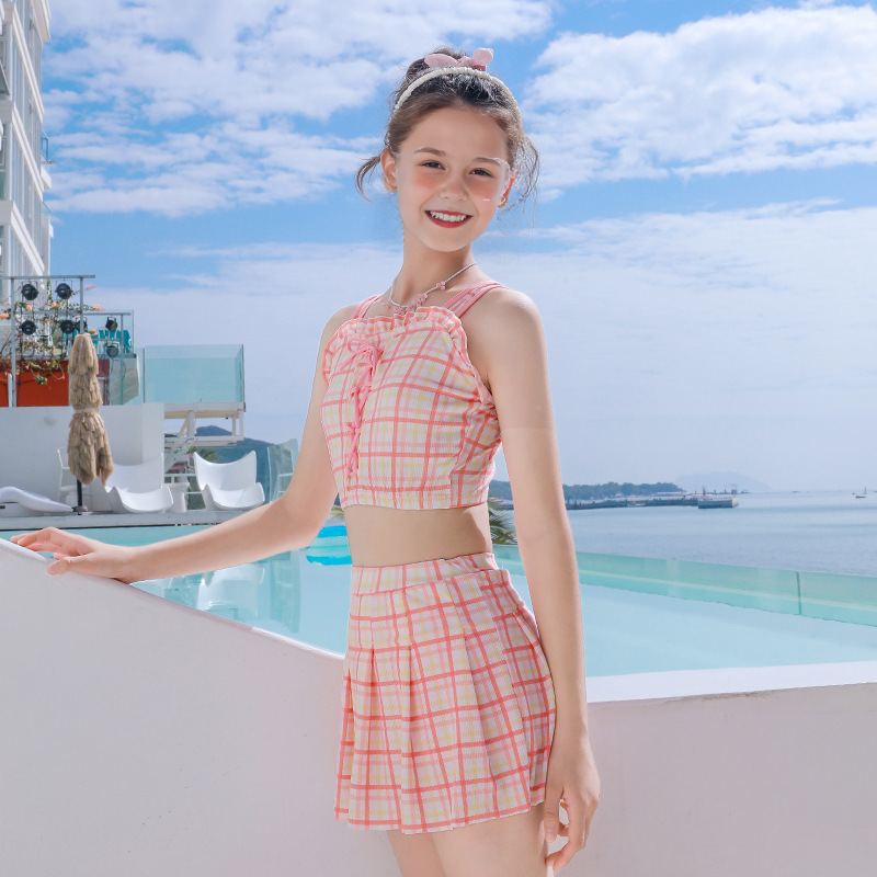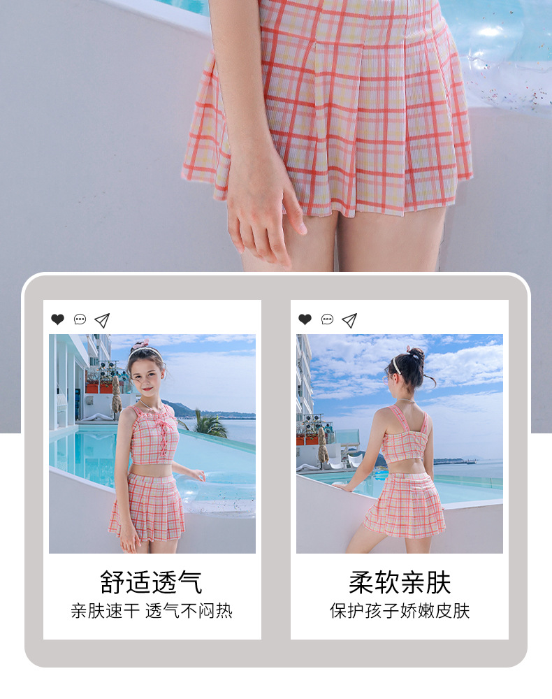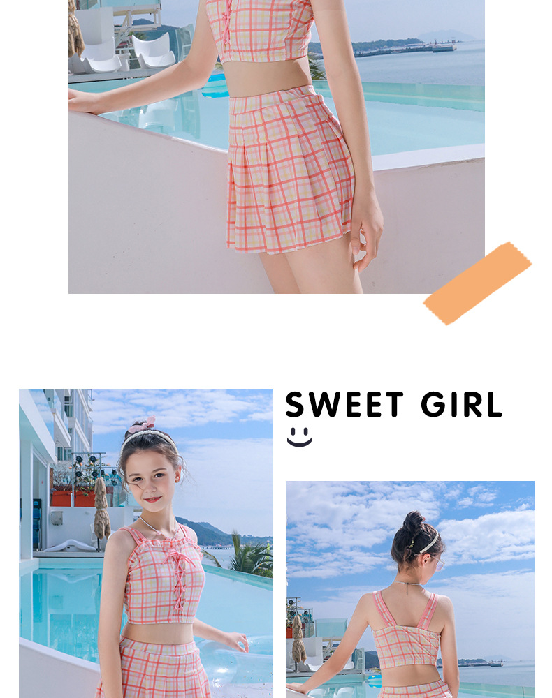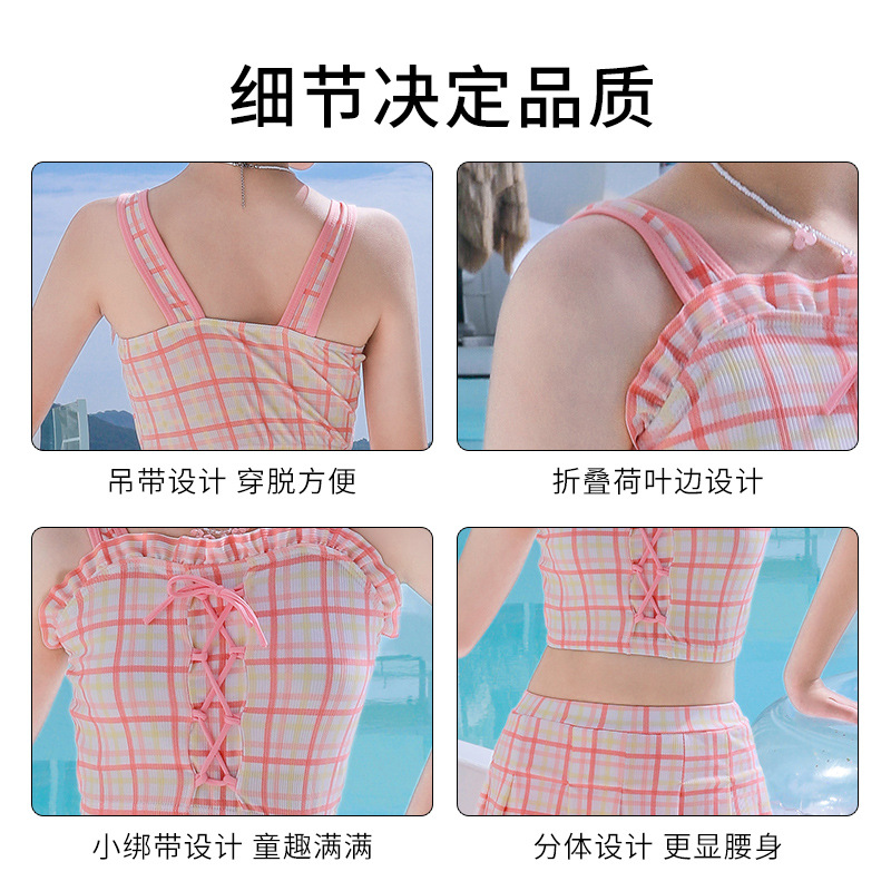 新款女童学生沙滩海边分体裙式泳装素色格子卡通图案款小清新泳衣