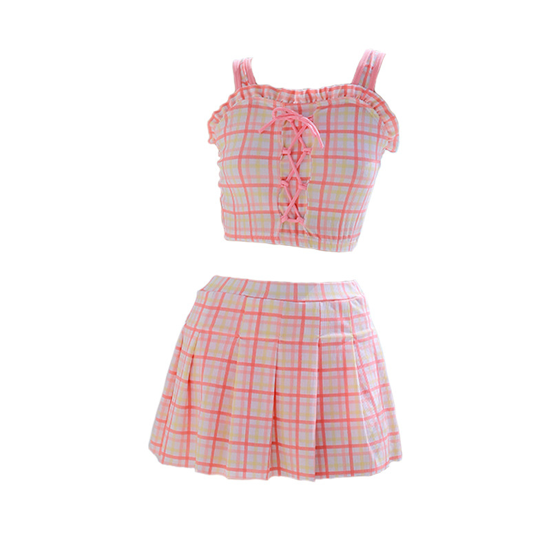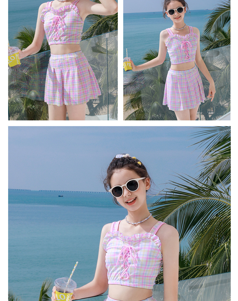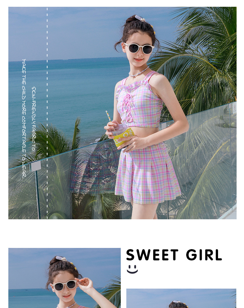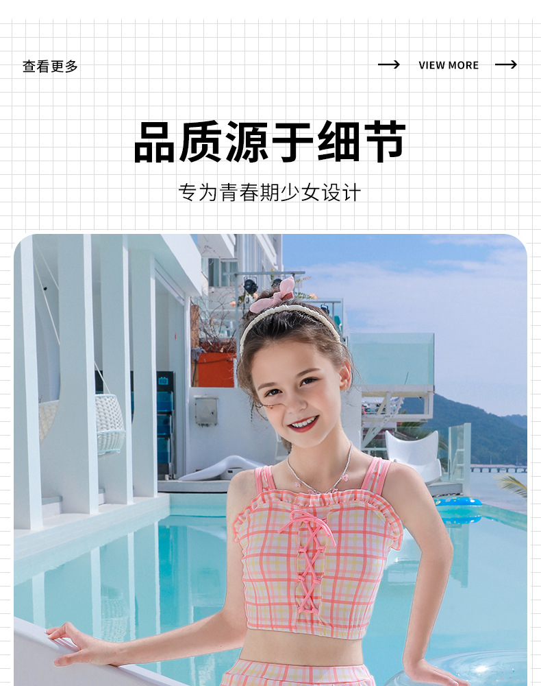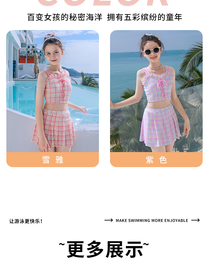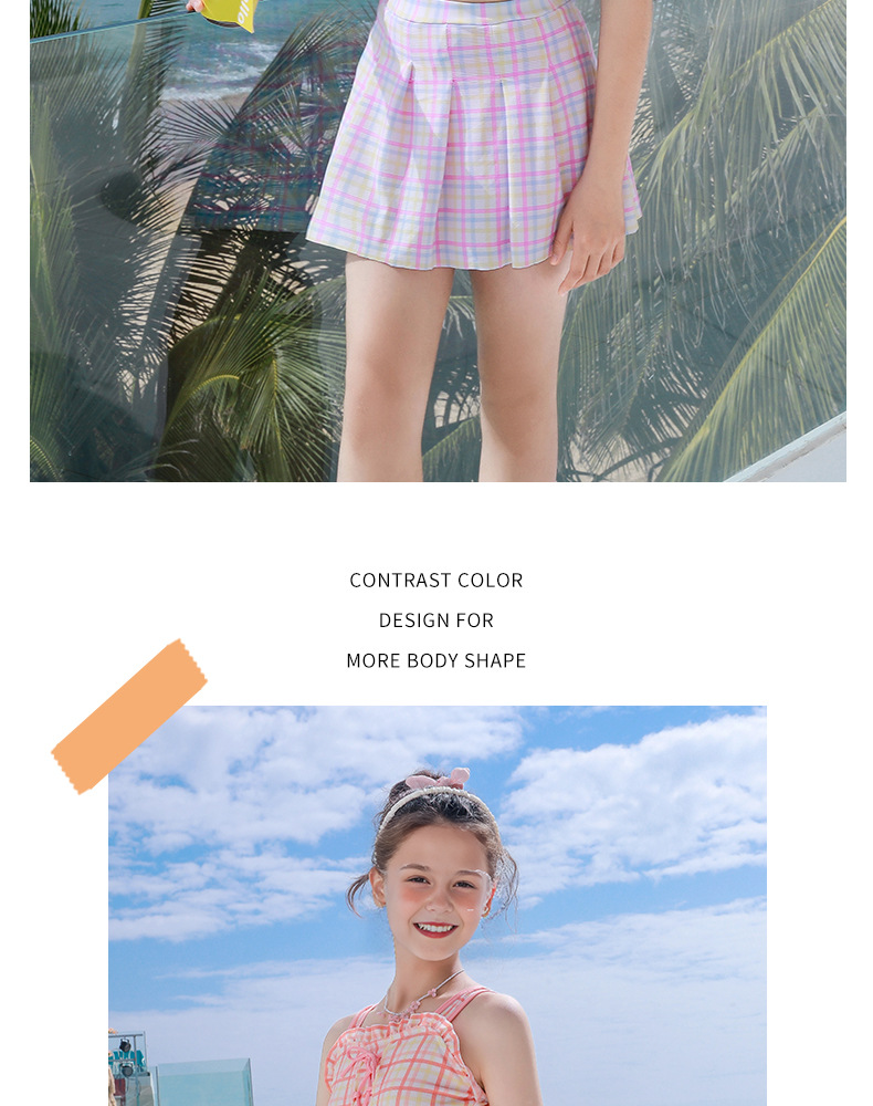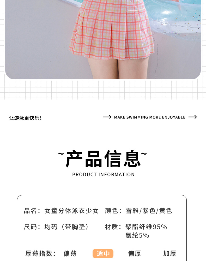 新款女童学生沙滩海边分体裙式泳装素色格子卡通图案款小清新泳衣