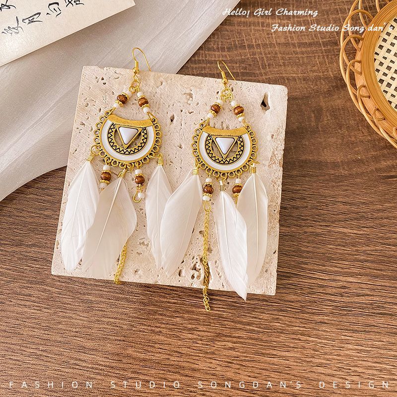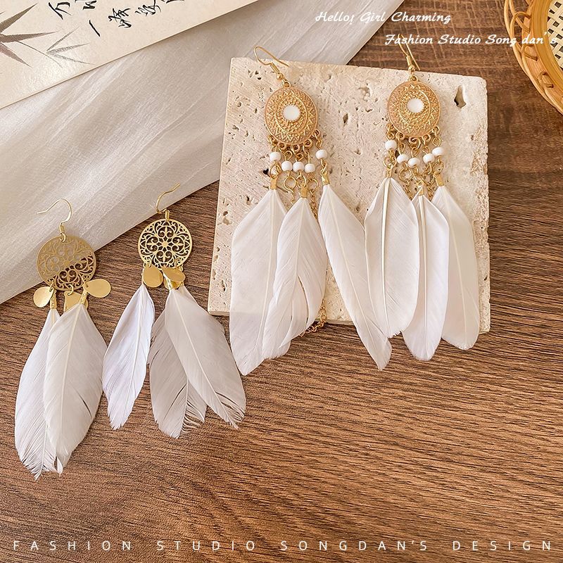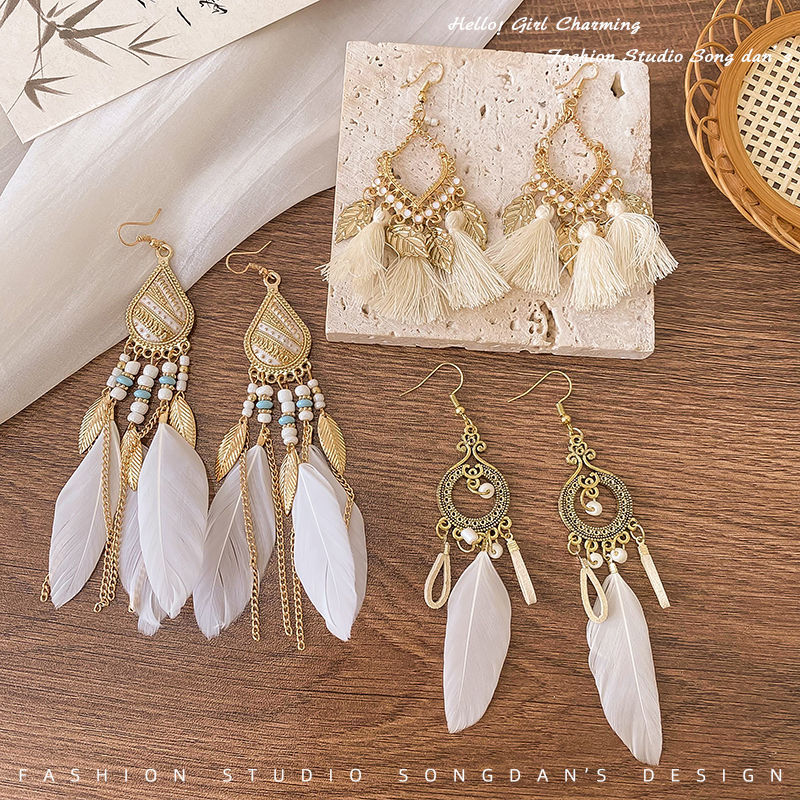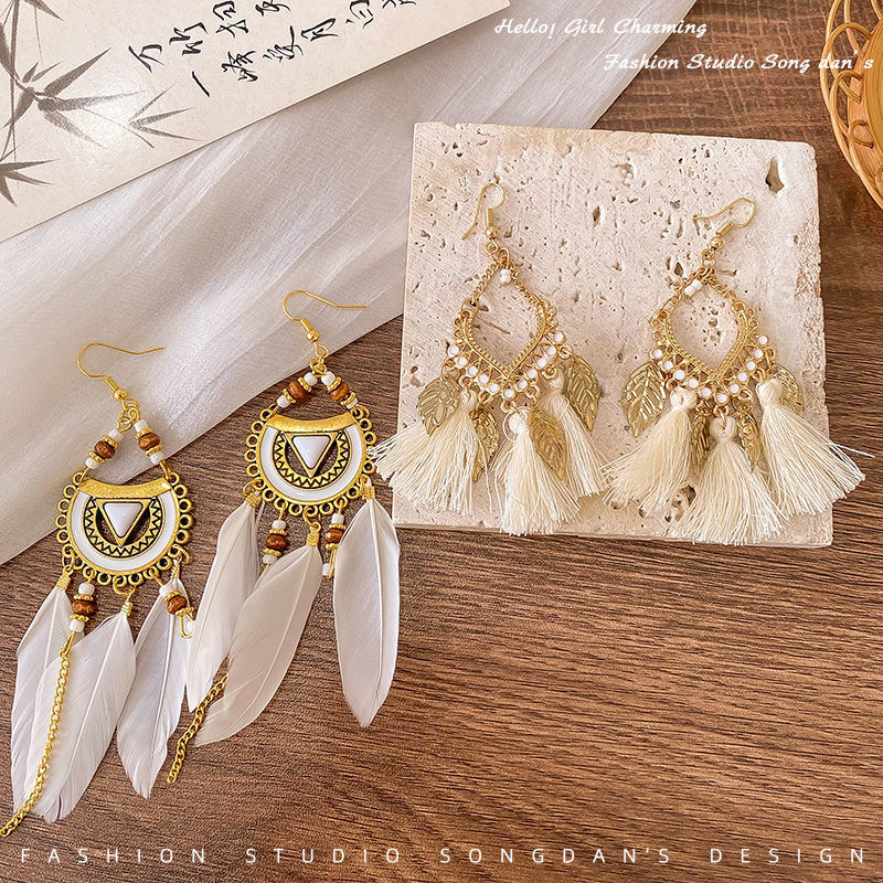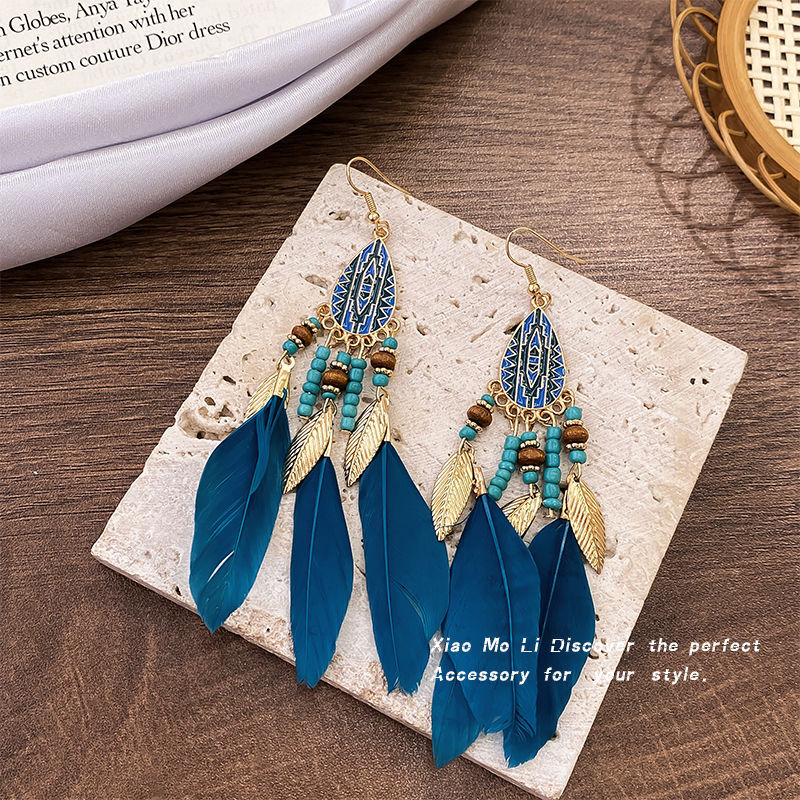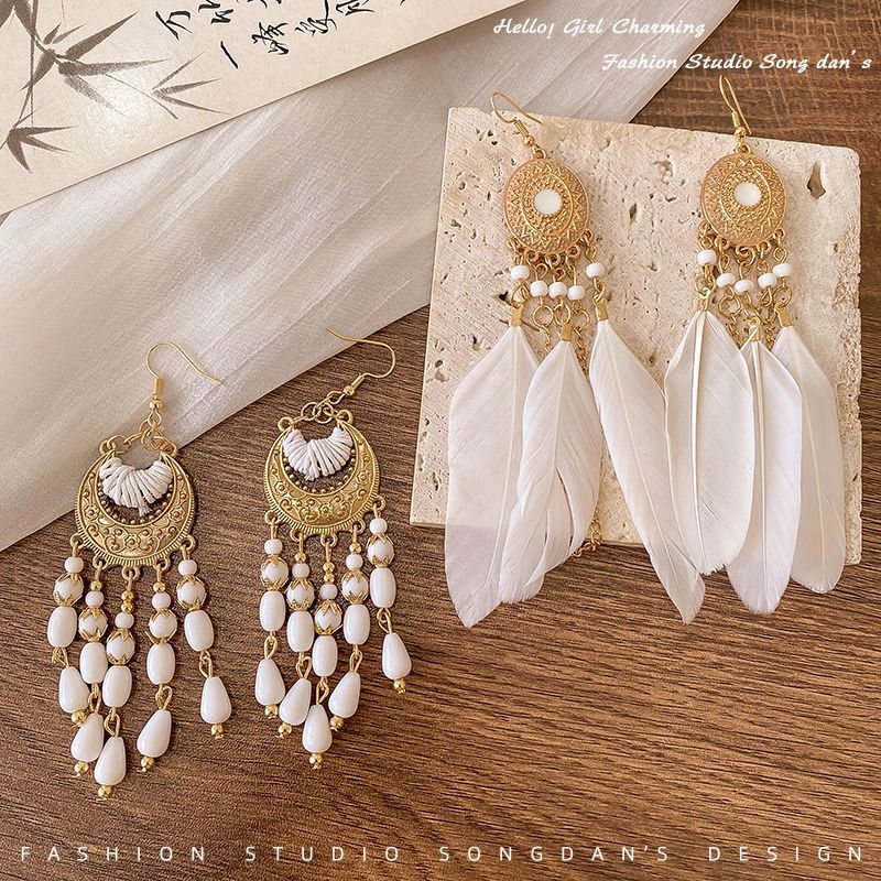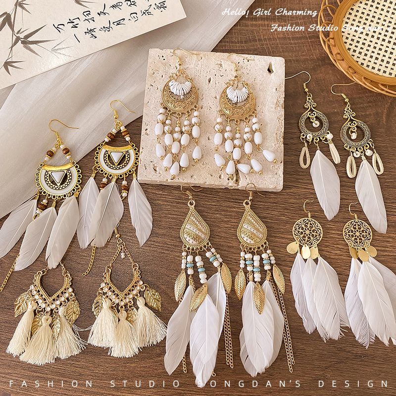波西米亚民族风羽毛流苏耳环女复古国风配饰耳坠独特小众耳钉耳饰