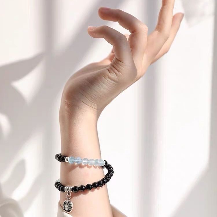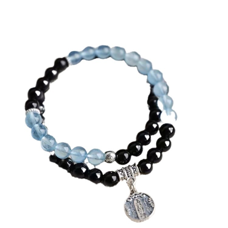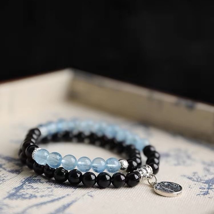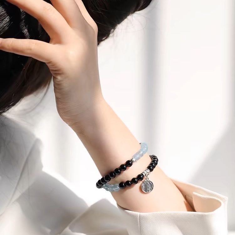 黑曜石手链海蓝宝手串新中式五路财神双层叠戴国风闺蜜学生手链