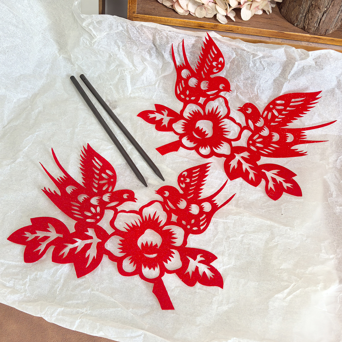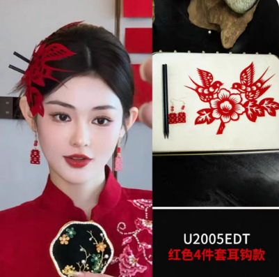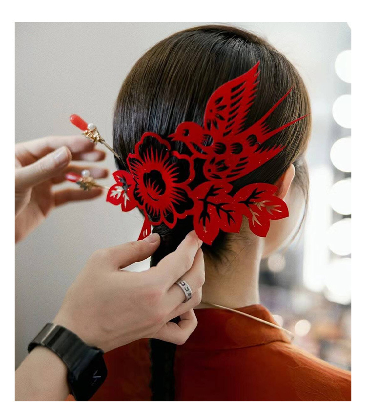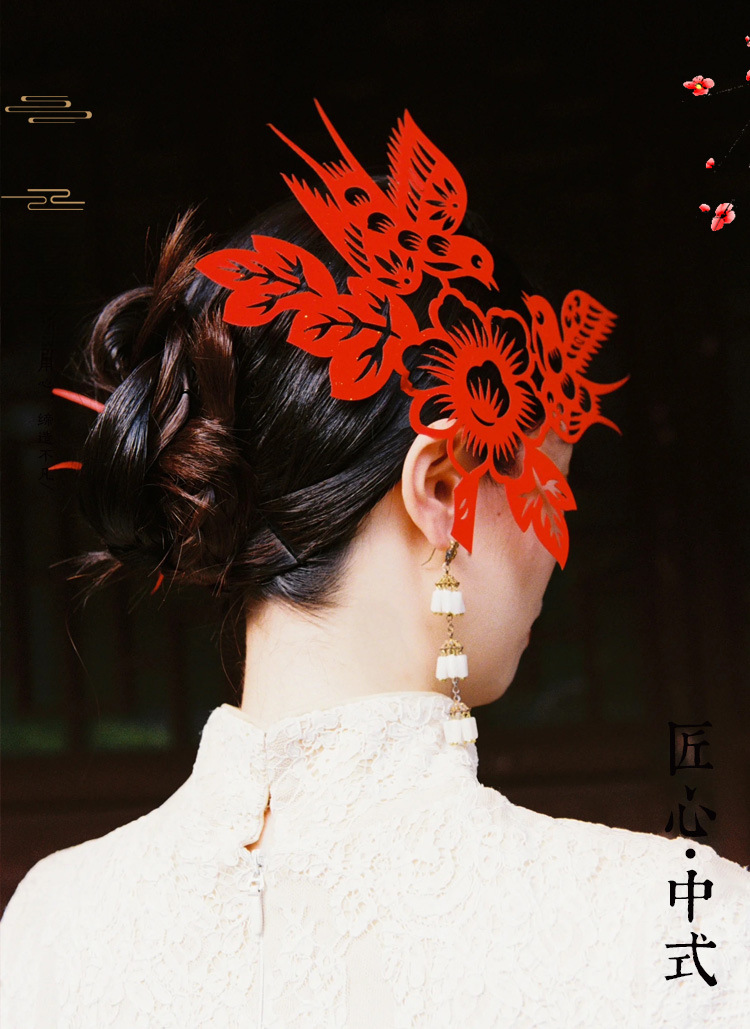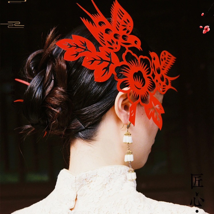 新娘剪纸创意新中式头饰2024红色喜鹊花朵发饰国风旗袍晨袍配饰