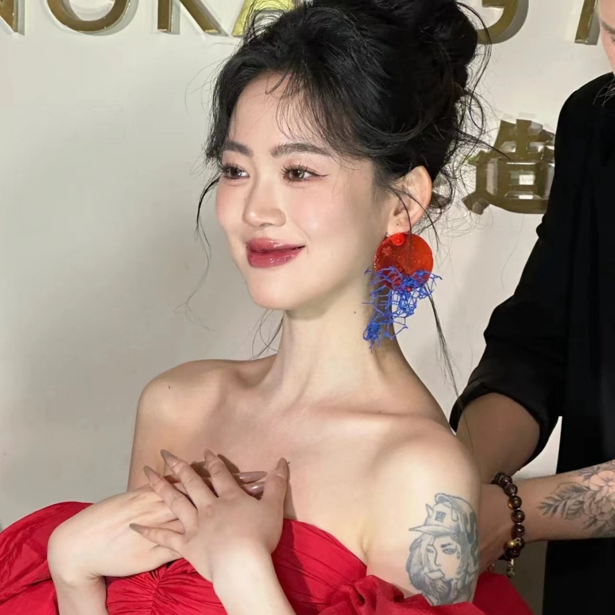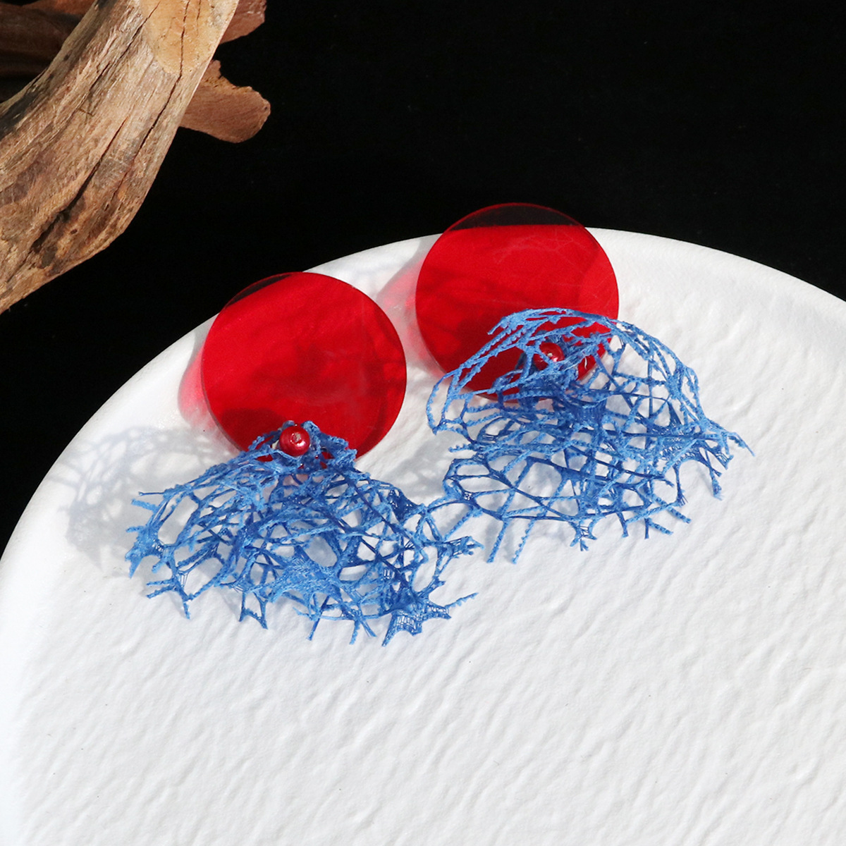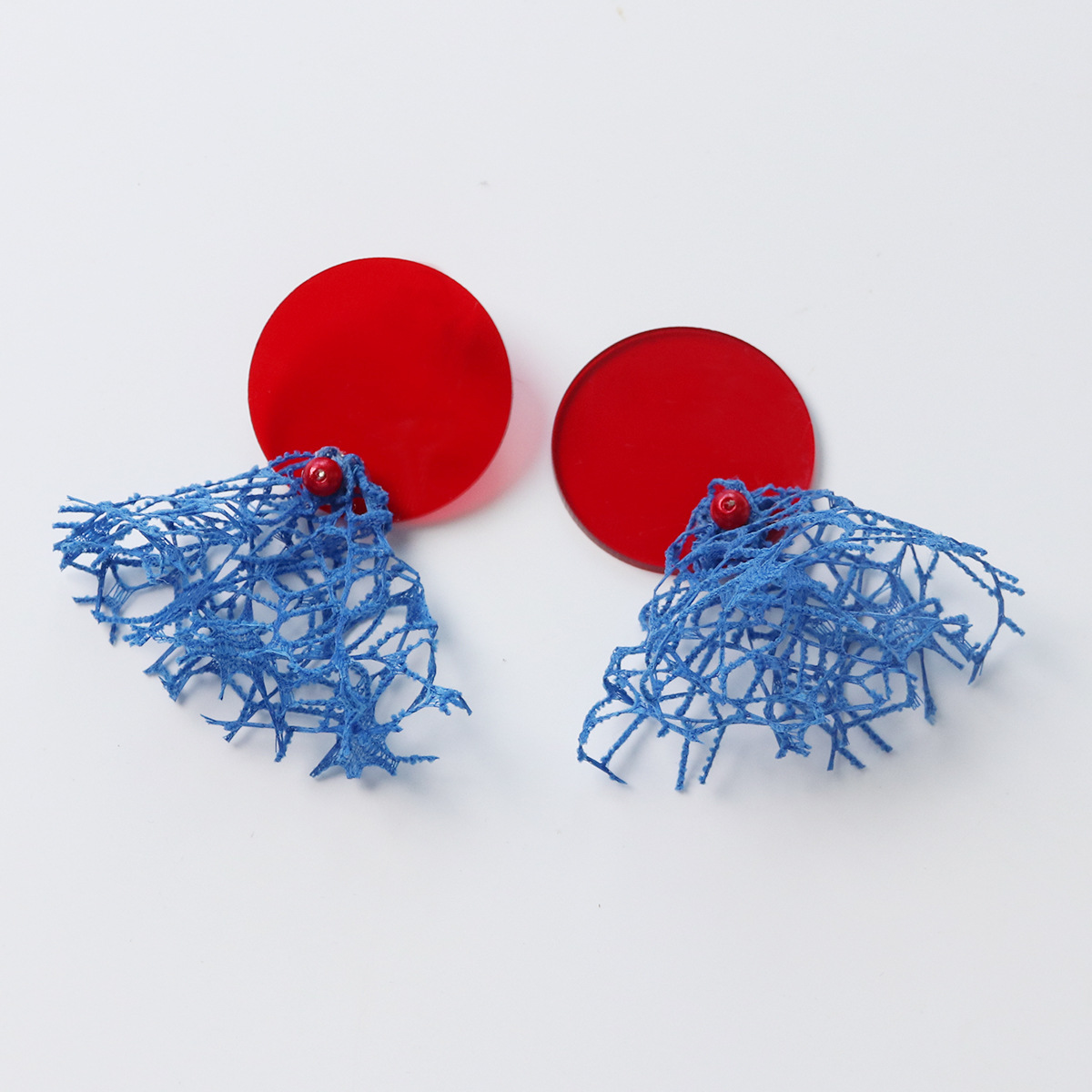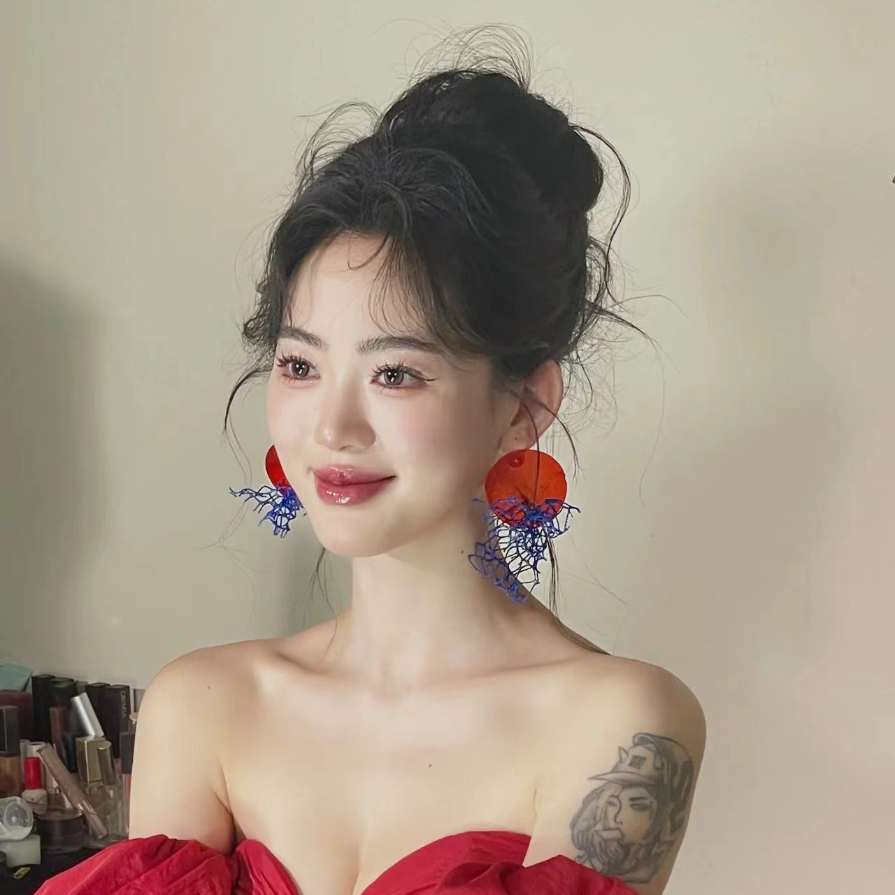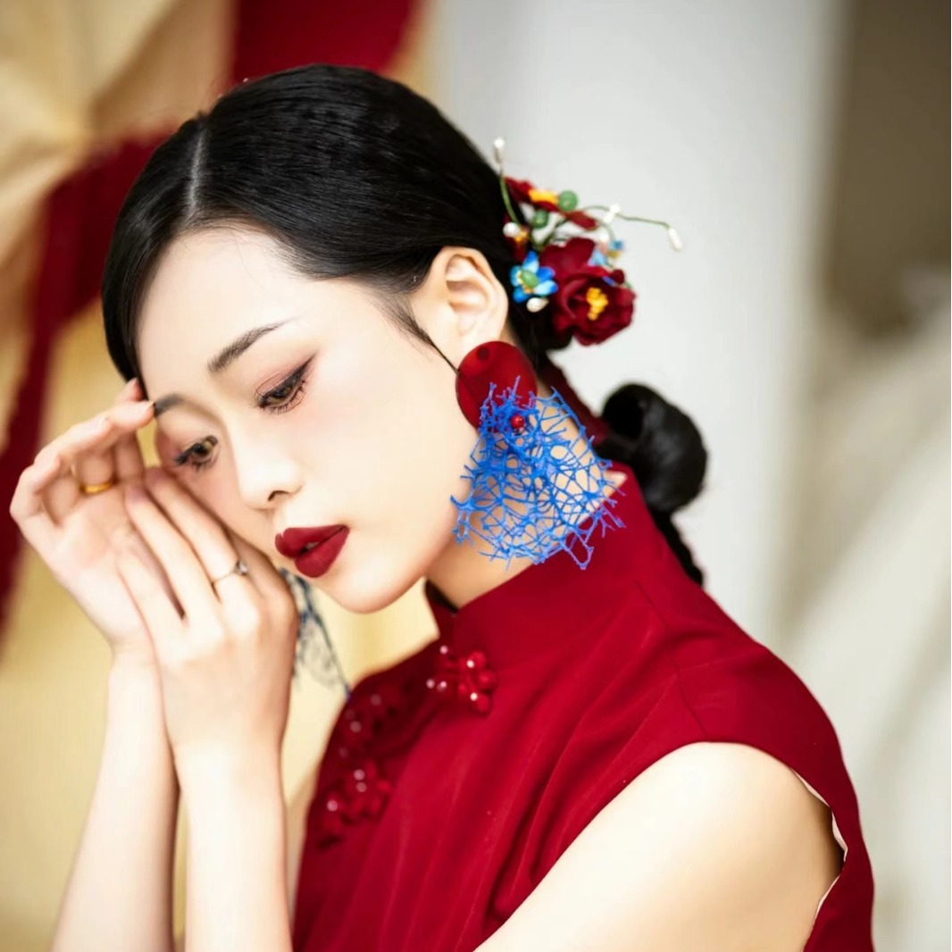 新中式新娘耳环红蓝网纱撞色耳夹新款小众高级感结婚旗袍晨袍配饰