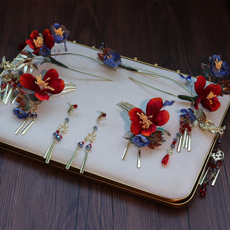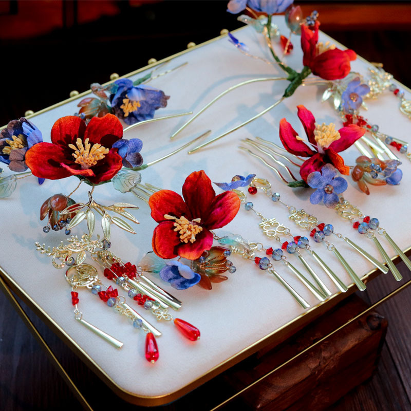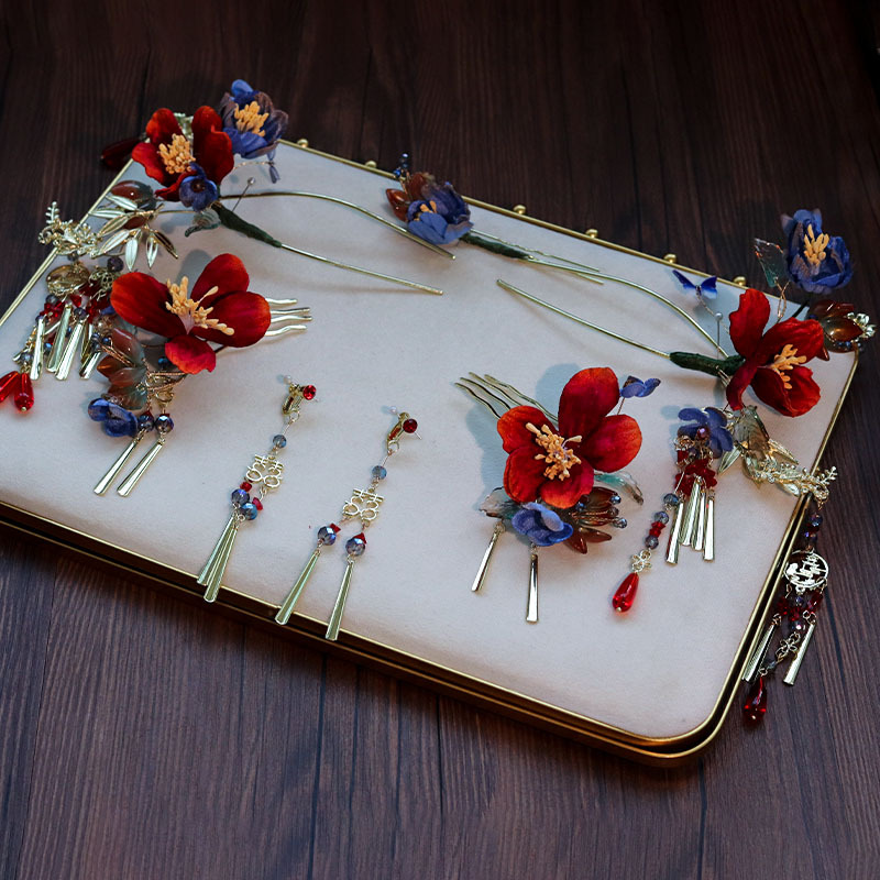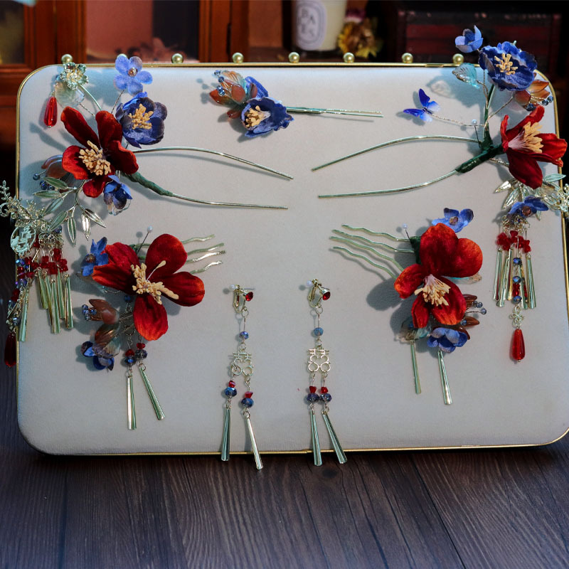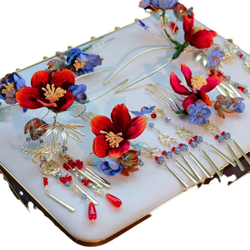 复古新中式旗袍绒布花朵发簪喜字流苏盘发汉服造型布艺后脑勺头饰