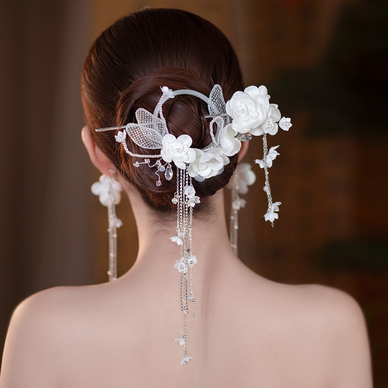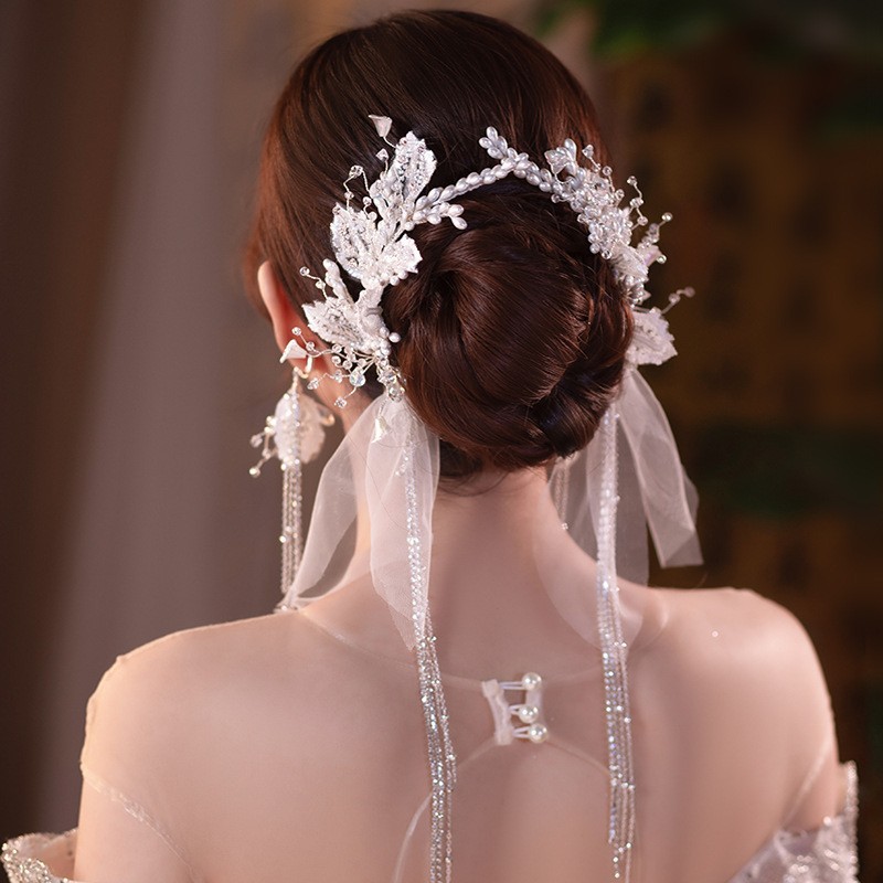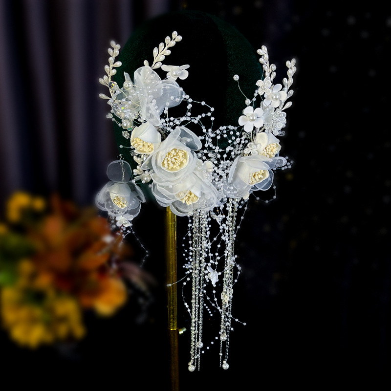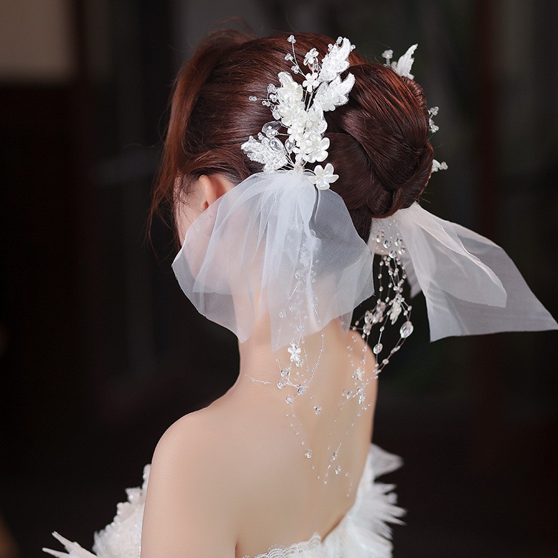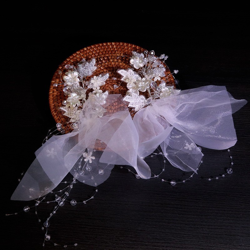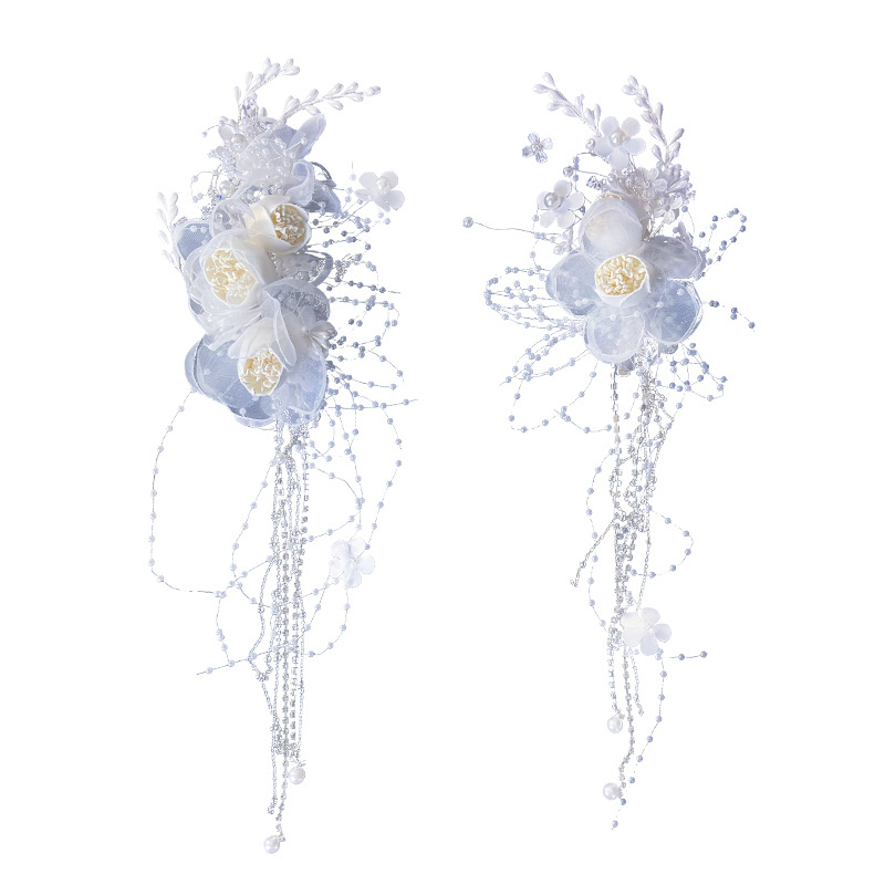 新款新娘头饰超仙甜美发夹娟纱白色花苞对夹婚礼造型配发饰长流苏