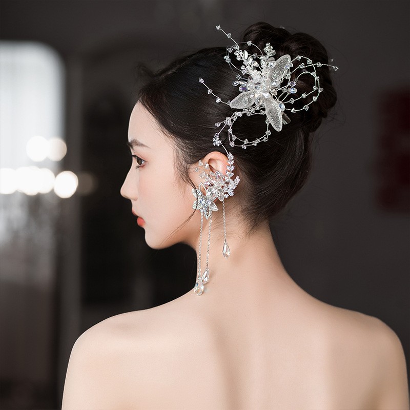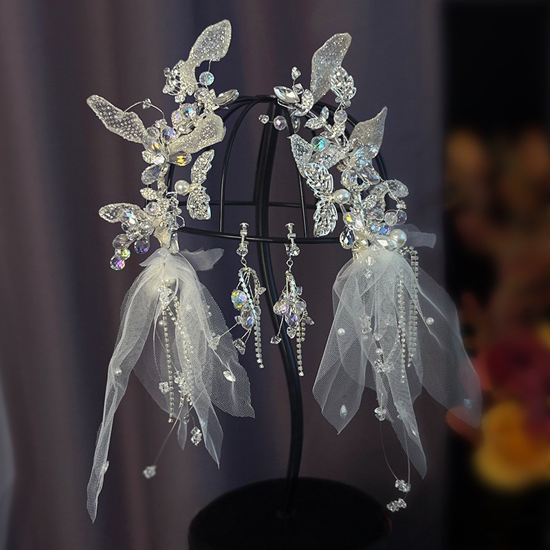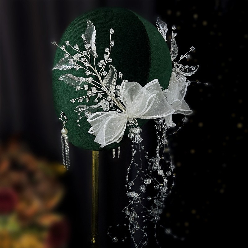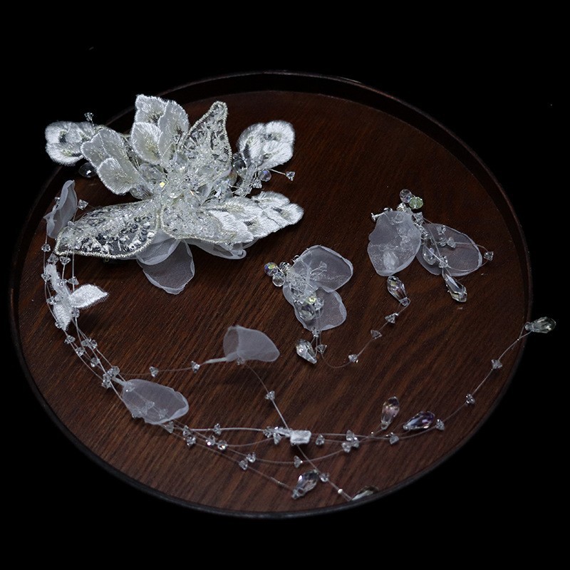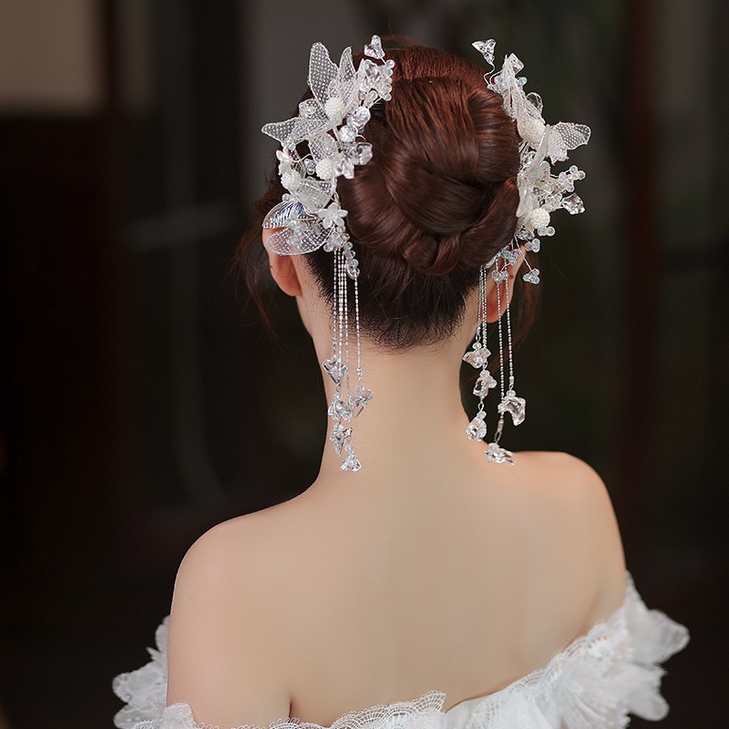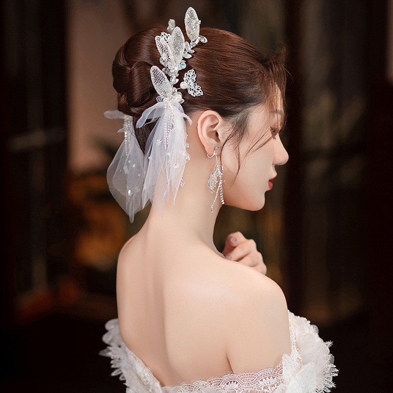 新款新娘头饰超仙甜美发夹娟纱白色花苞对夹婚礼造型配发饰长流苏