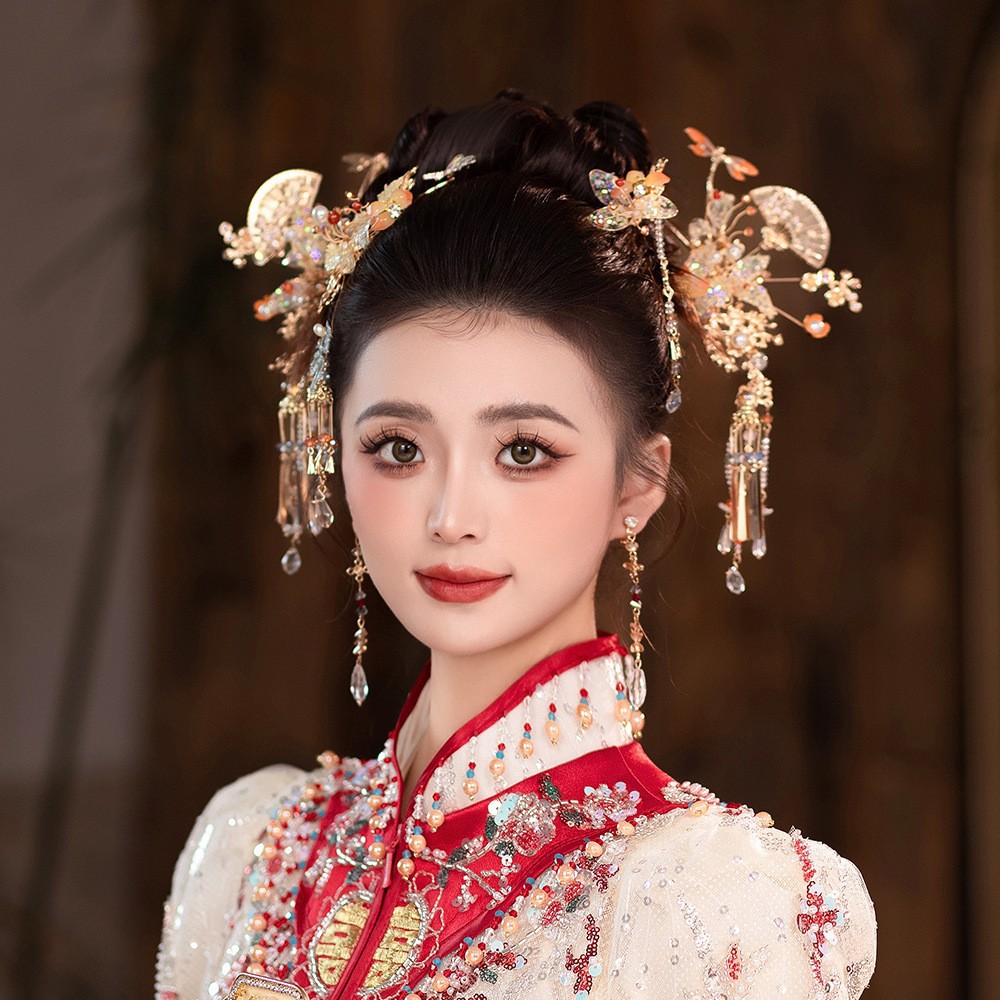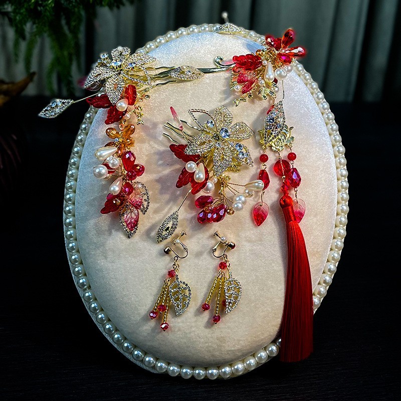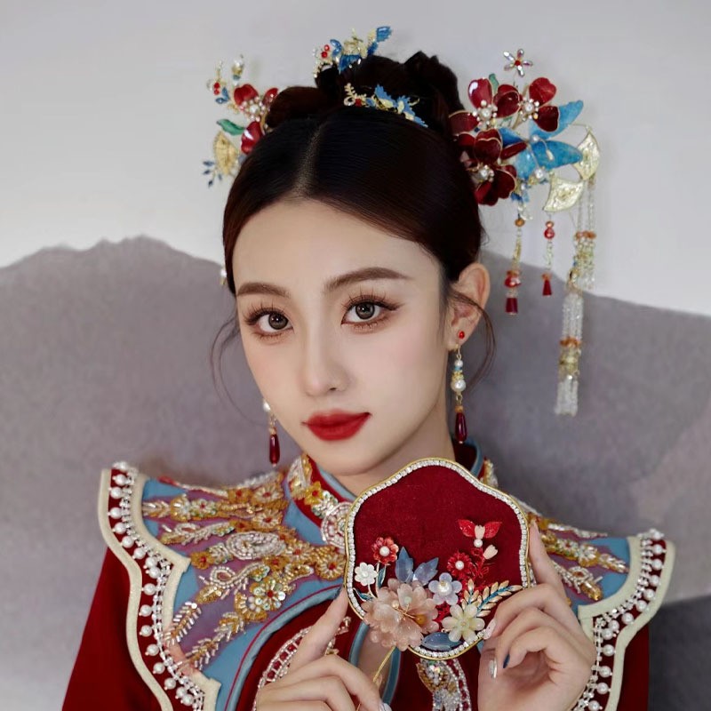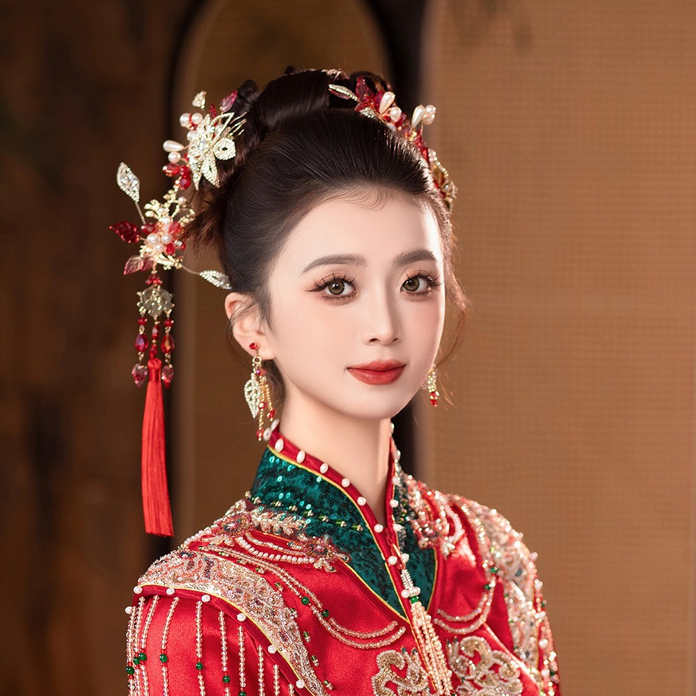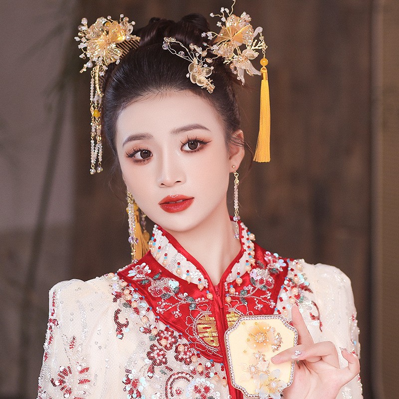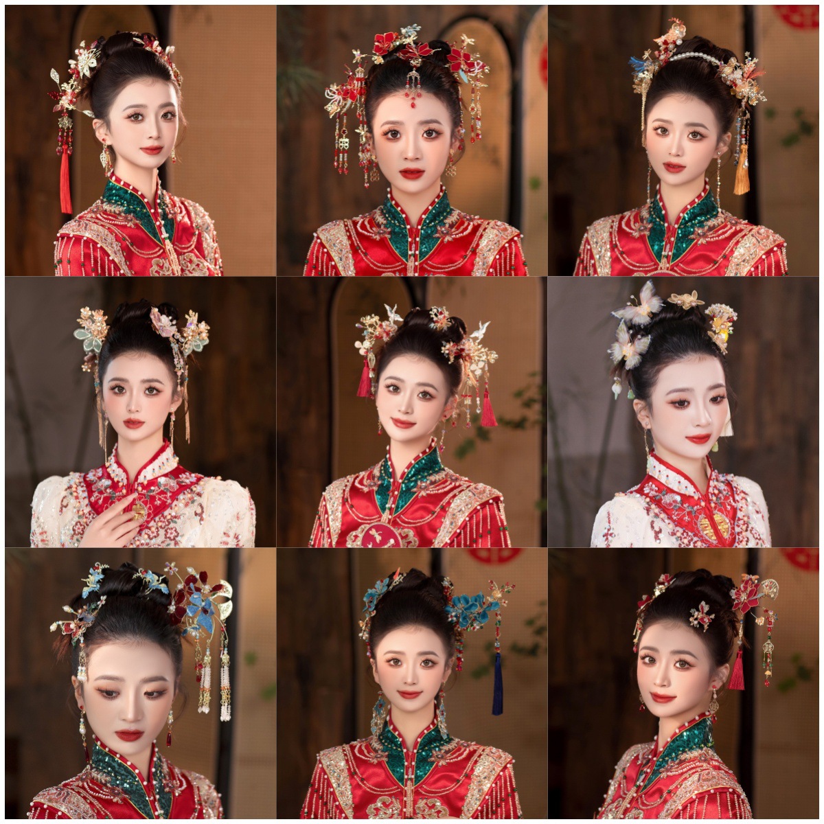 新娘新中式花朵发饰龙凤褂耳夹秀禾服汉服流苏发簪古风头饰配饰品