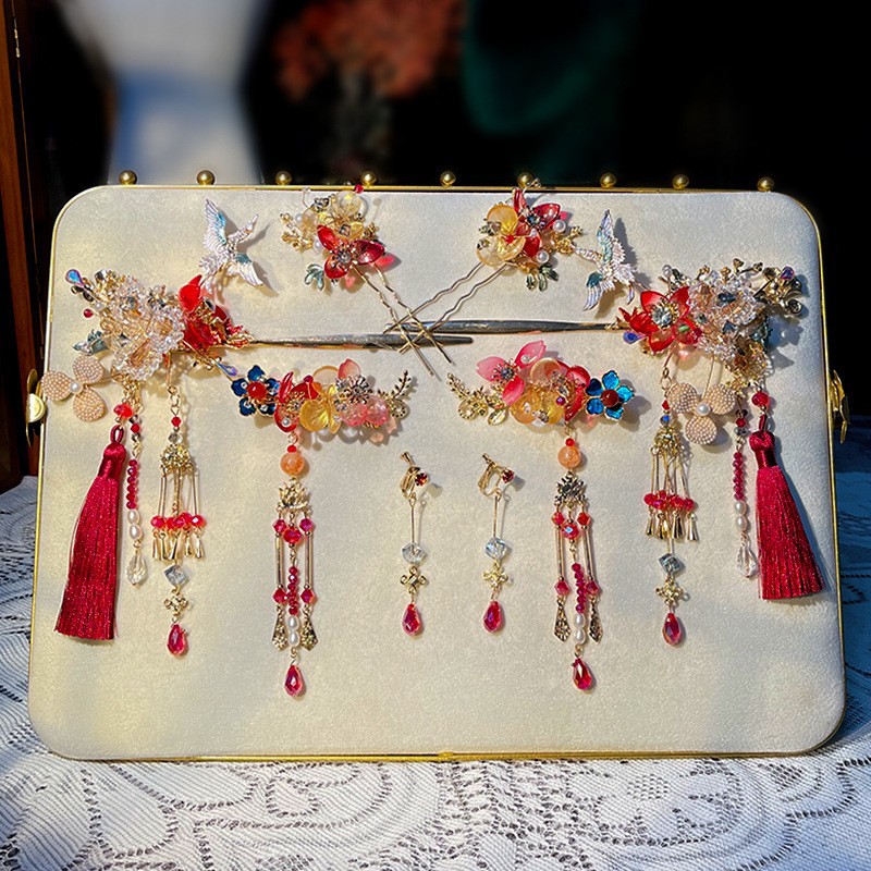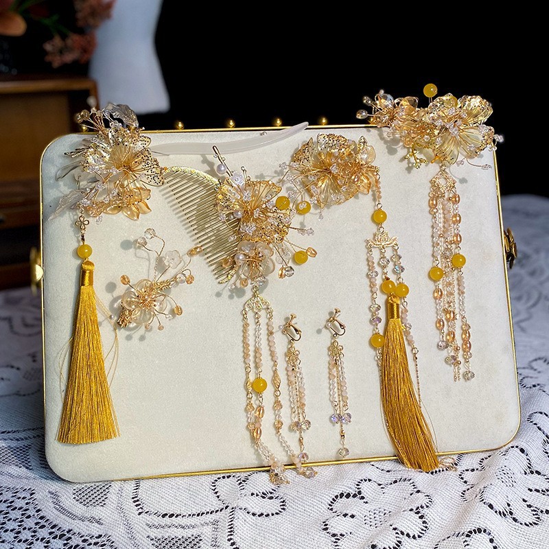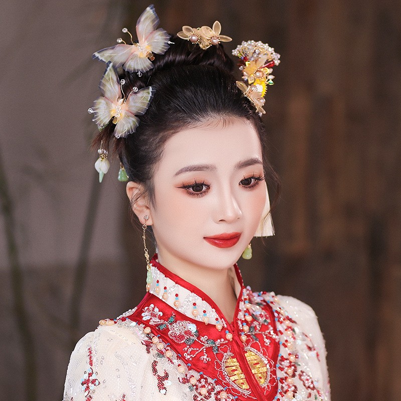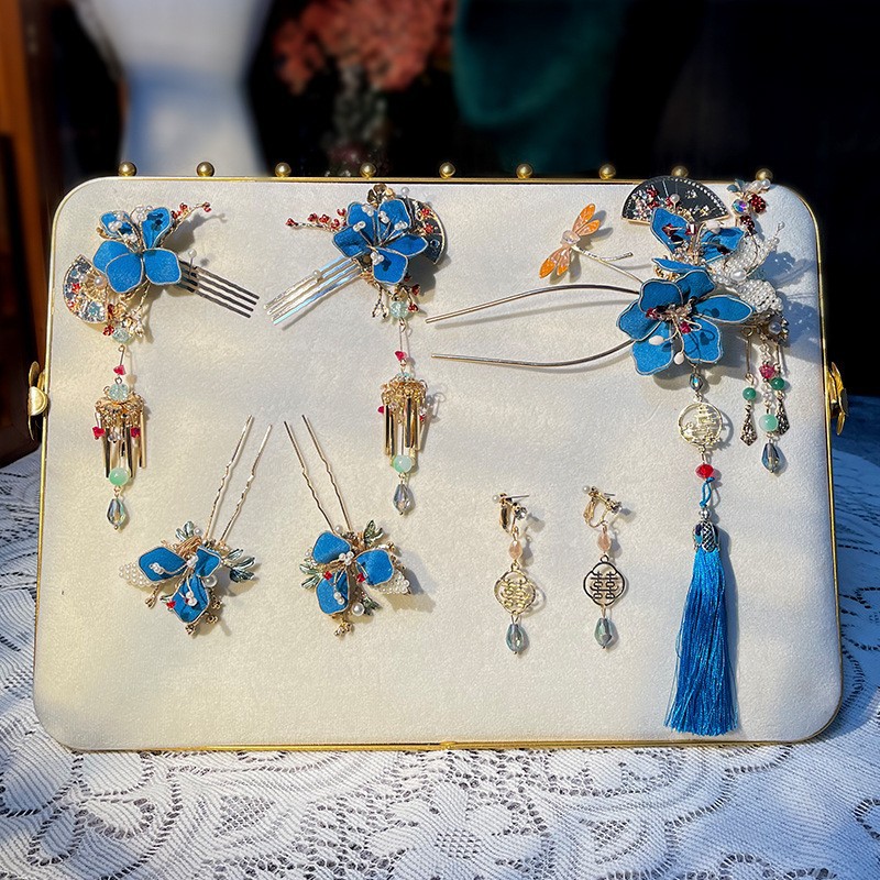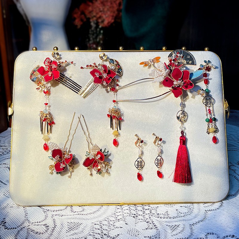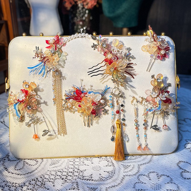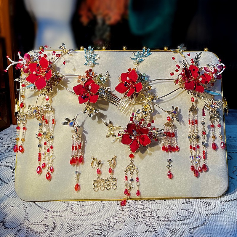 新娘新中式花朵发饰龙凤褂耳夹秀禾服汉服流苏发簪古风头饰配饰品