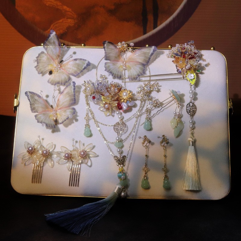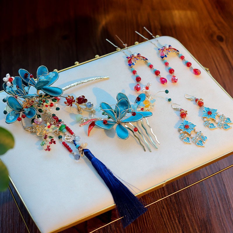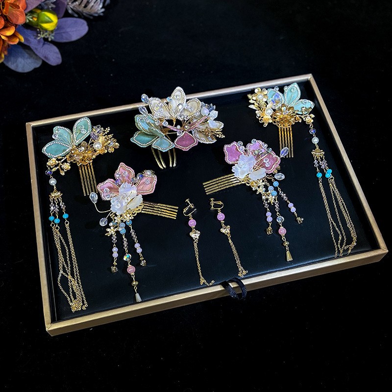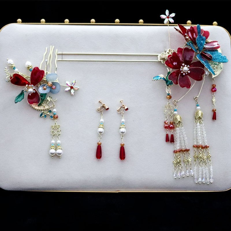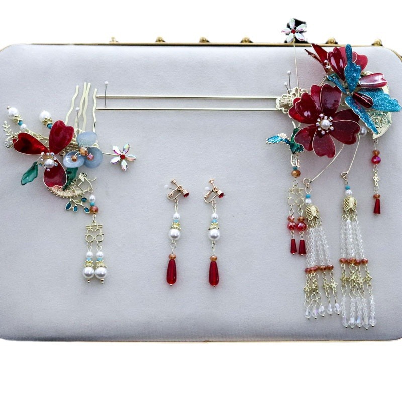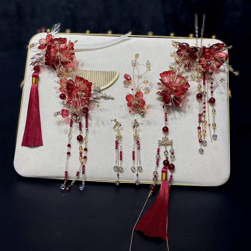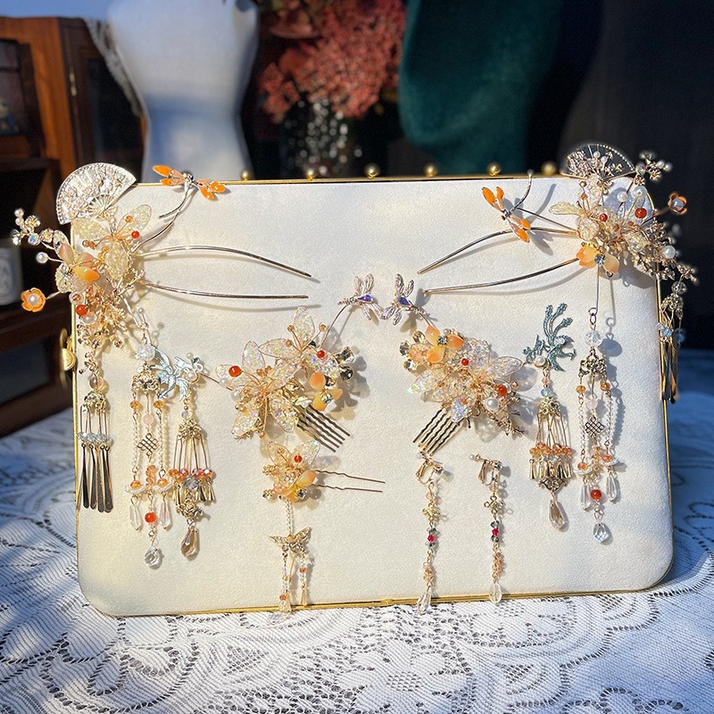 新娘新中式花朵发饰龙凤褂耳夹秀禾服汉服流苏发簪古风头饰配饰品