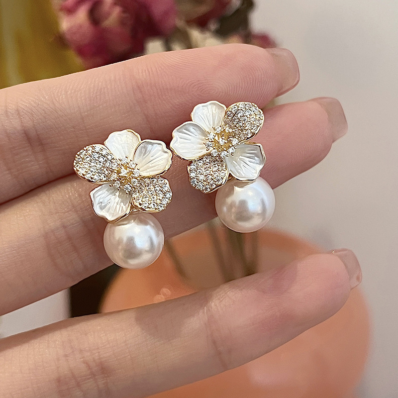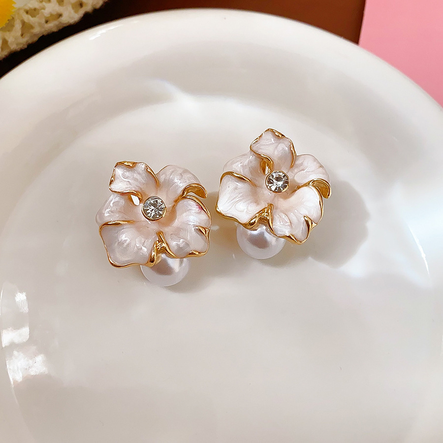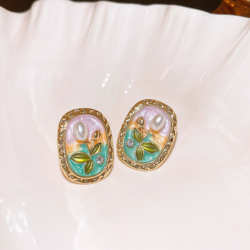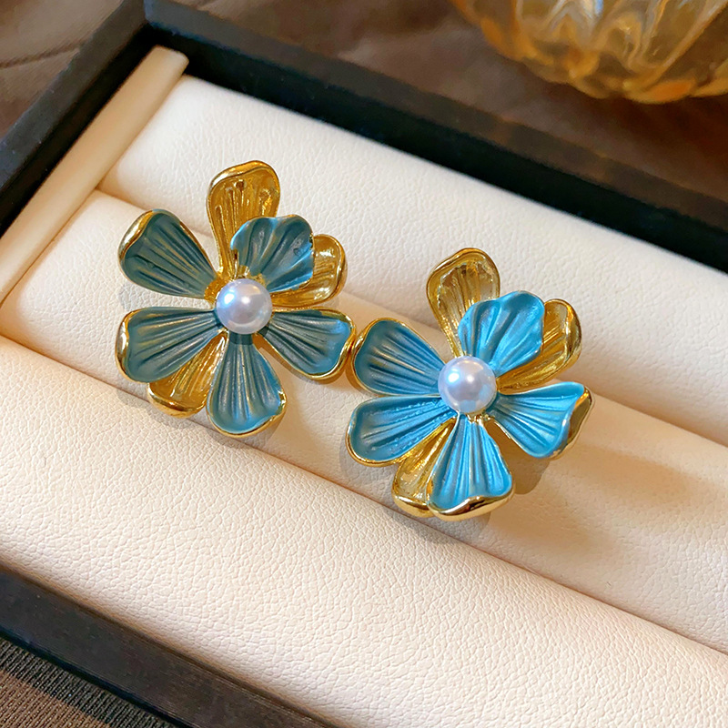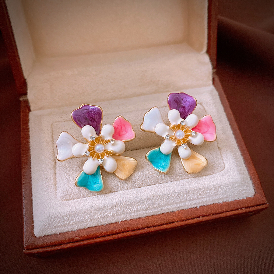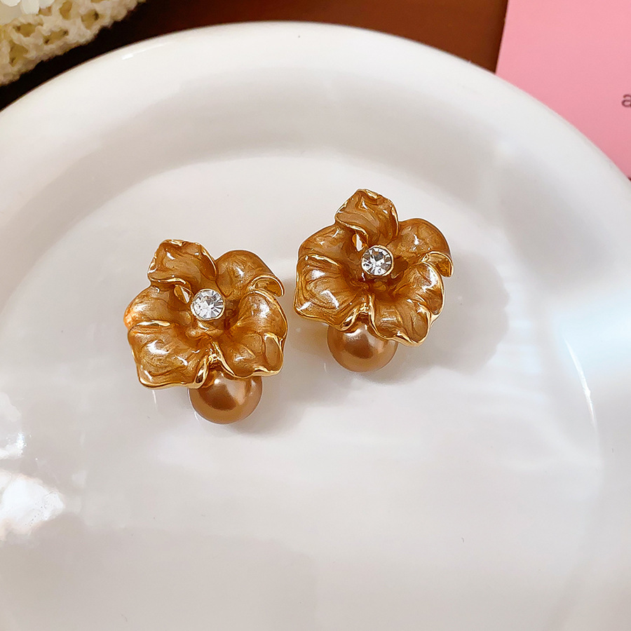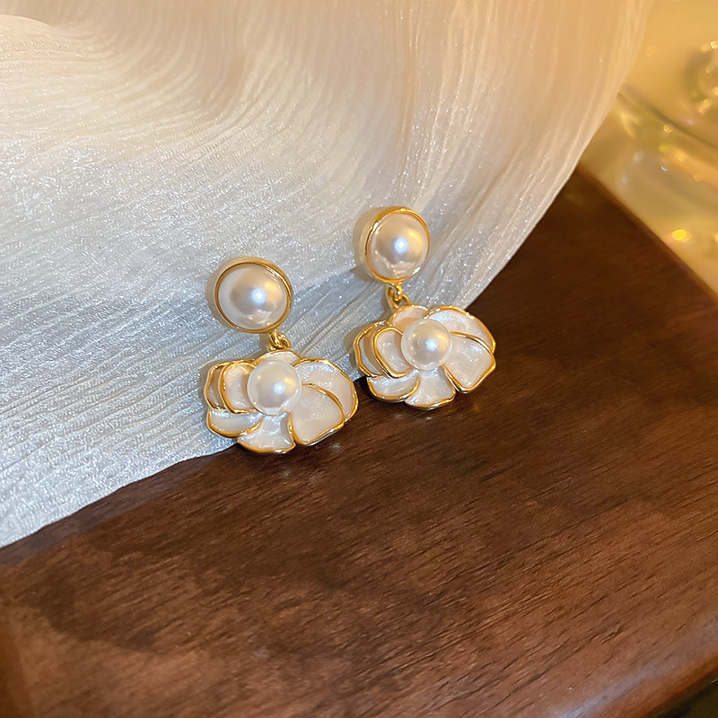 中古vintage滴油花朵珍珠耳环小众高级感耳钉轻奢百搭气质耳饰女