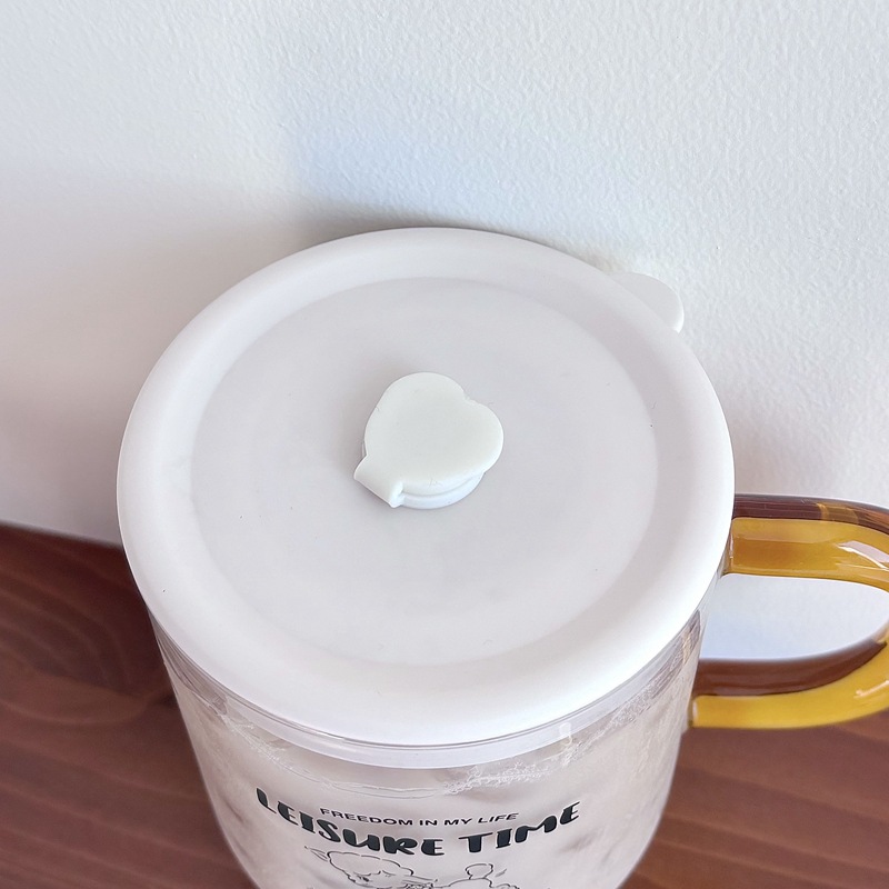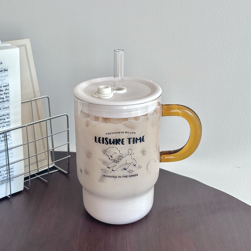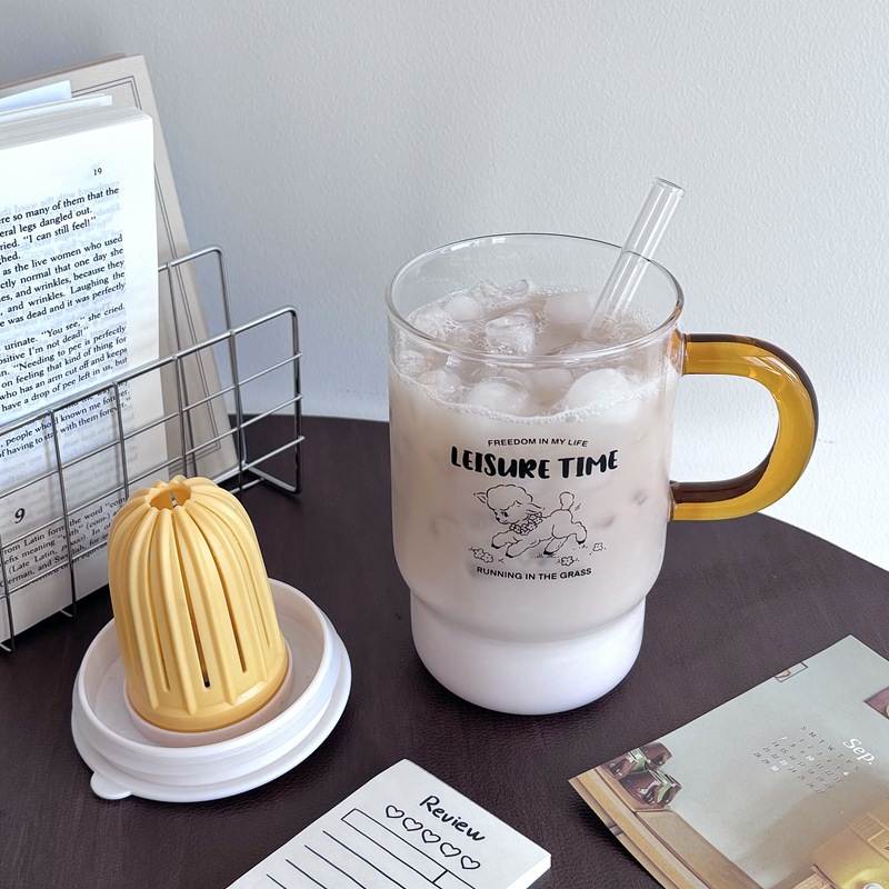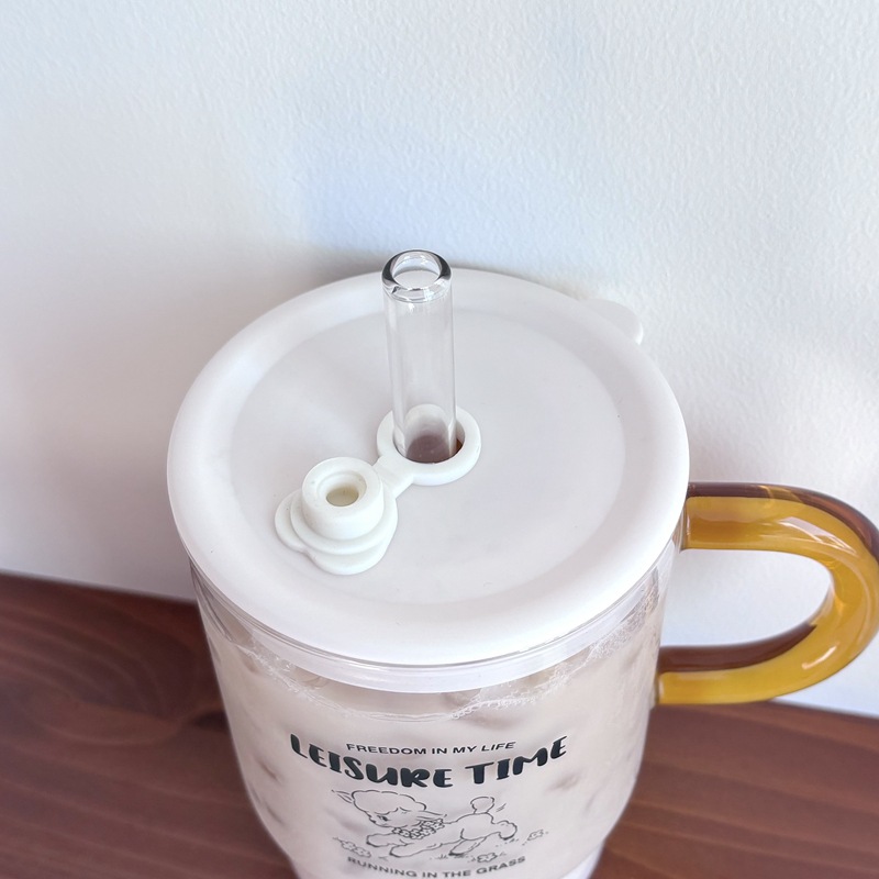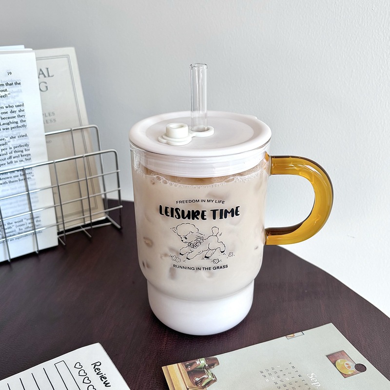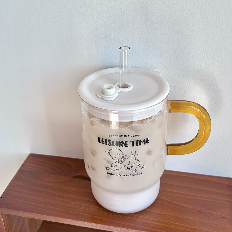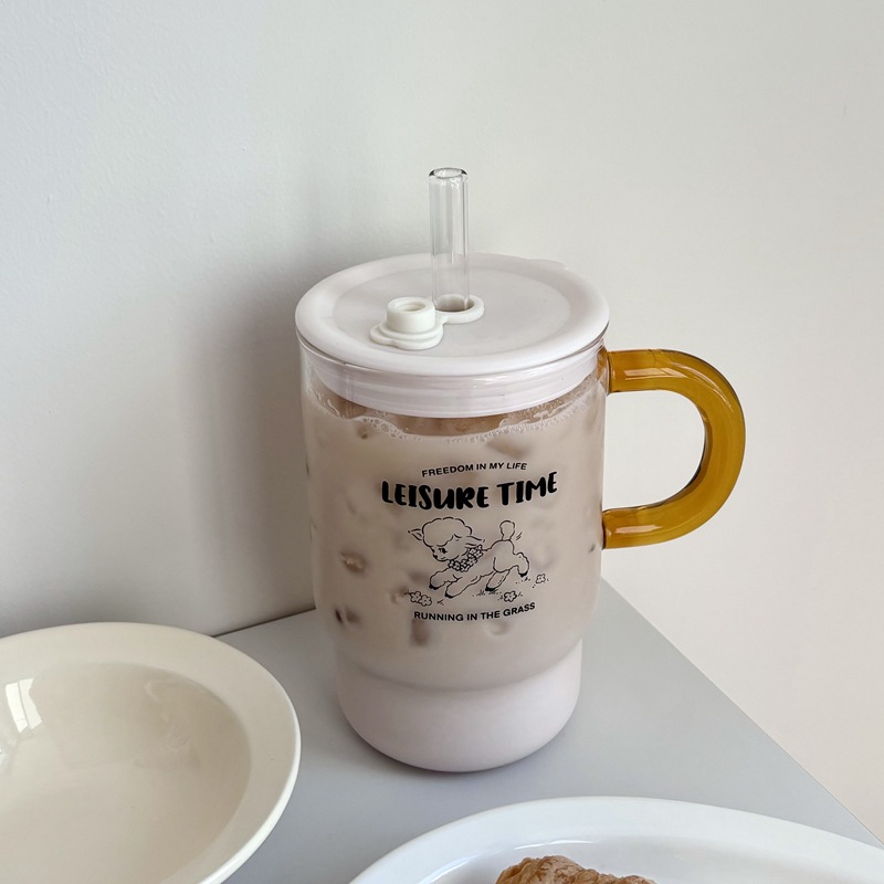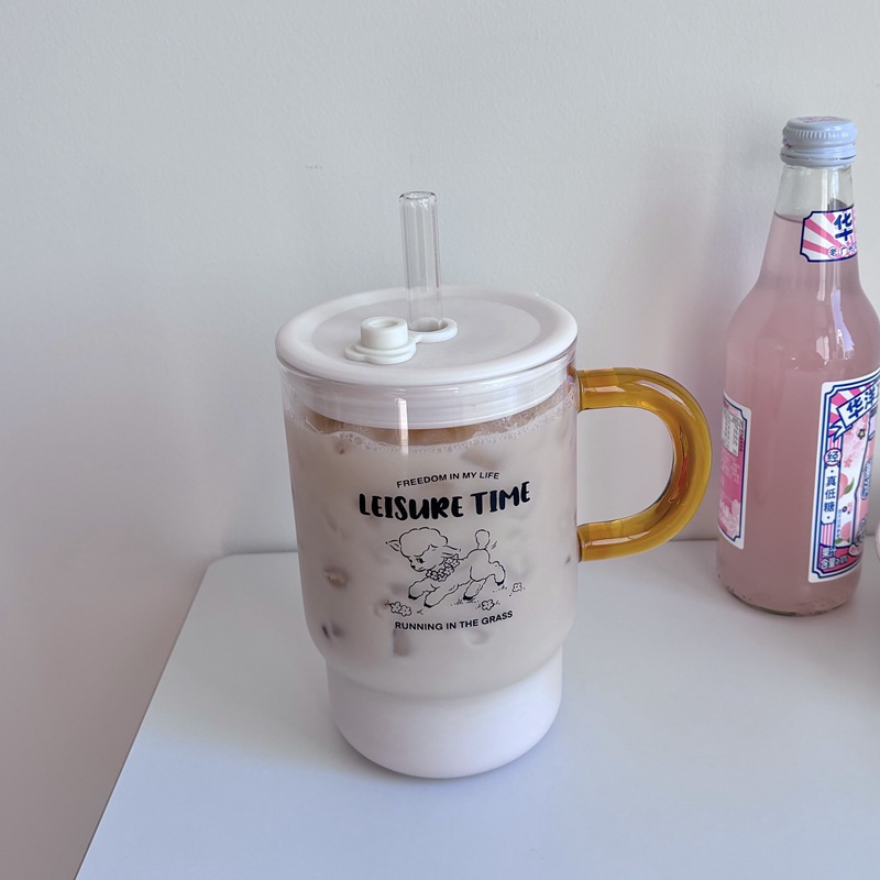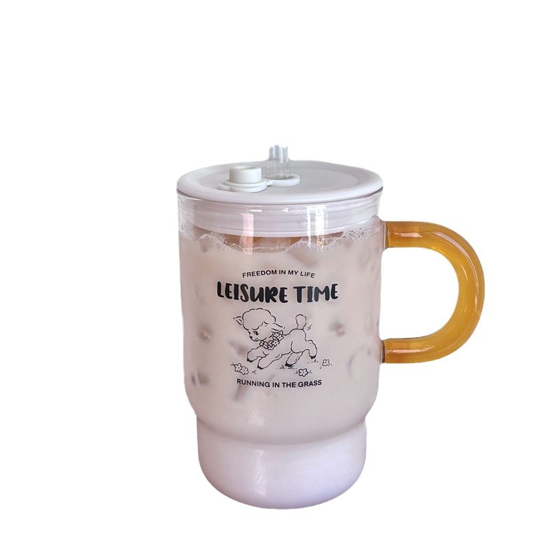 高颜值大容量玻璃带盖吸管杯学生寝室喝水杯子卡通小羊玻璃杯奶茶