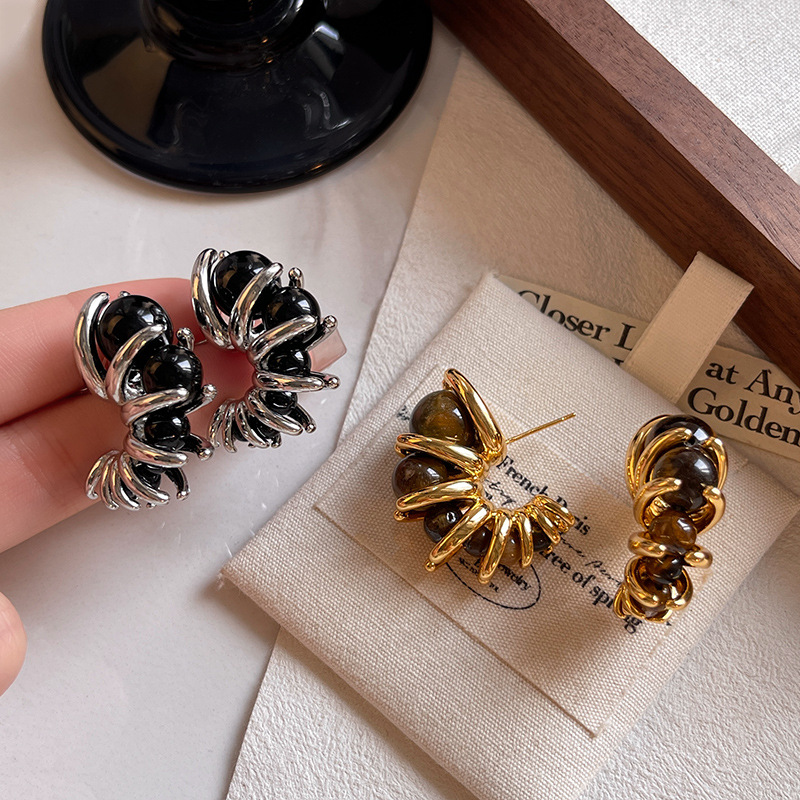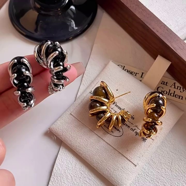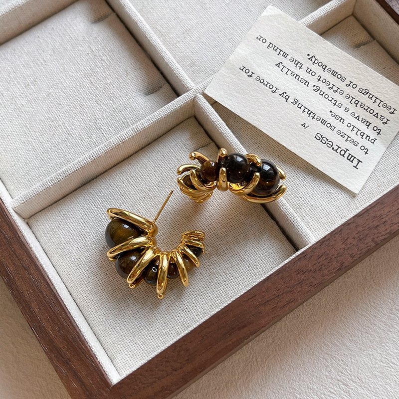 饰品耳环S925纯银针几何设计感耳钉耳饰真金电镀天然虎眼石耳环女