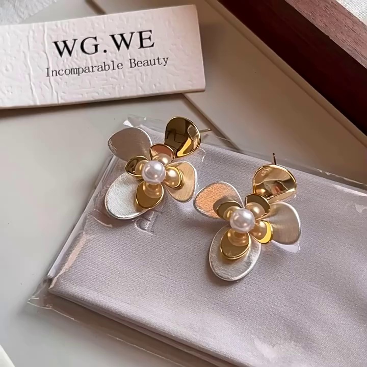 S925纯银针施家澳白珍珠耳钉耳饰品真金电镀撞色不规则花朵耳环女