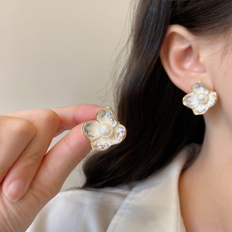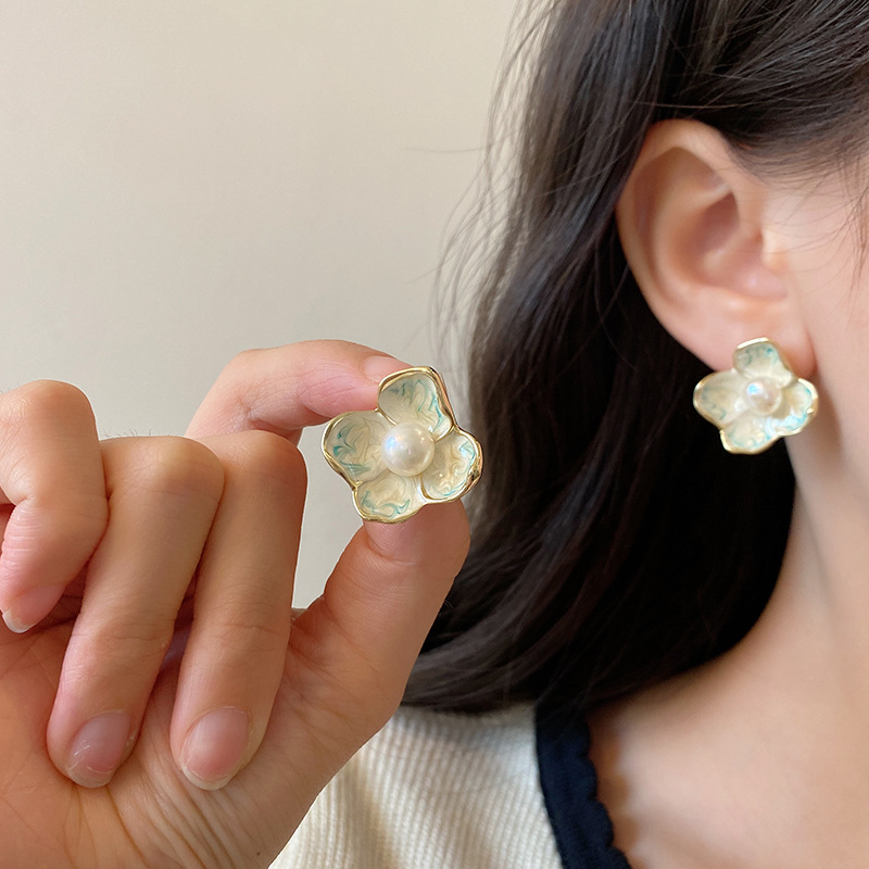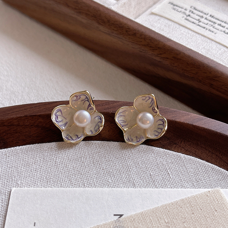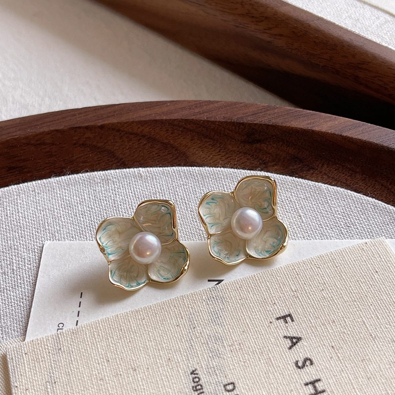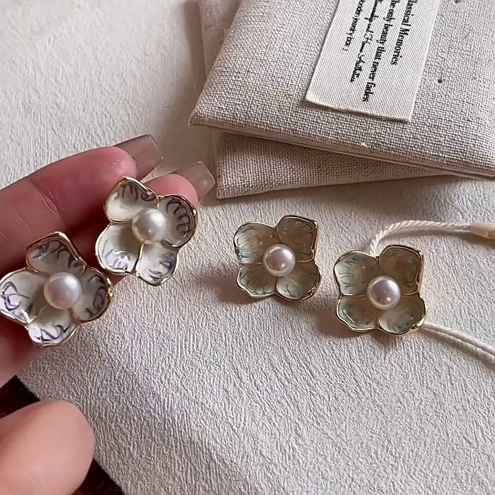 饰品小众复古真金电镀耳环耳饰品S925纯银针珐琅滴釉花朵珍珠耳钉