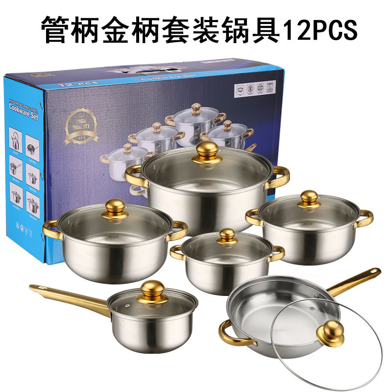 跨境出口不锈钢水壶套锅不粘锅12件套镀金把手stainless pots套装