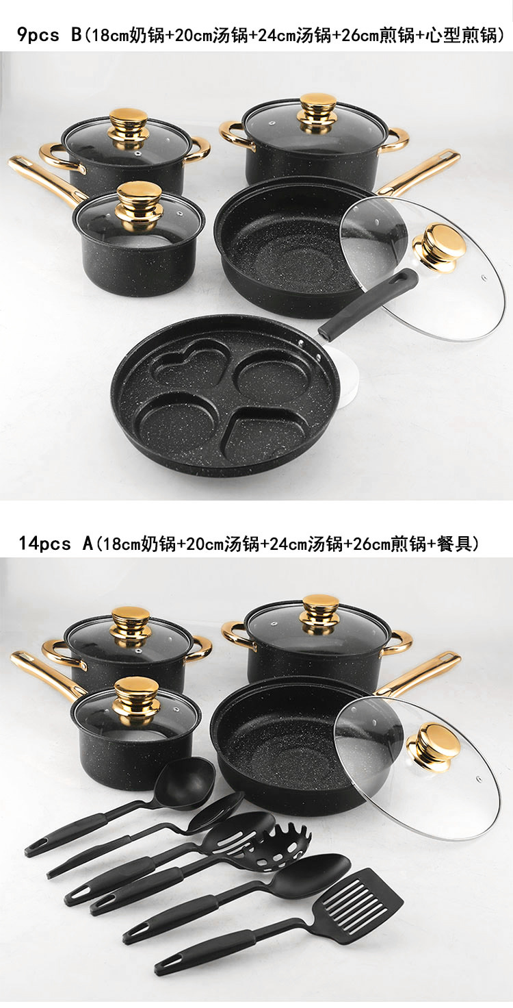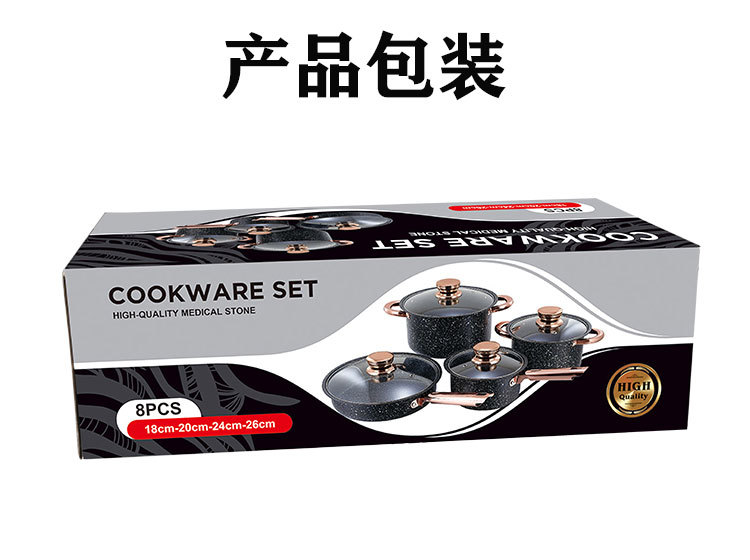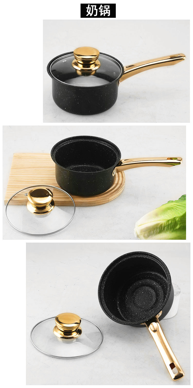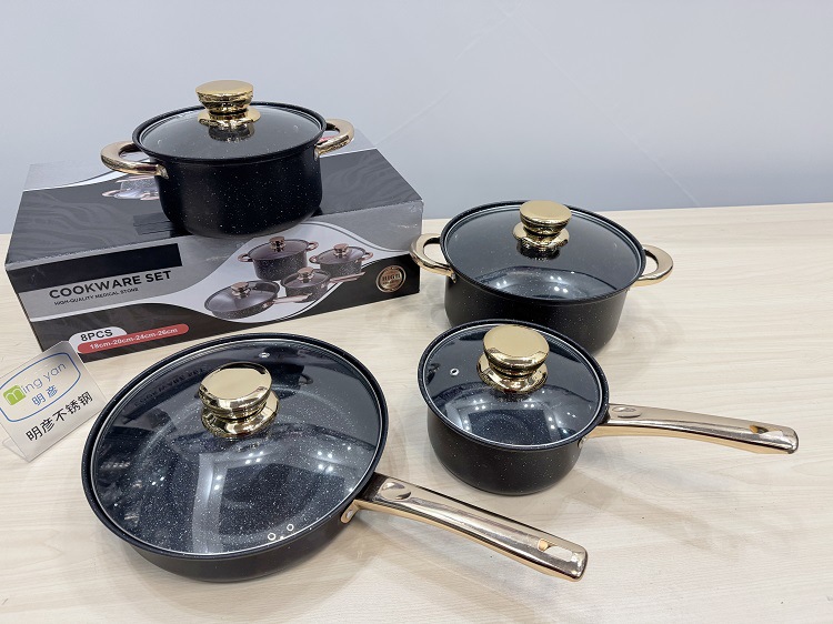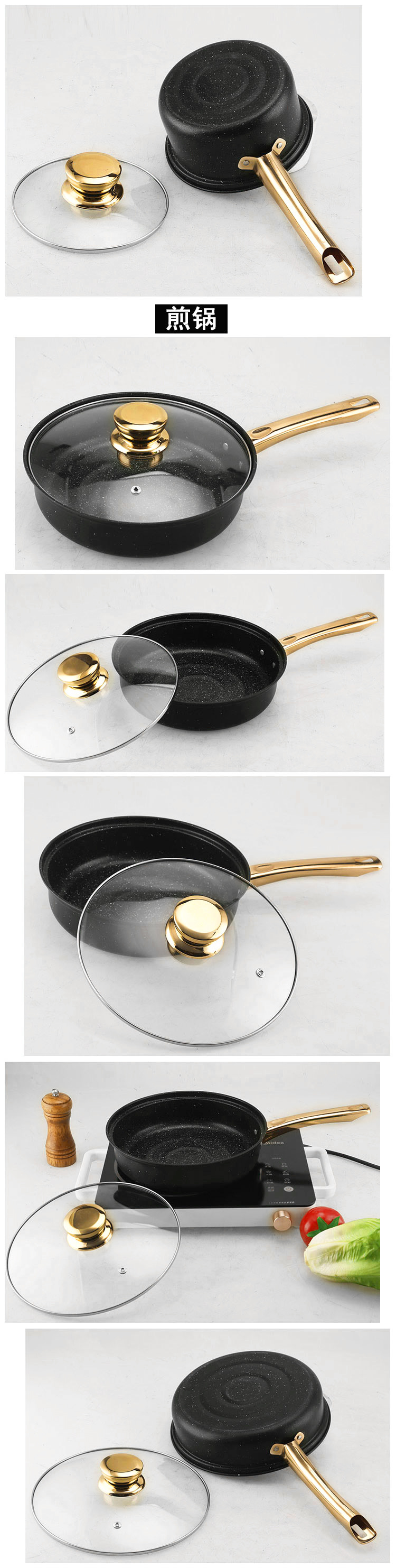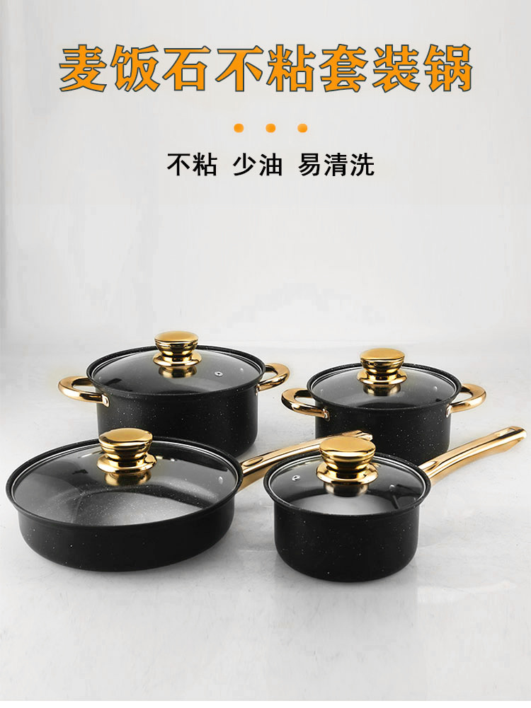 跨境麦饭石锅具套装批发8pcs金色手柄不粘锅少油烟锅具平底锅pots