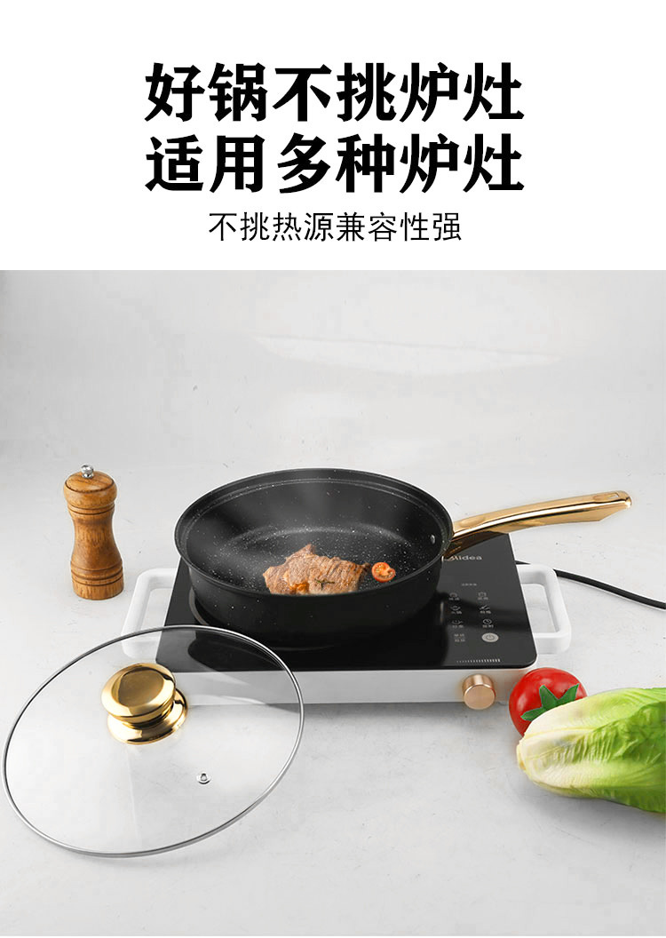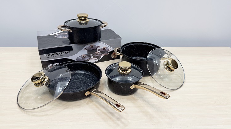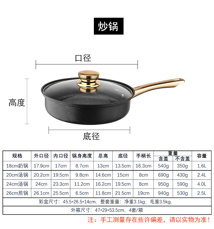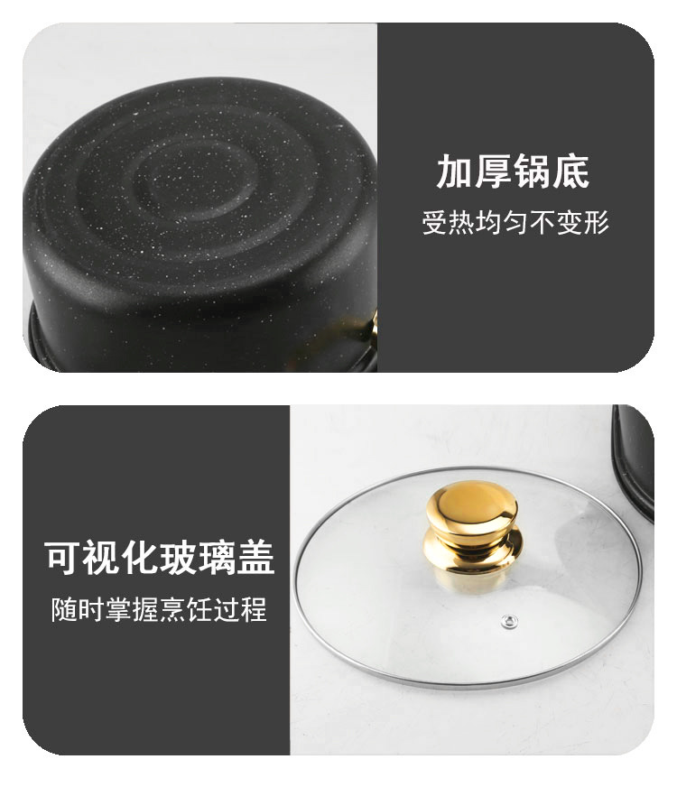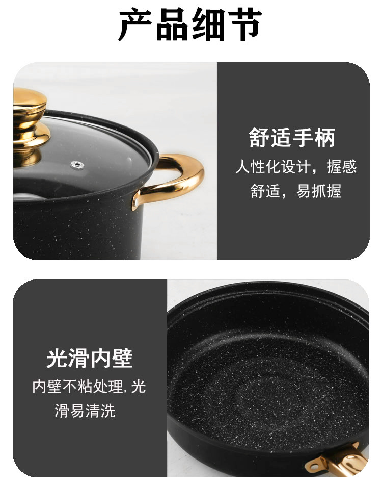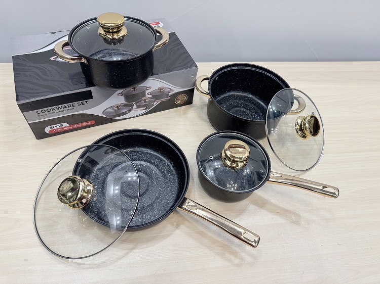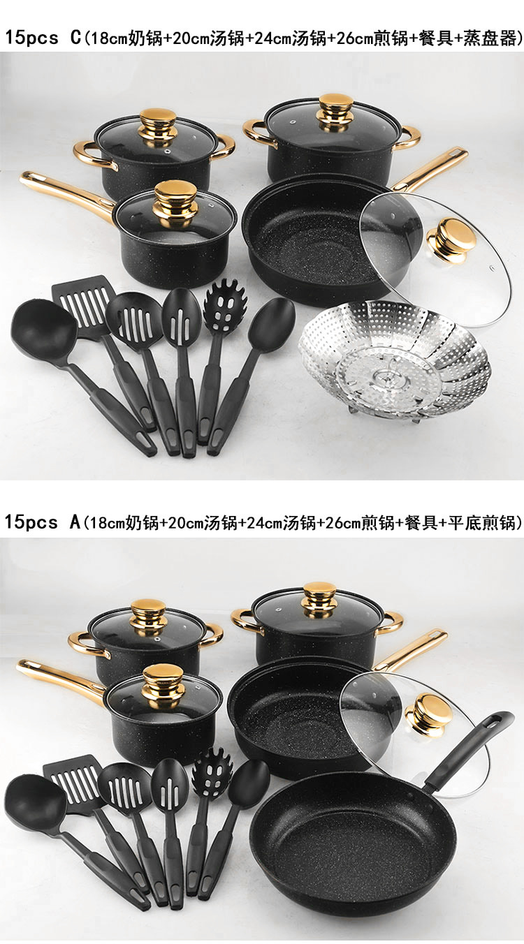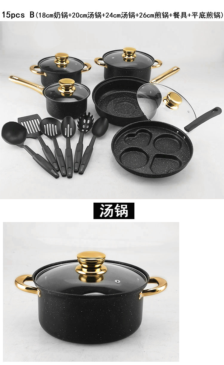 跨境麦饭石锅具套装批发8pcs金色手柄不粘锅少油烟锅具平底锅pots