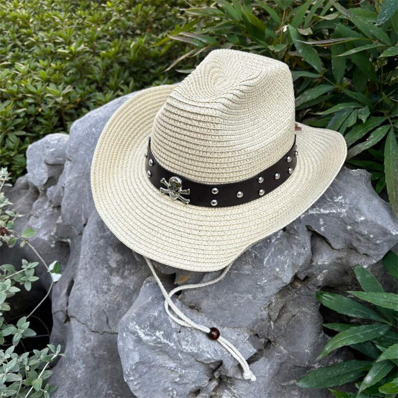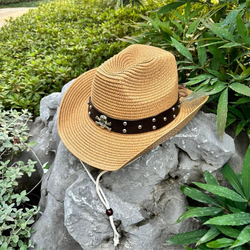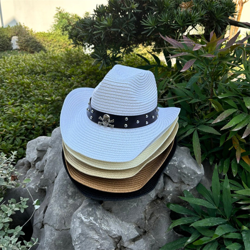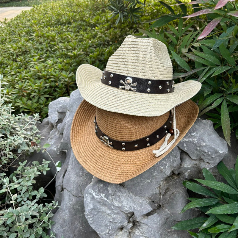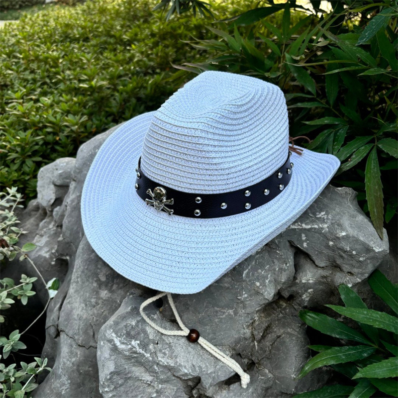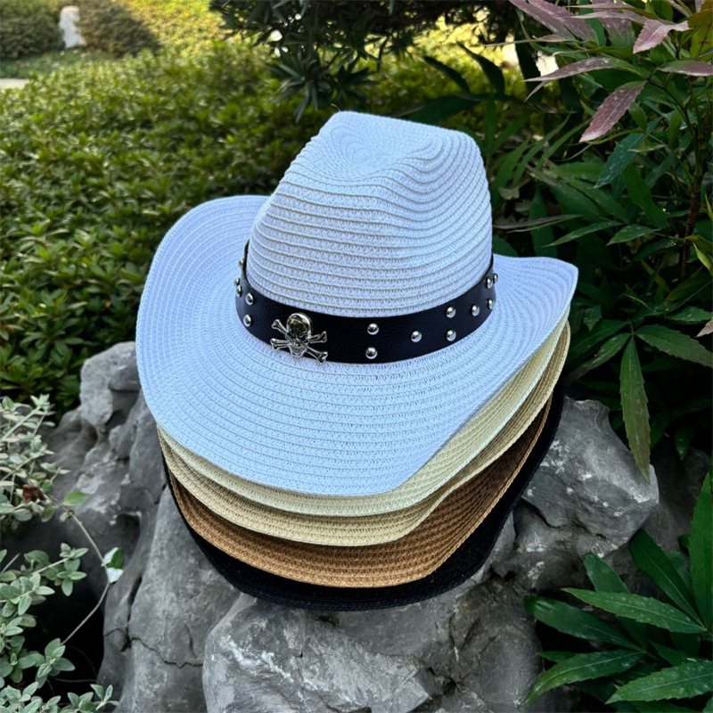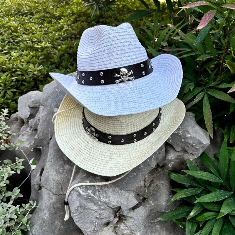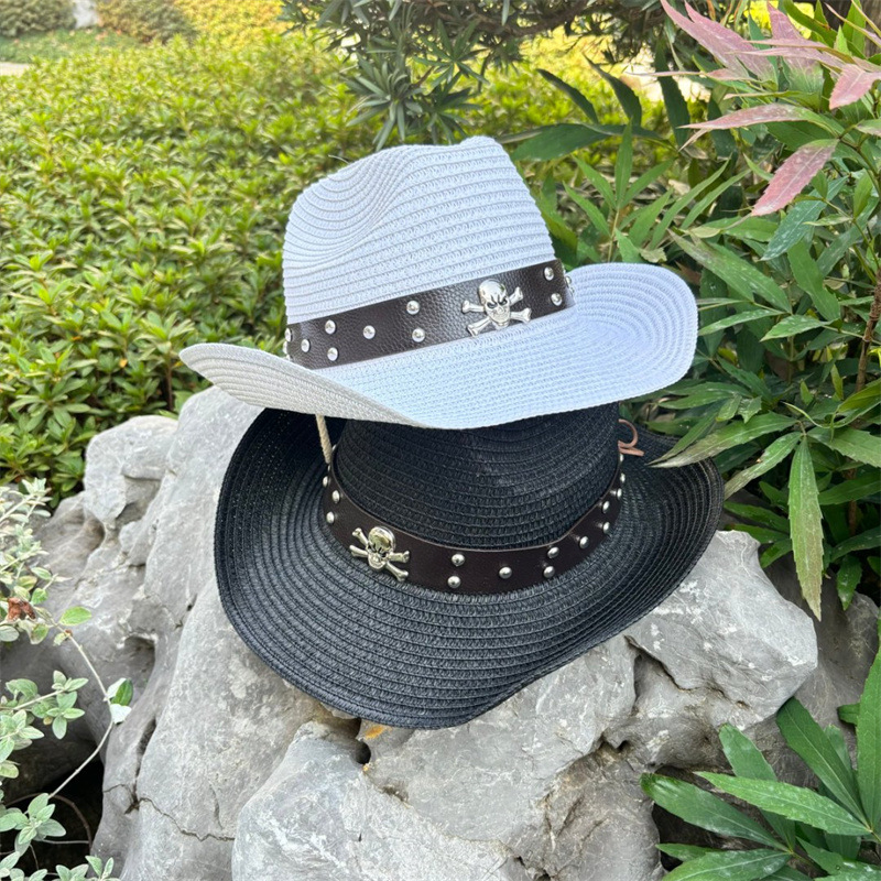 欧美骷髅皮带牛仔草帽外贸女男夏季遮阳帽卷檐西部牛仔草帽太阳帽
