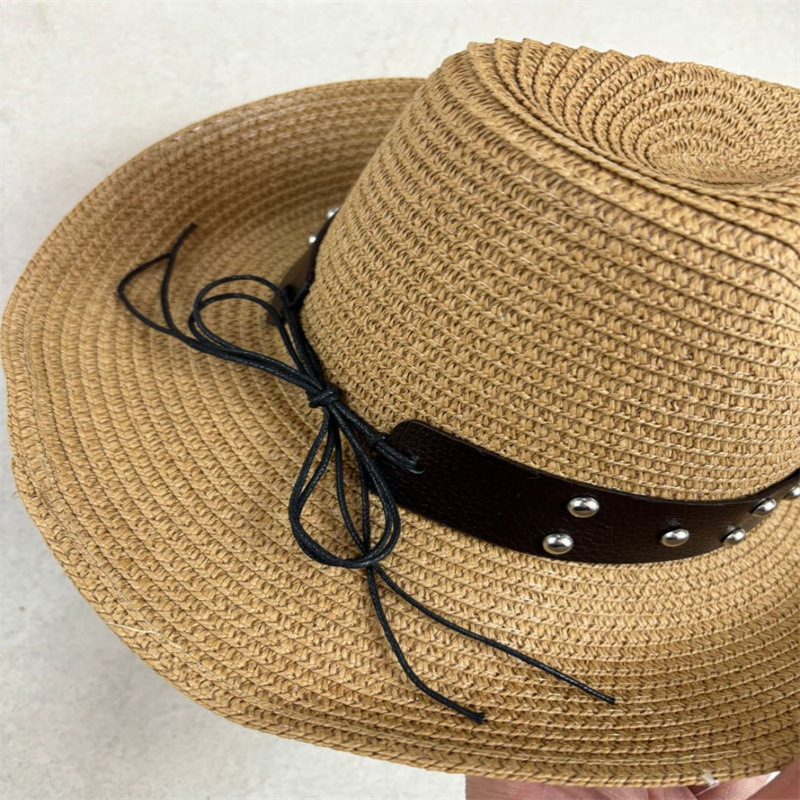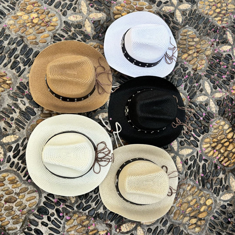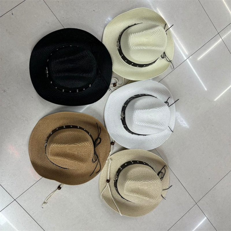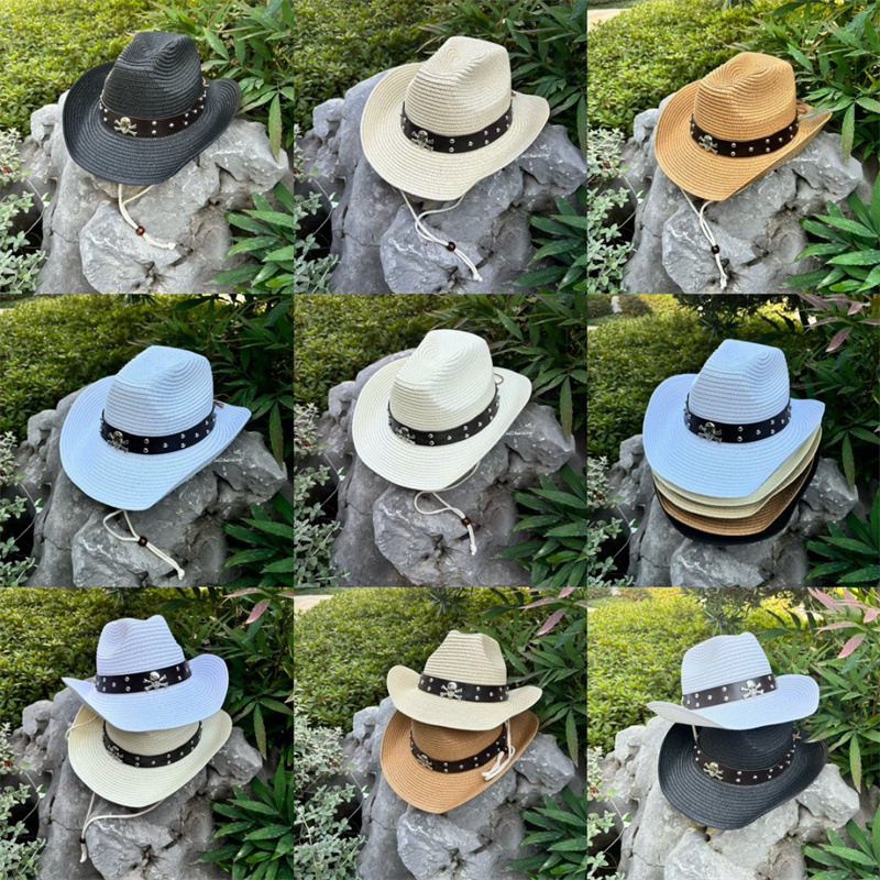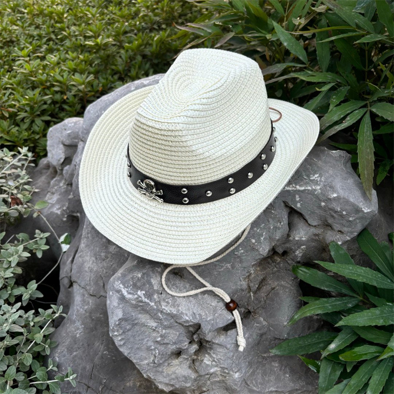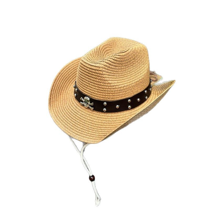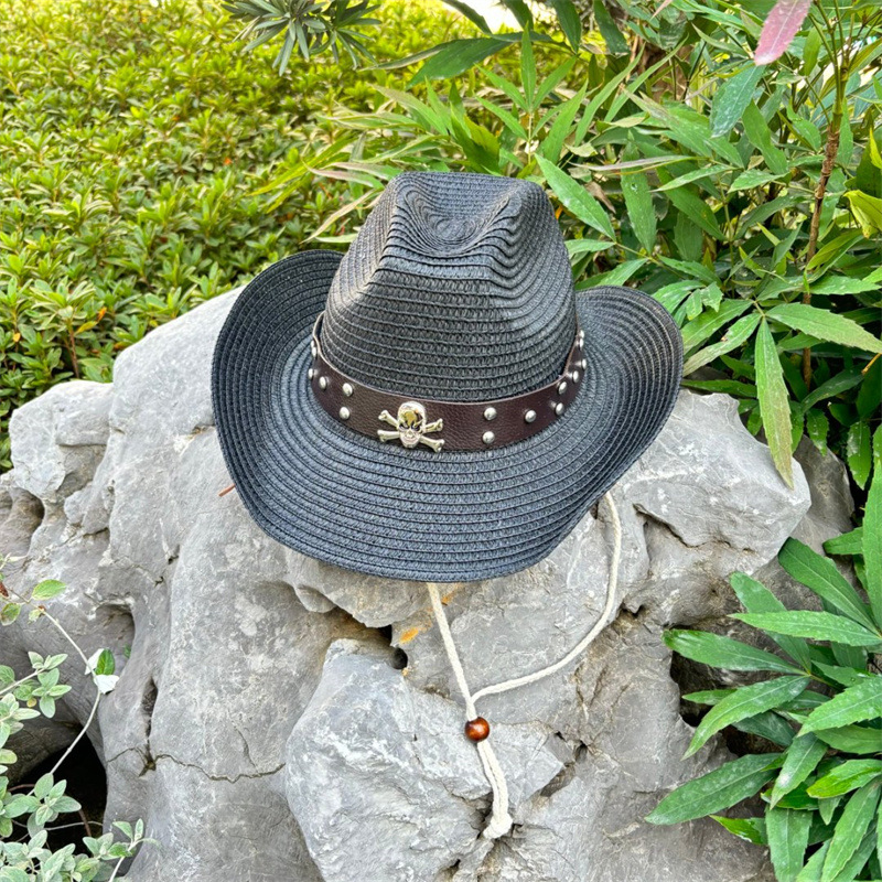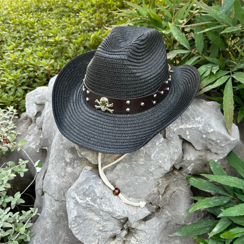 欧美骷髅皮带牛仔草帽外贸女男夏季遮阳帽卷檐西部牛仔草帽太阳帽