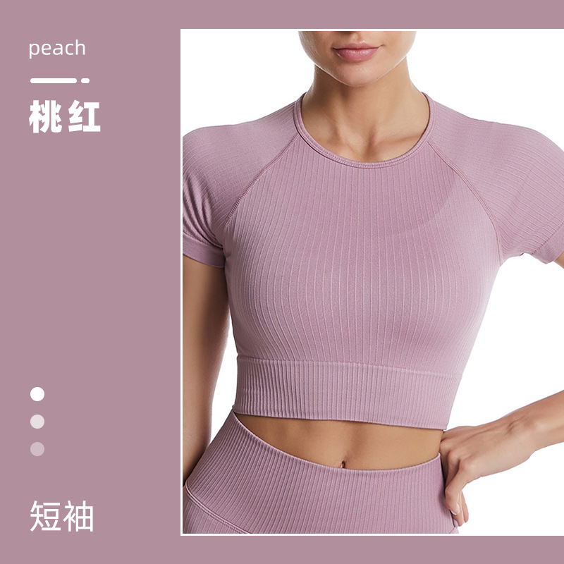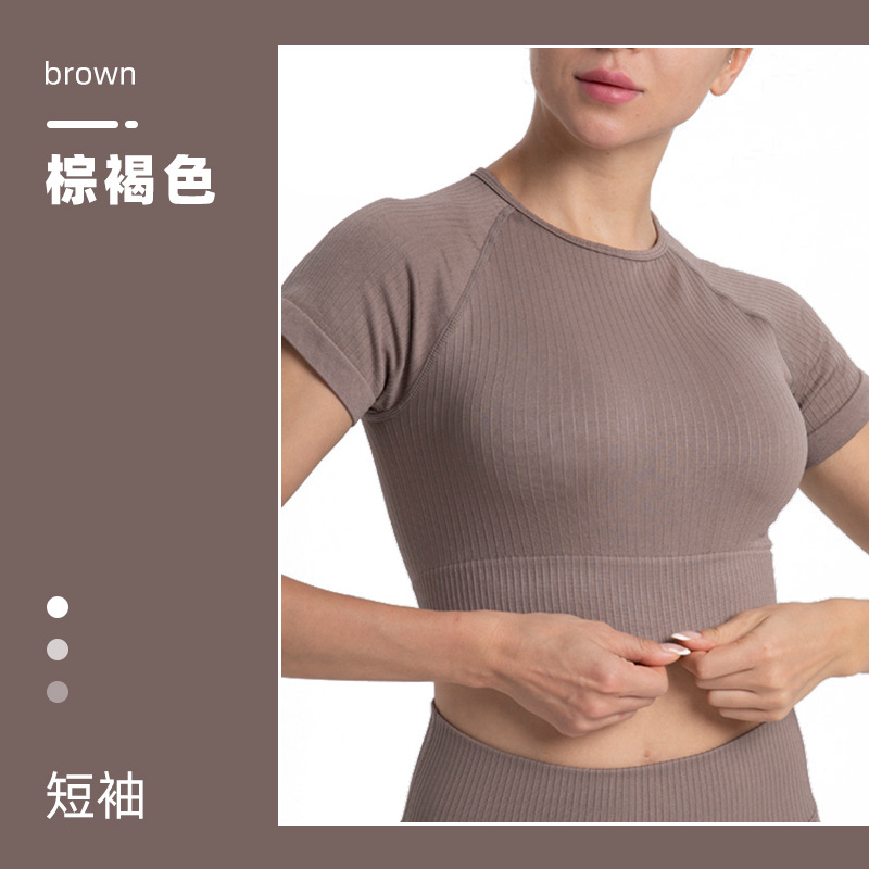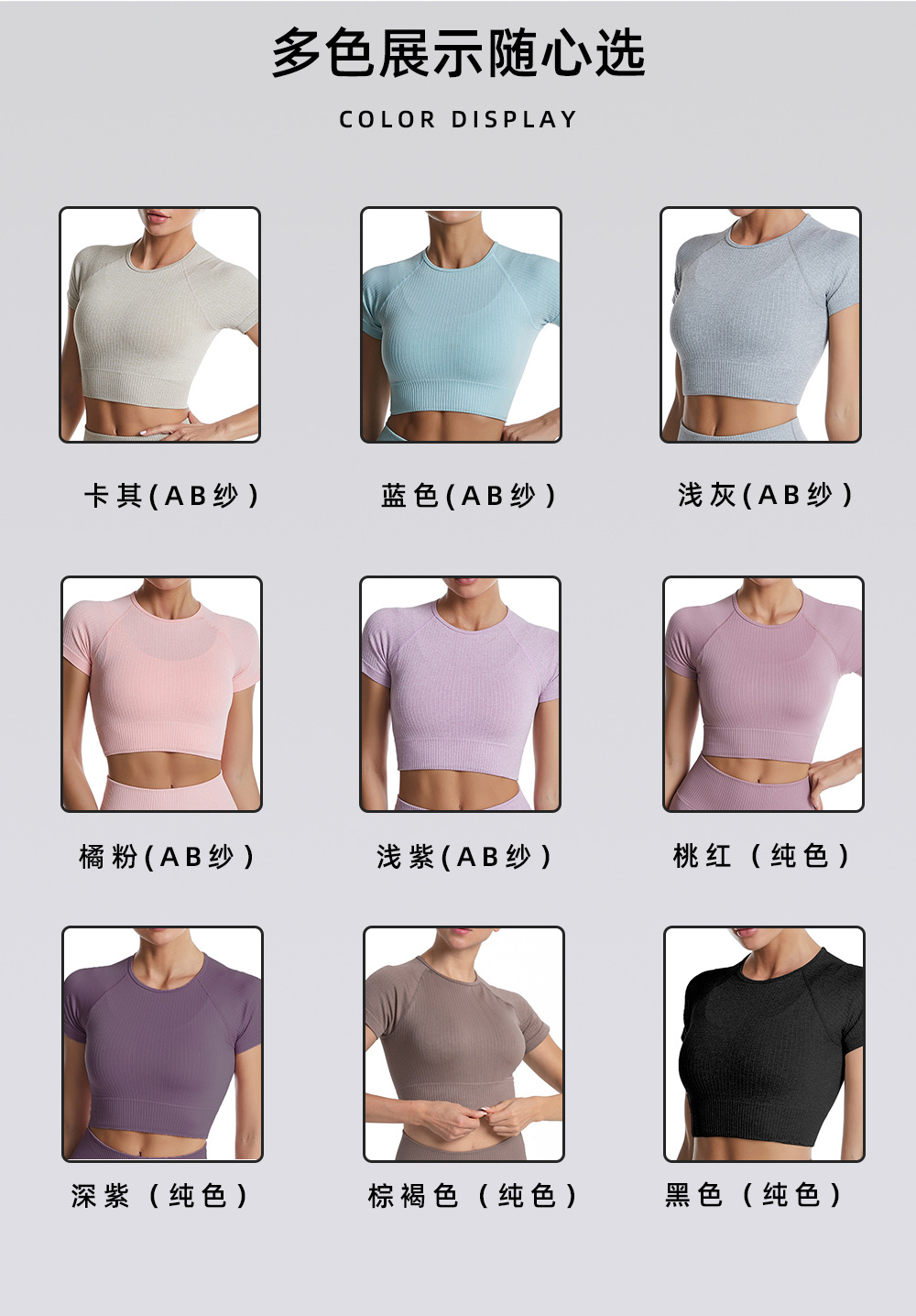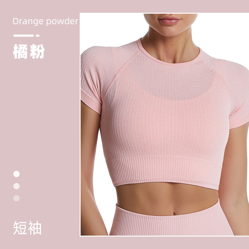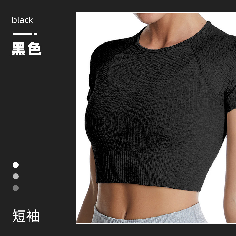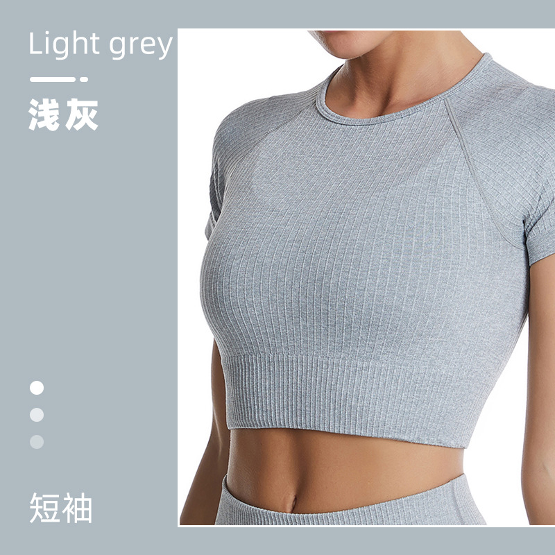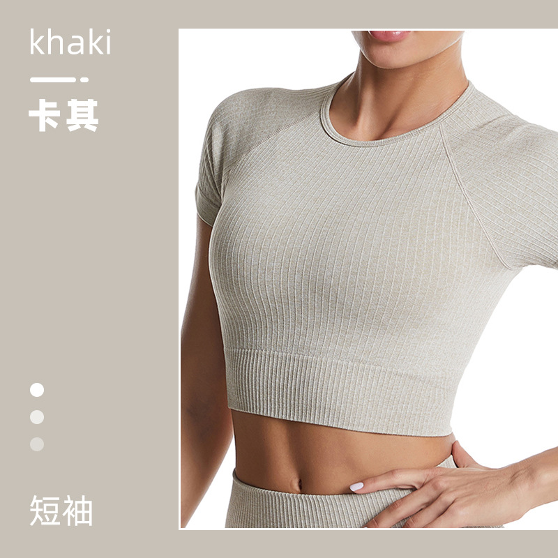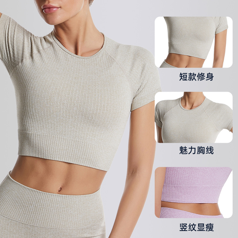 跨境螺纹瑜伽服女运动上衣夏季紧身速干衣女跑步健身短袖套装批发