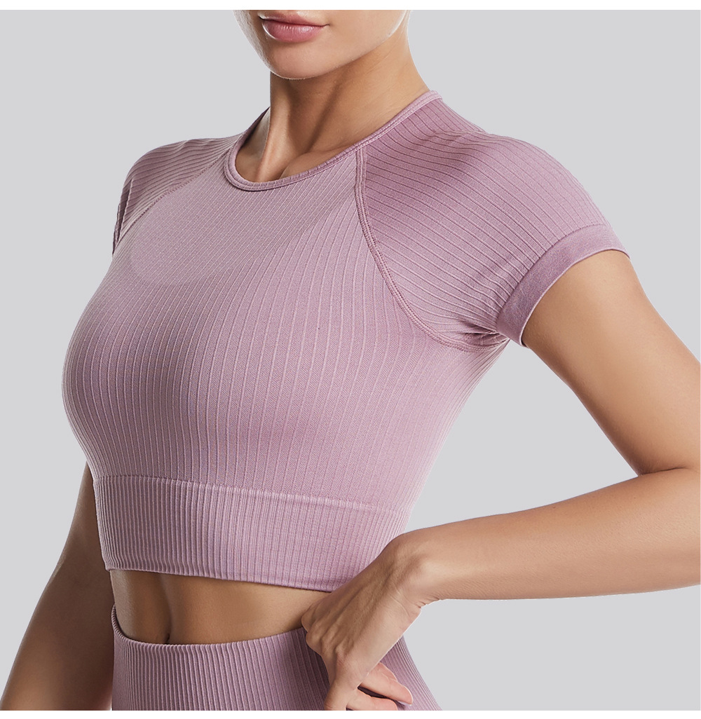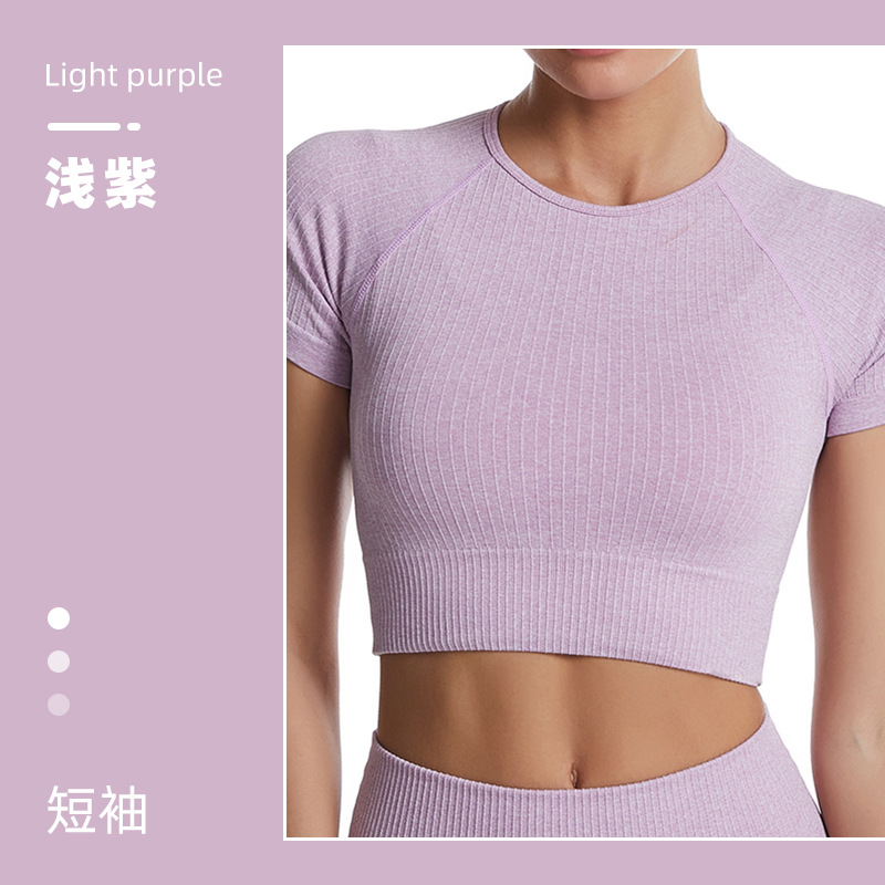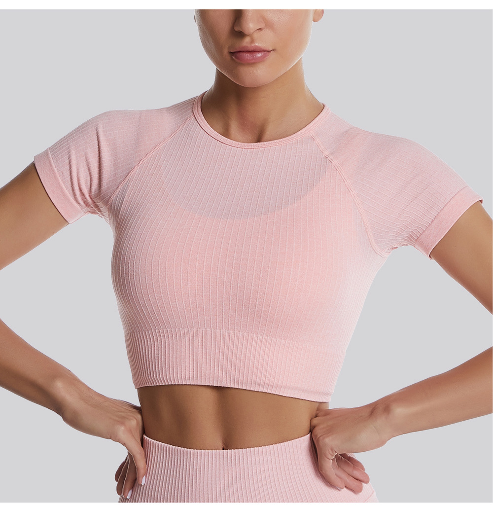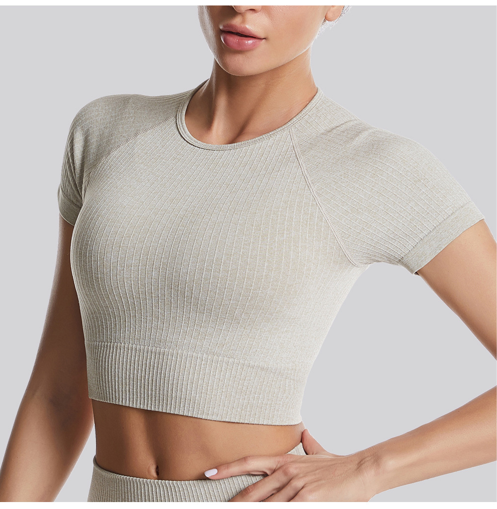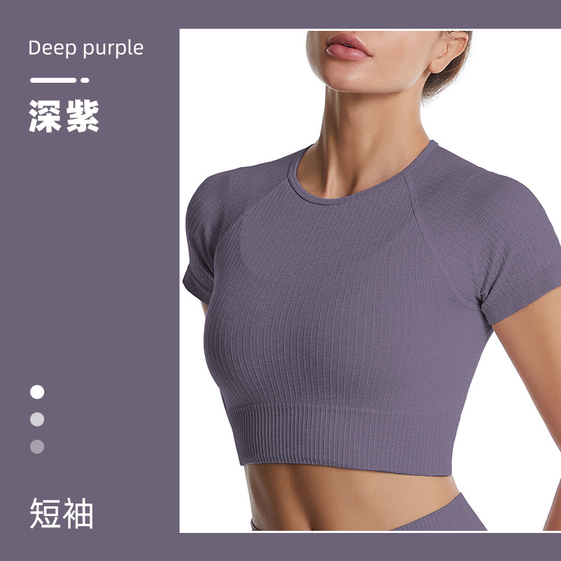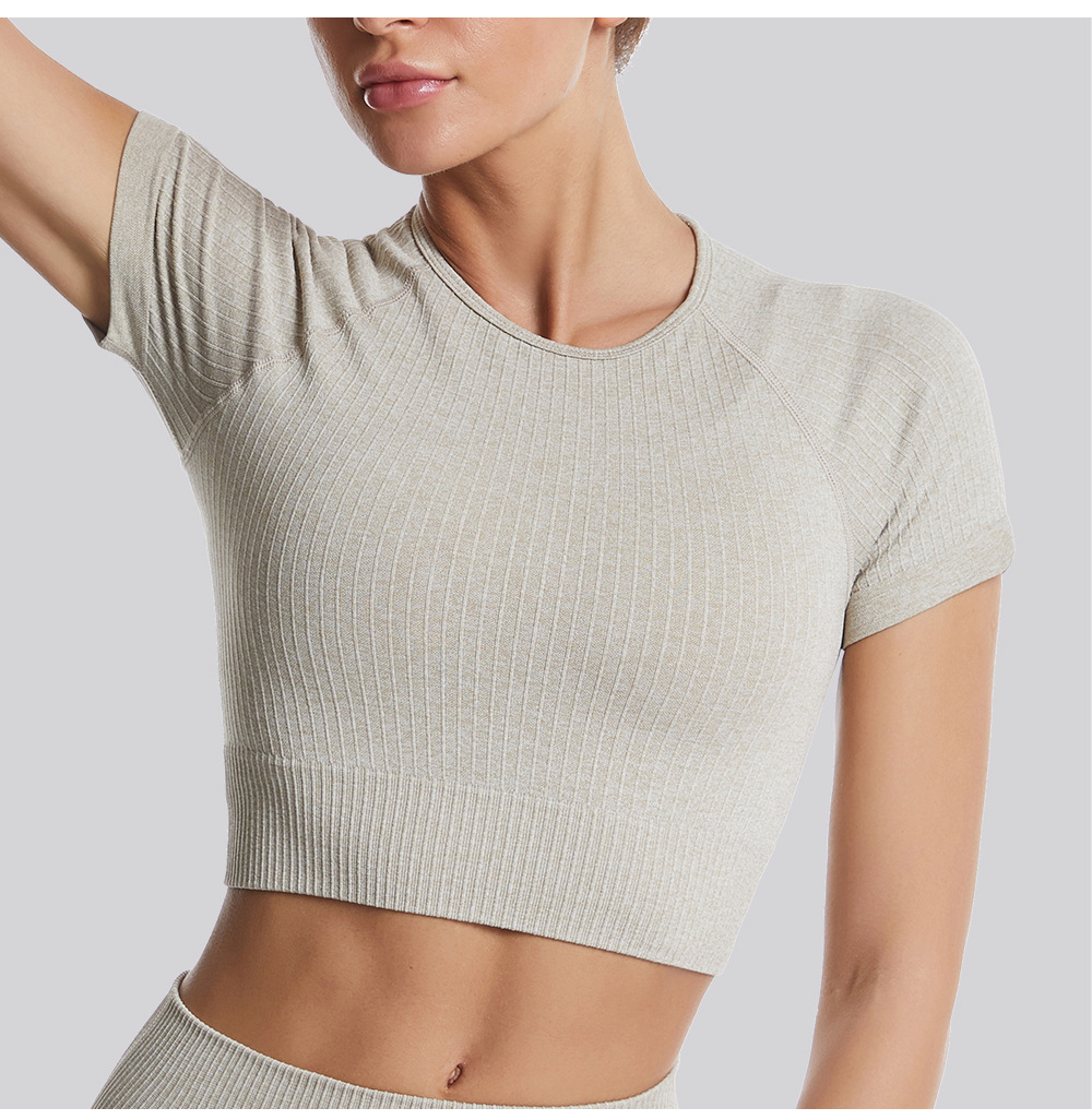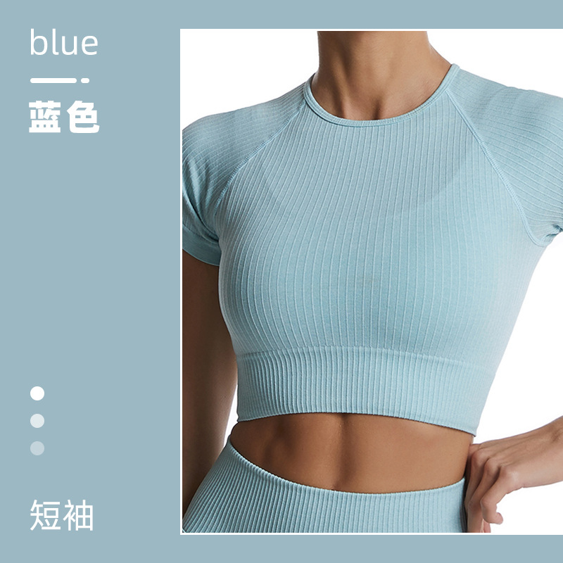 跨境螺纹瑜伽服女运动上衣夏季紧身速干衣女跑步健身短袖套装批发