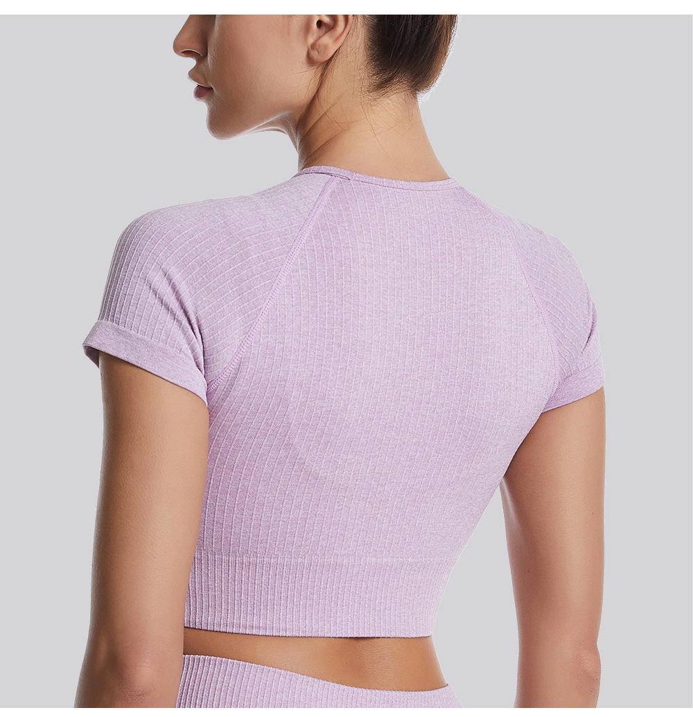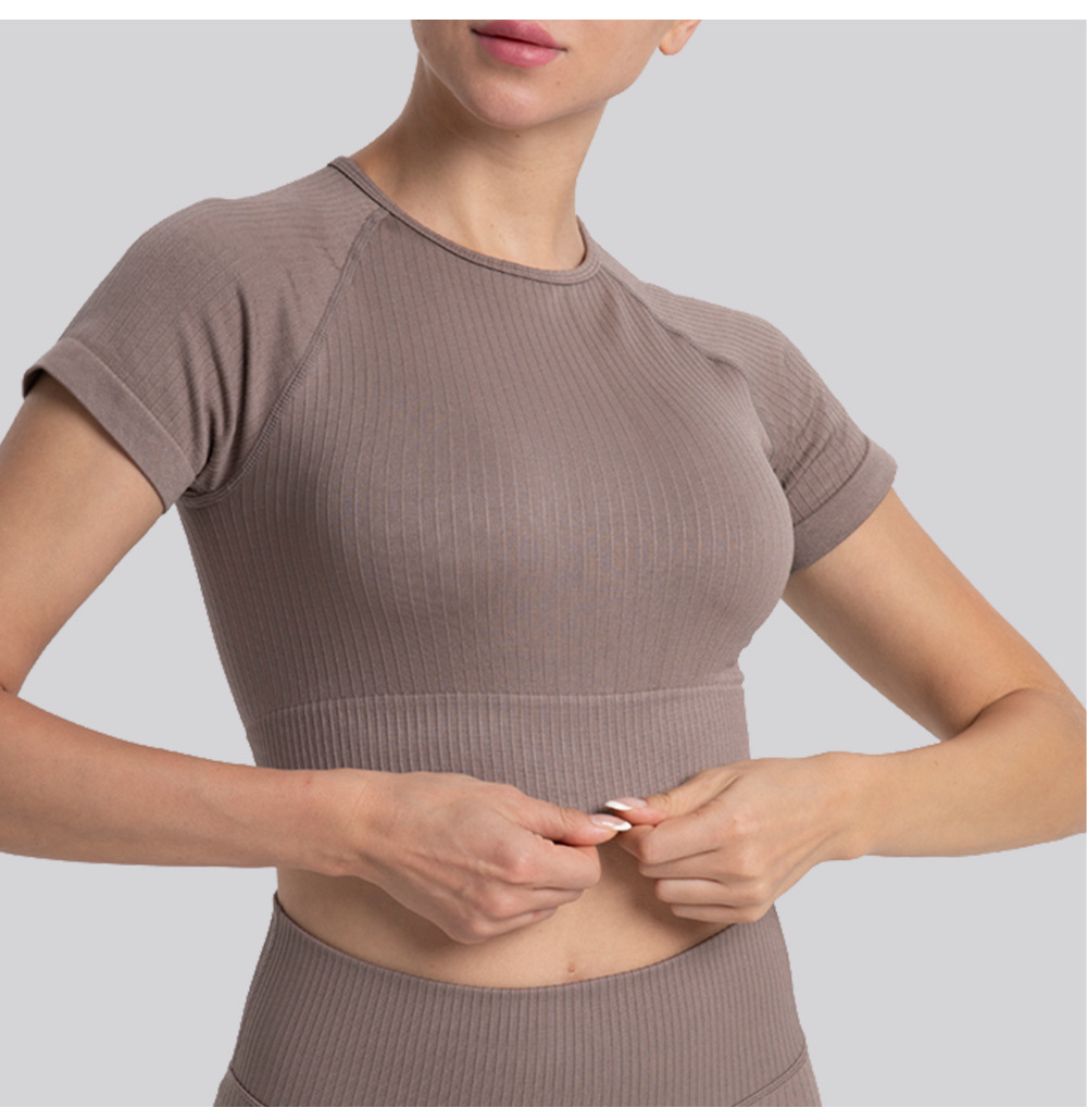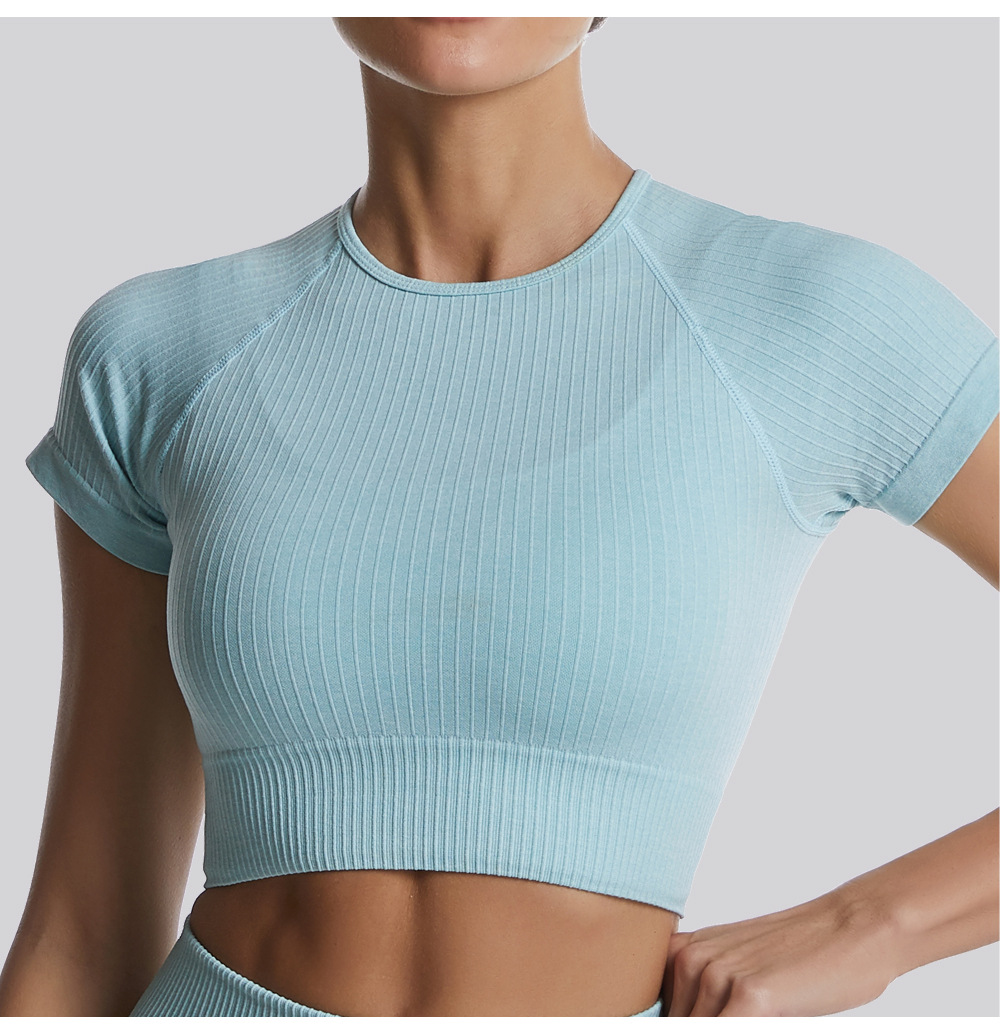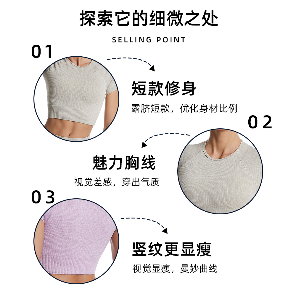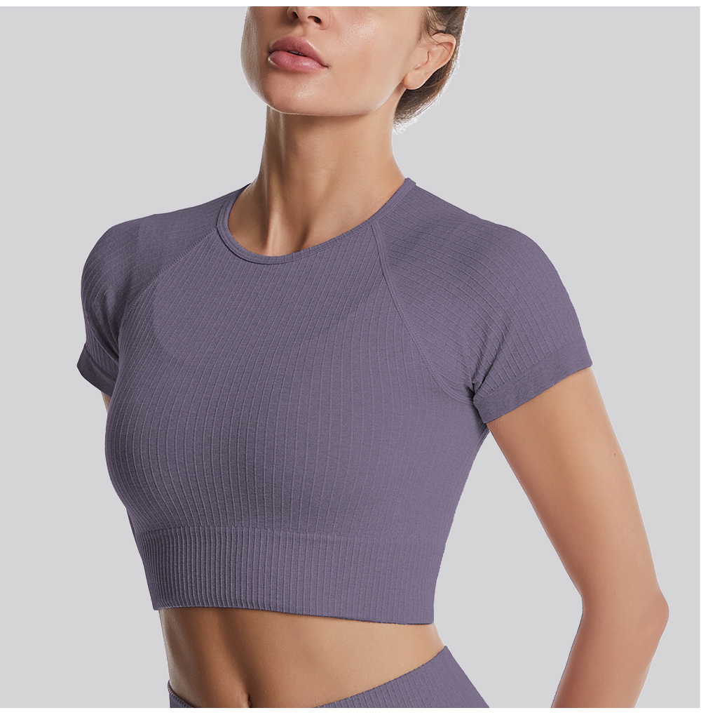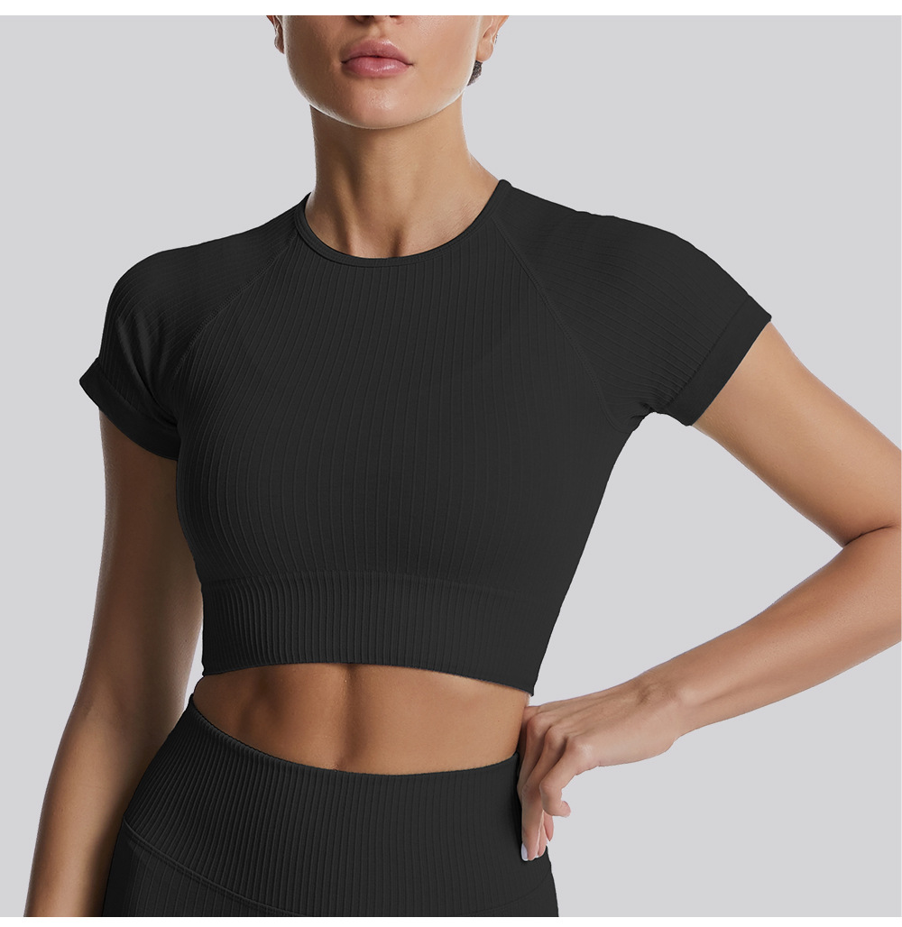跨境螺纹瑜伽服女运动上衣夏季紧身速干衣女跑步健身短袖套装批发