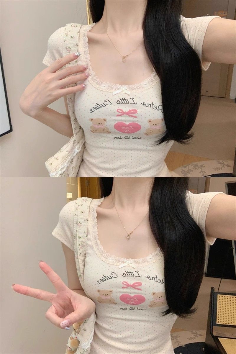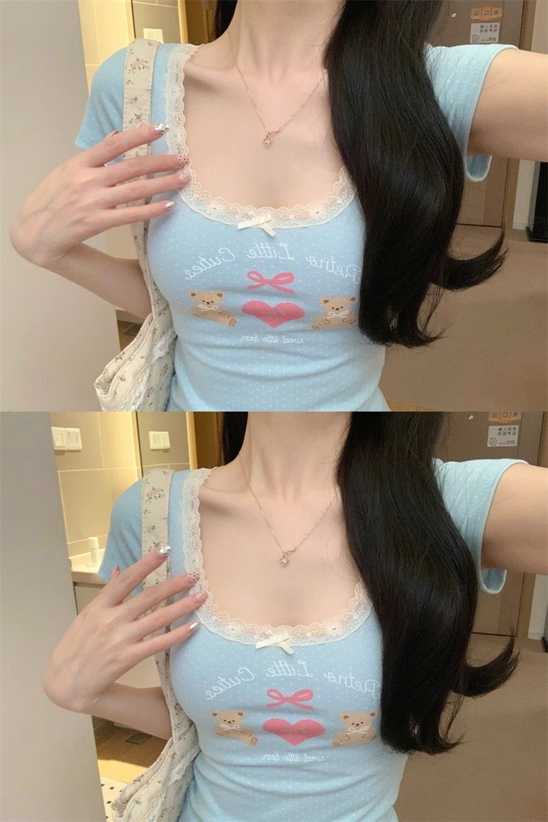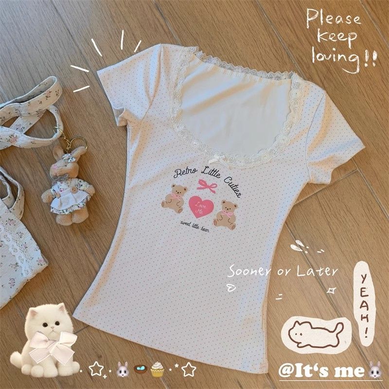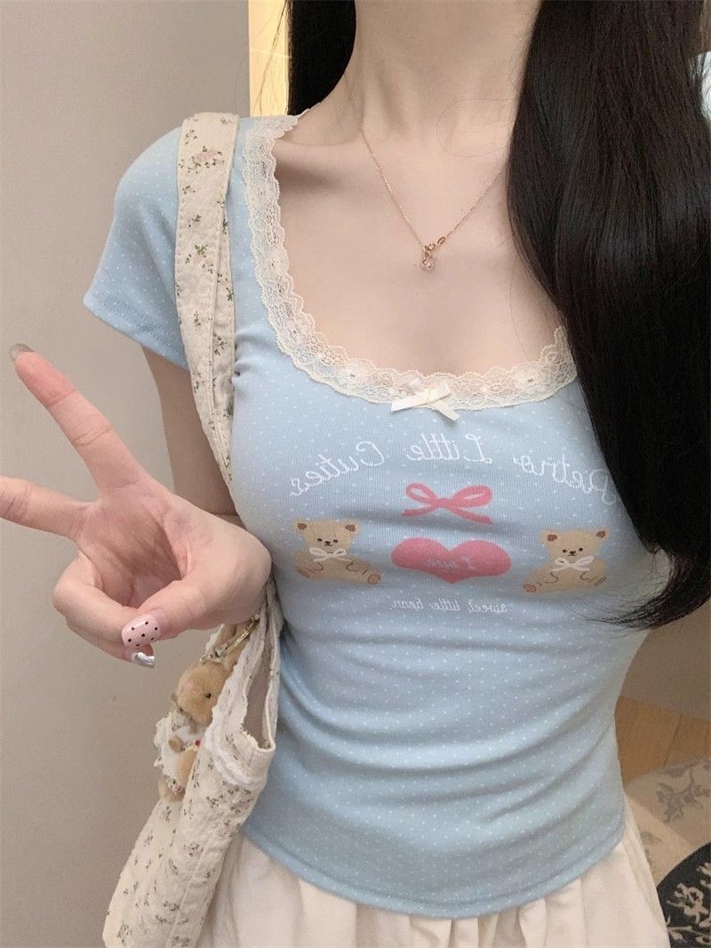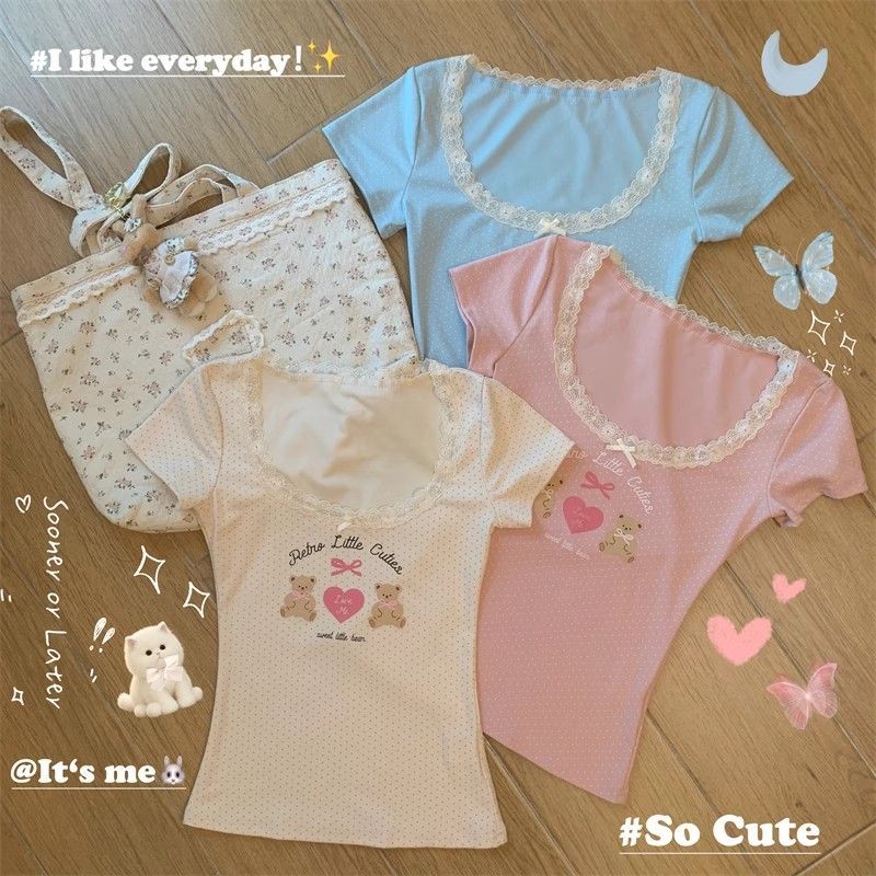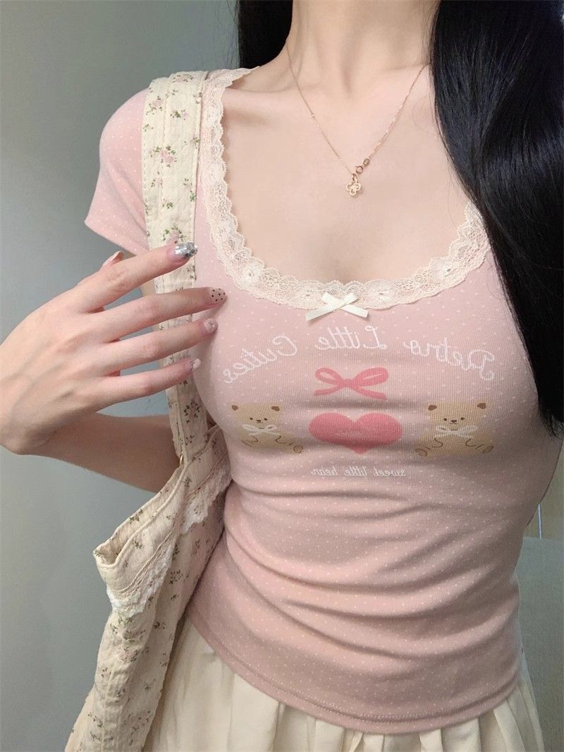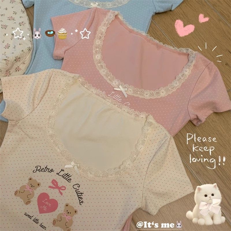 夏季新款纯棉bm风印花短袖t恤女小众设计感蕾丝蝴蝶结修身显瘦