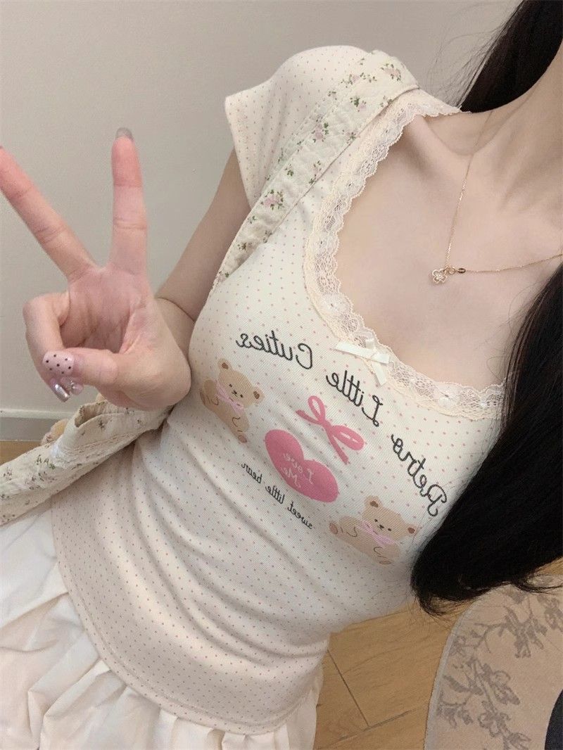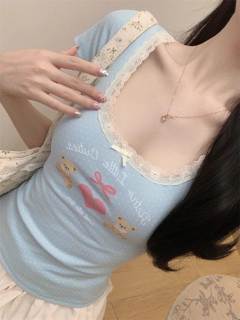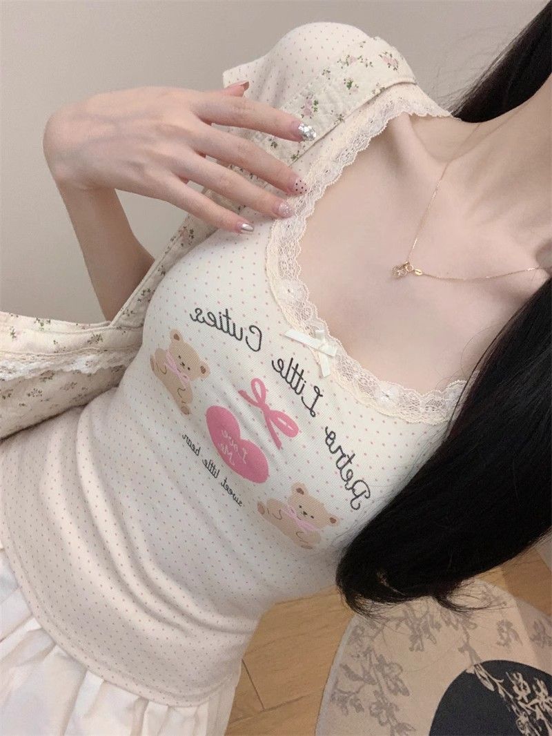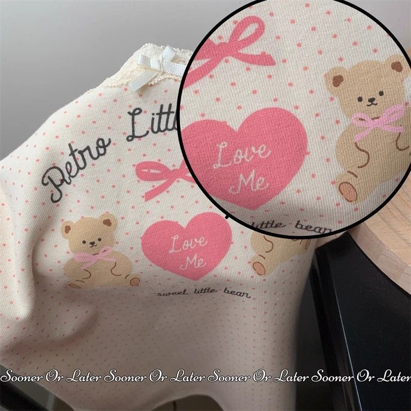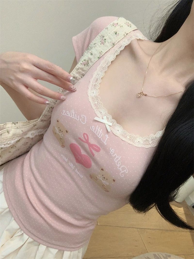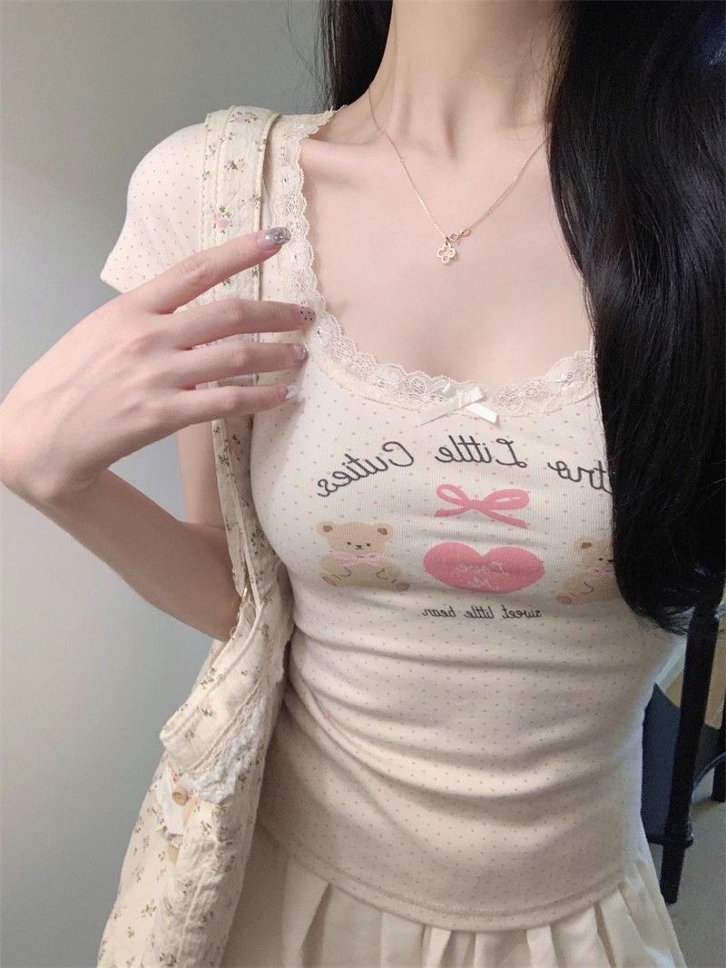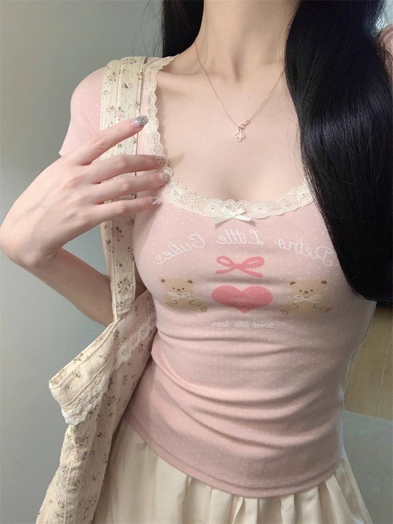 夏季新款纯棉bm风印花短袖t恤女小众设计感蕾丝蝴蝶结修身显瘦