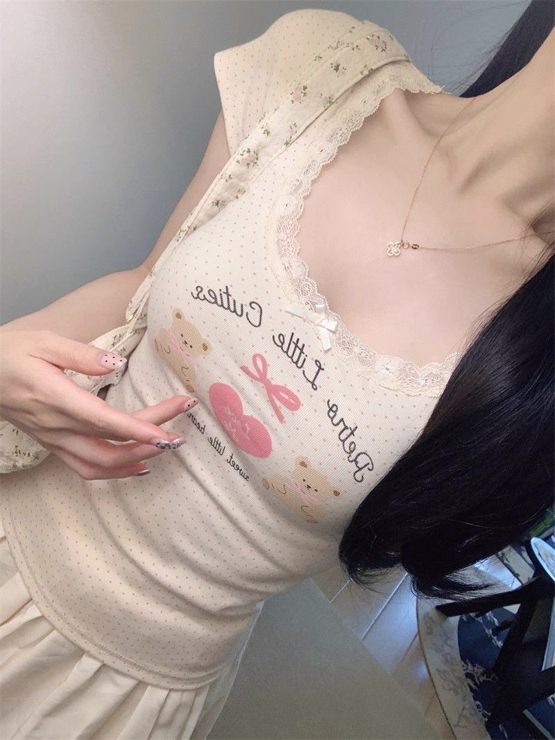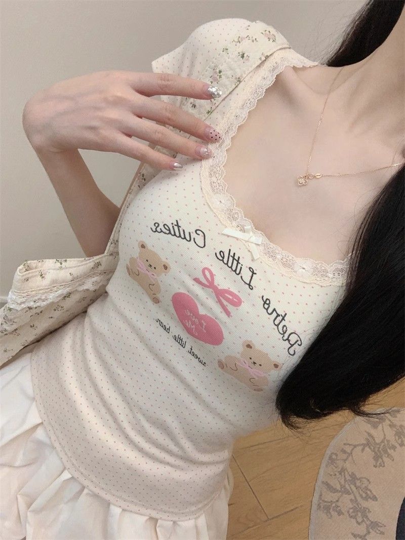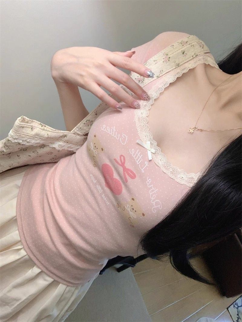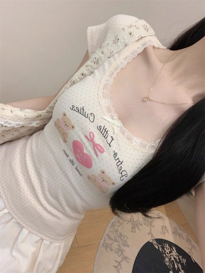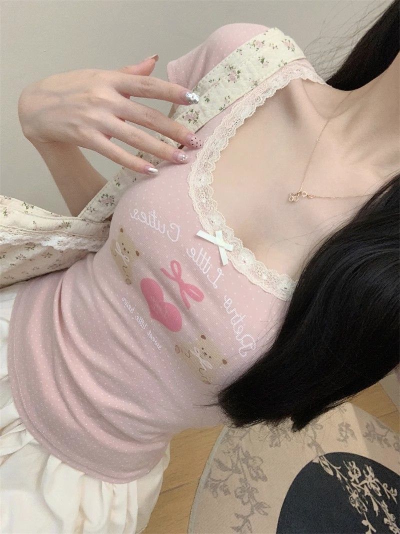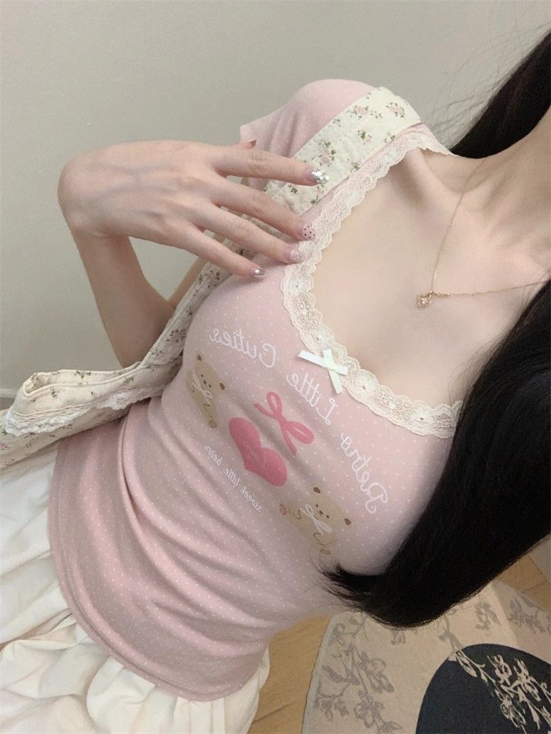 夏季新款纯棉bm风印花短袖t恤女小众设计感蕾丝蝴蝶结修身显瘦