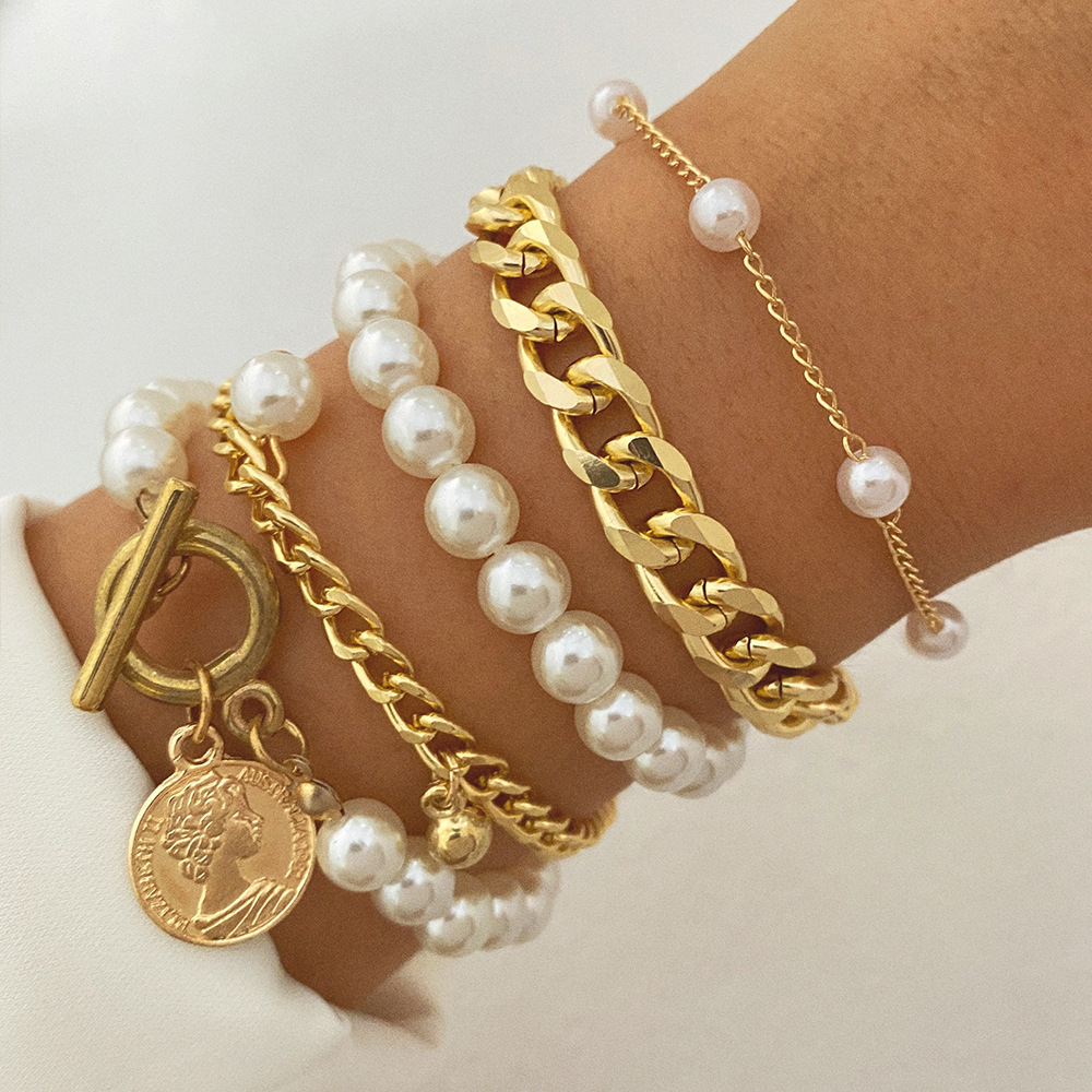 欧美跨境新品叠戴个性街拍爱心手链四件套夸张螺纹链条合金手镯女