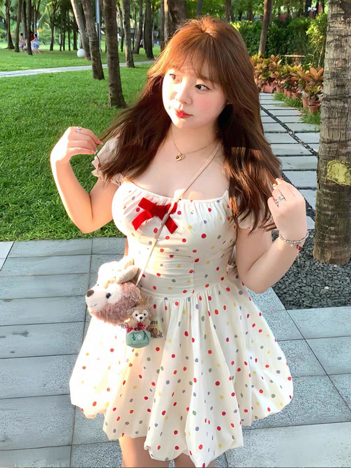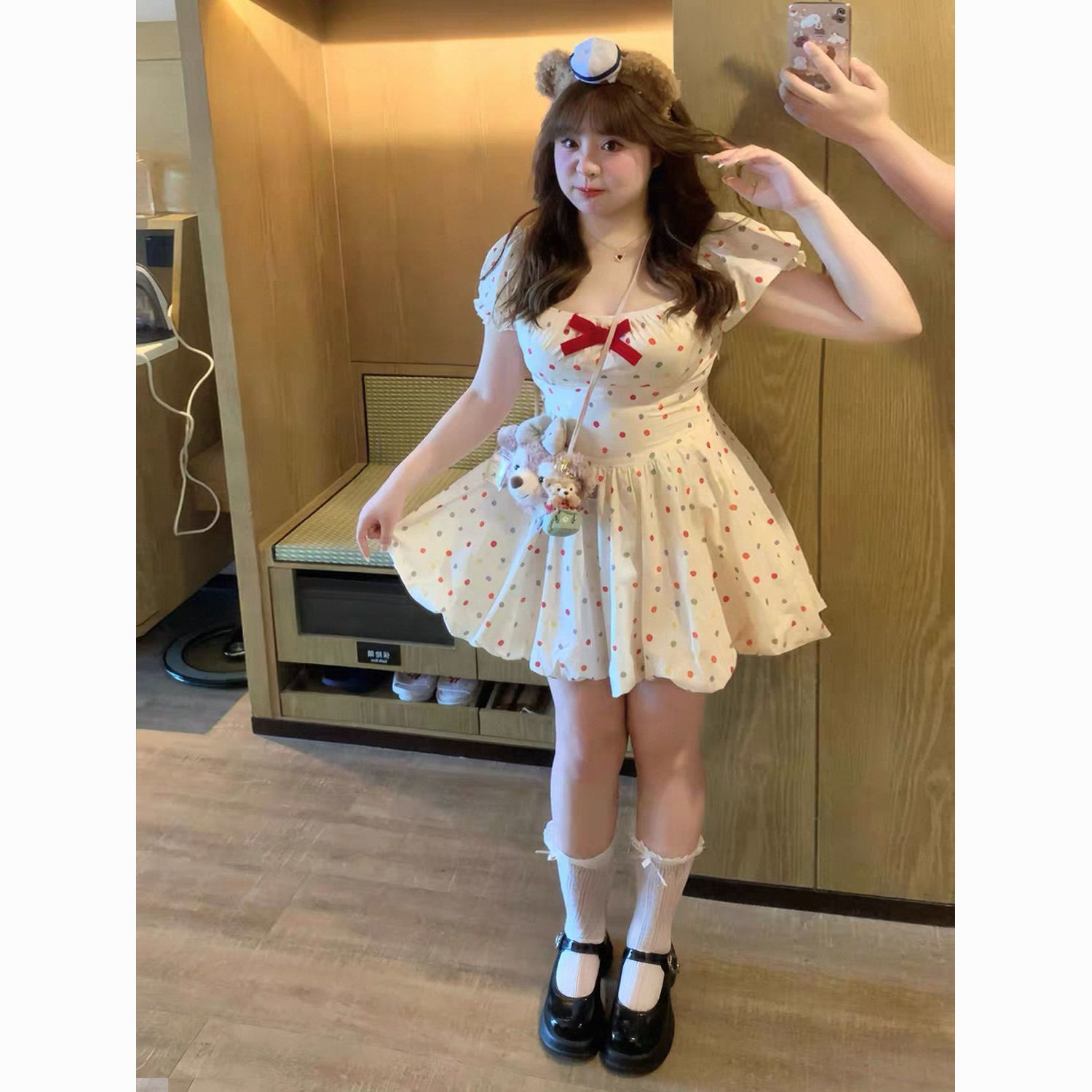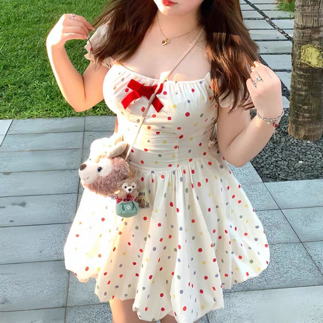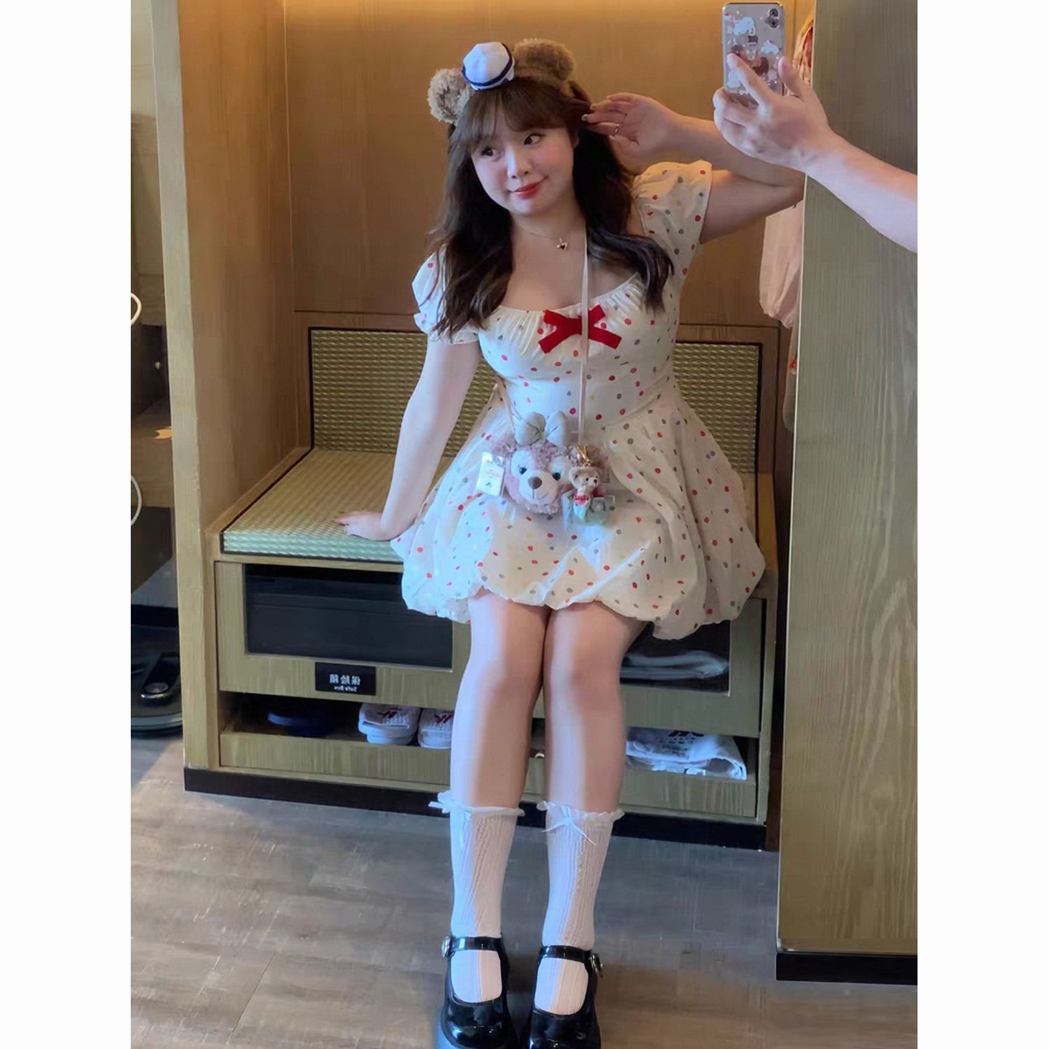 大码女装少女可爱波点方领连衣裙女夏季修身显瘦甜美公主蓬蓬裙子