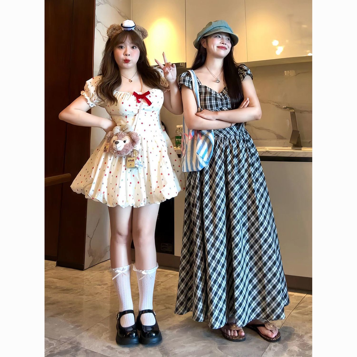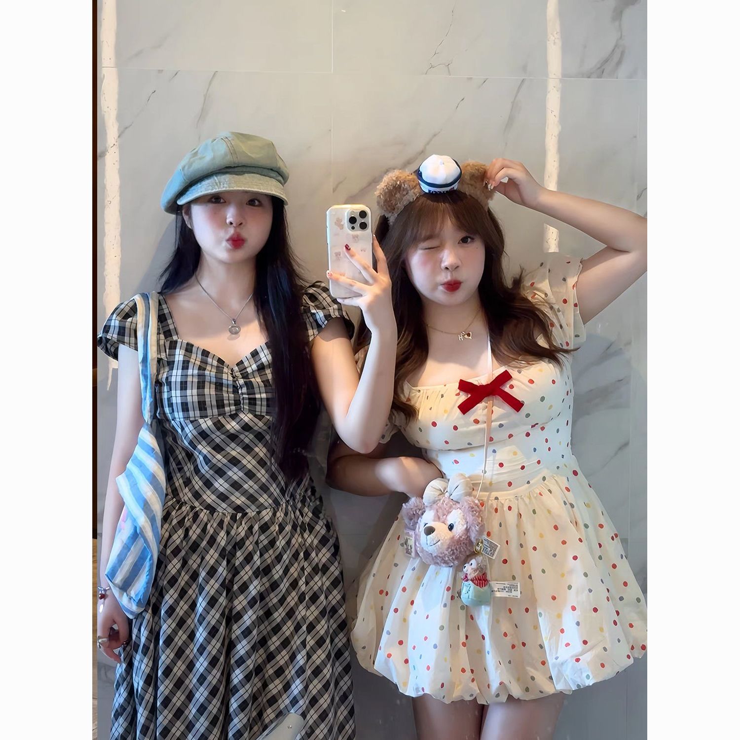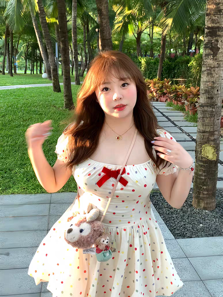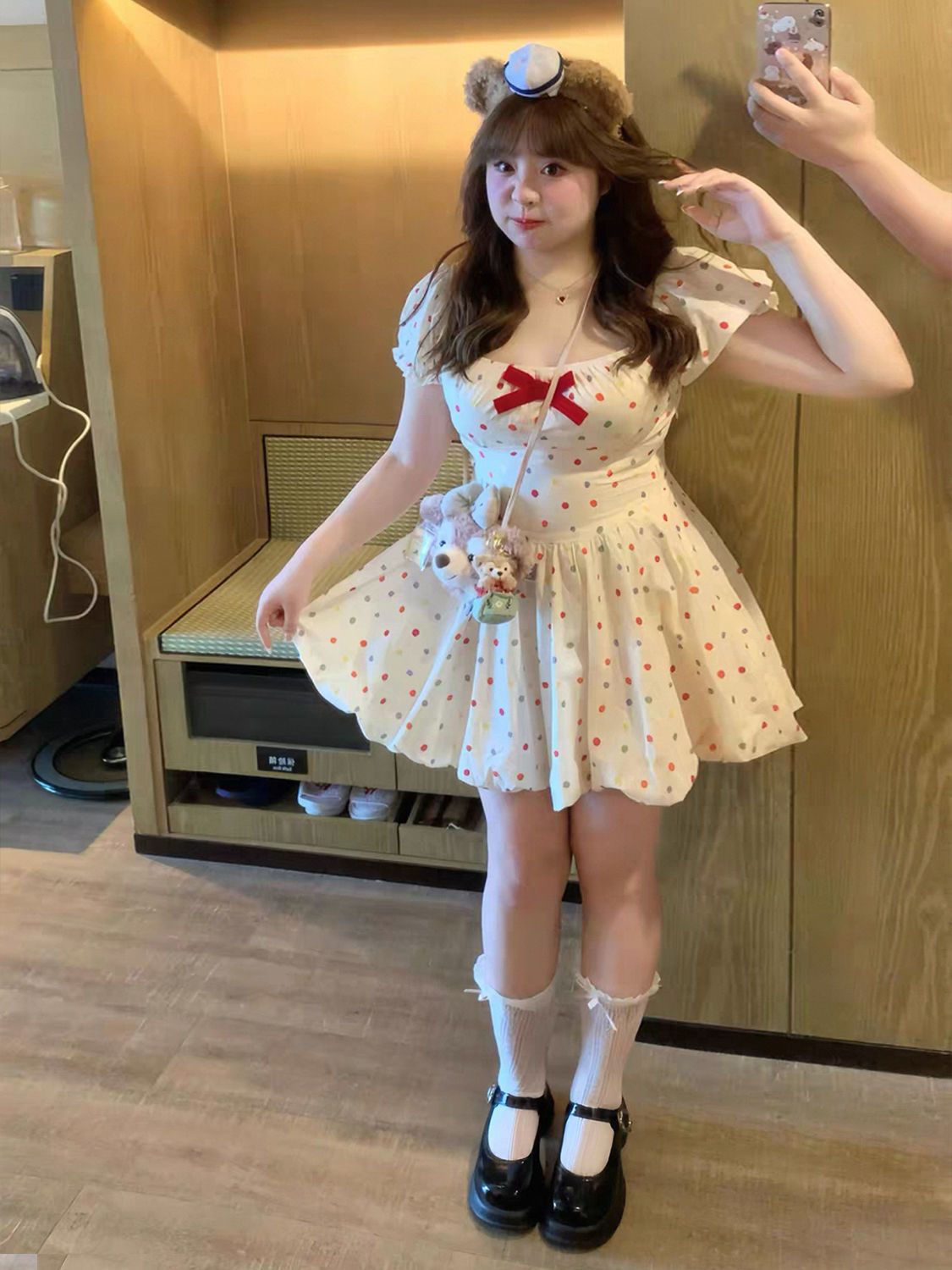 大码女装少女可爱波点方领连衣裙女夏季修身显瘦甜美公主蓬蓬裙子