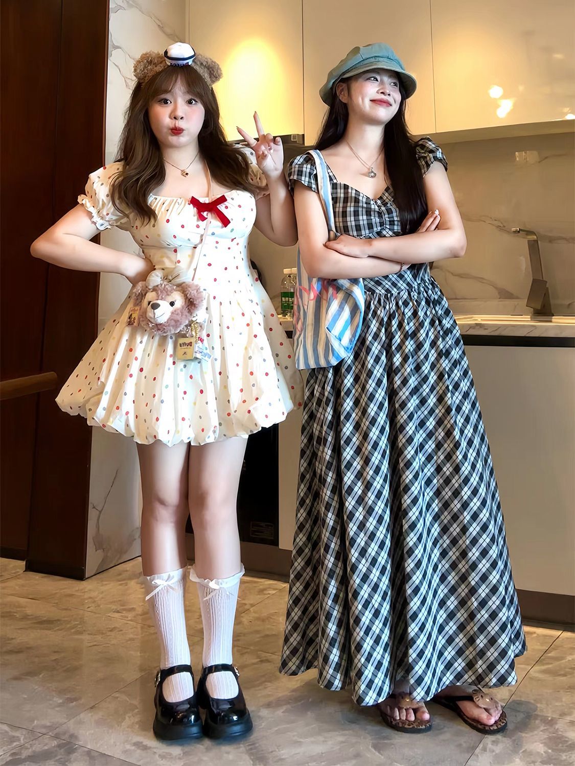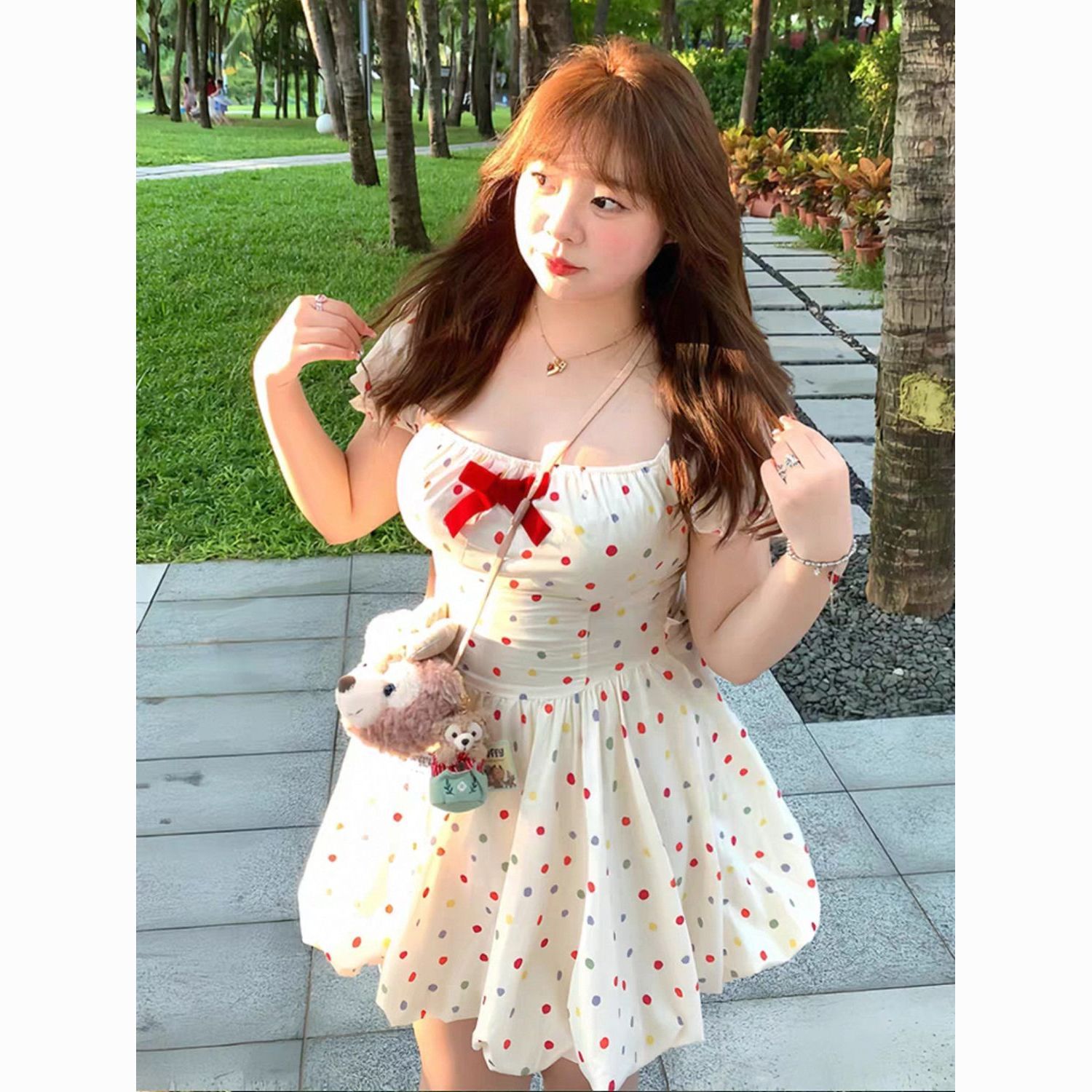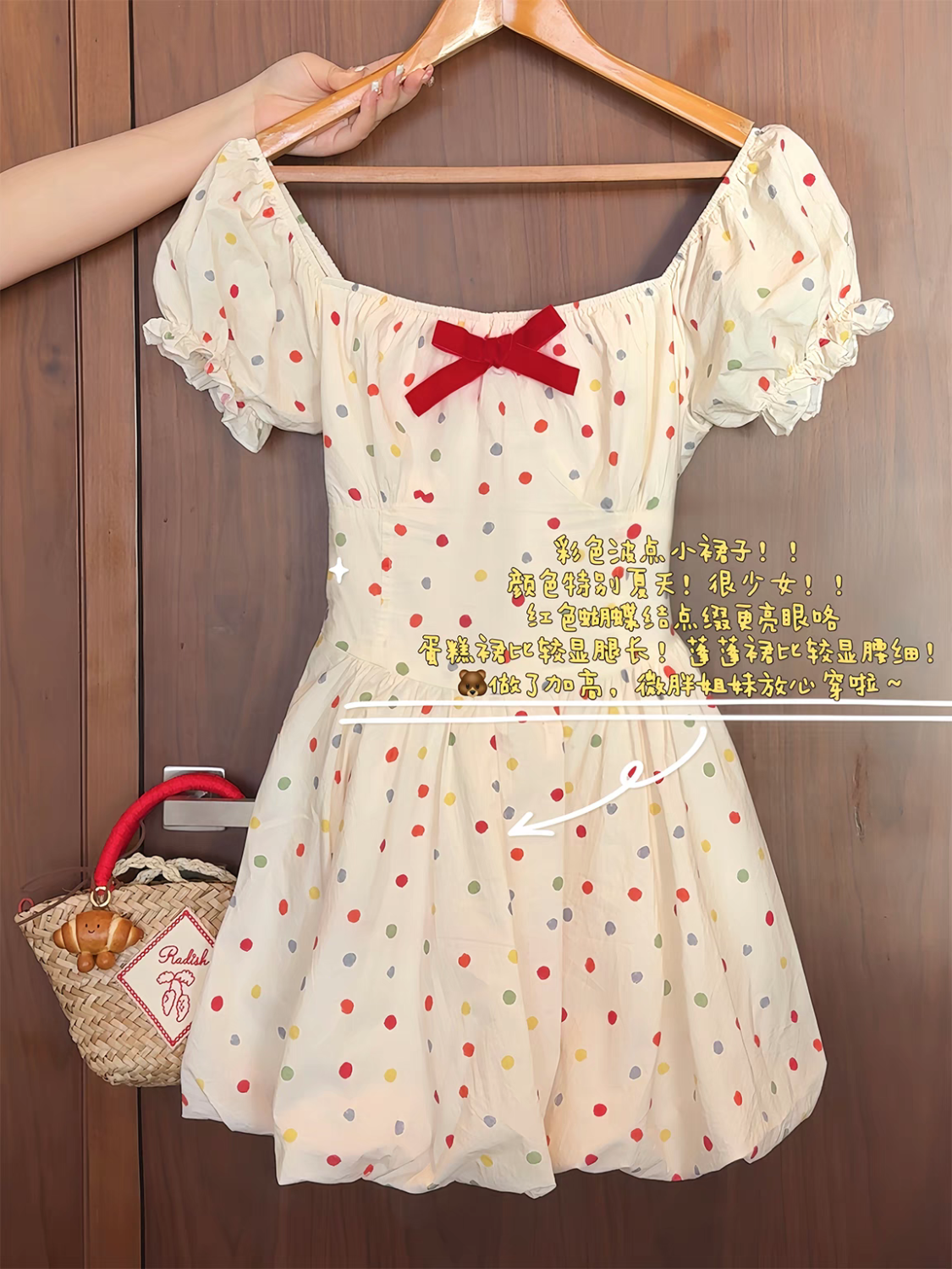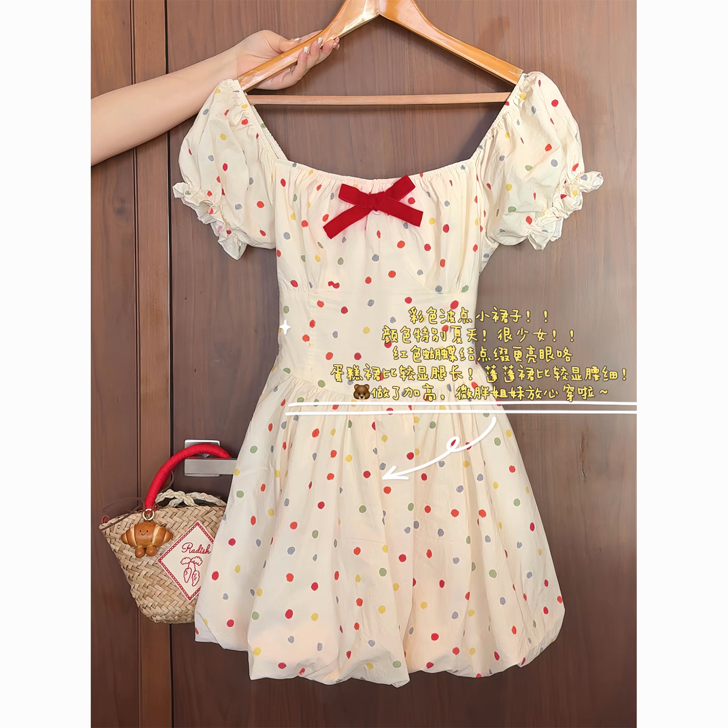 大码女装少女可爱波点方领连衣裙女夏季修身显瘦甜美公主蓬蓬裙子