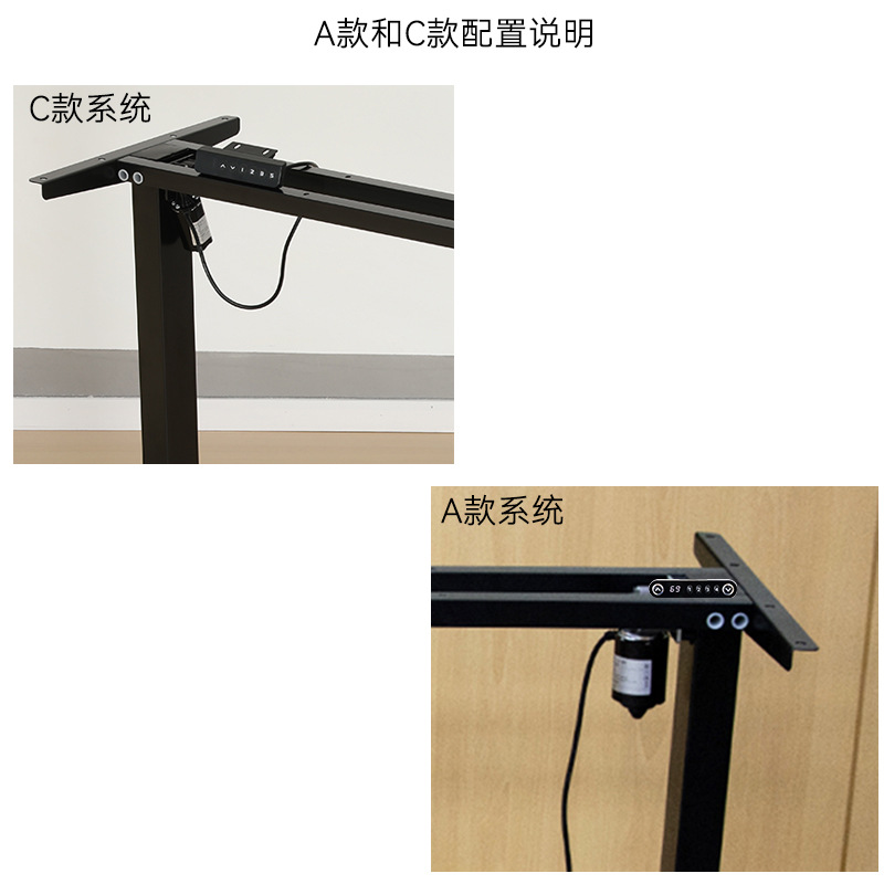 C款支持功能比较多:3个记忆按键,童锁,高度DIY,20W快充,上下遇阻停,程序更智能化,设计负载60KG