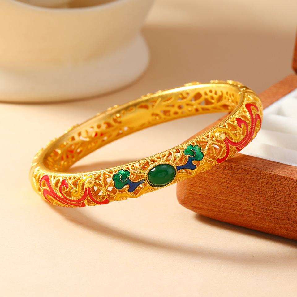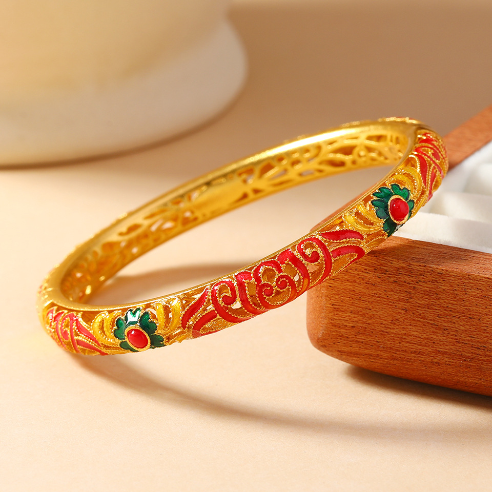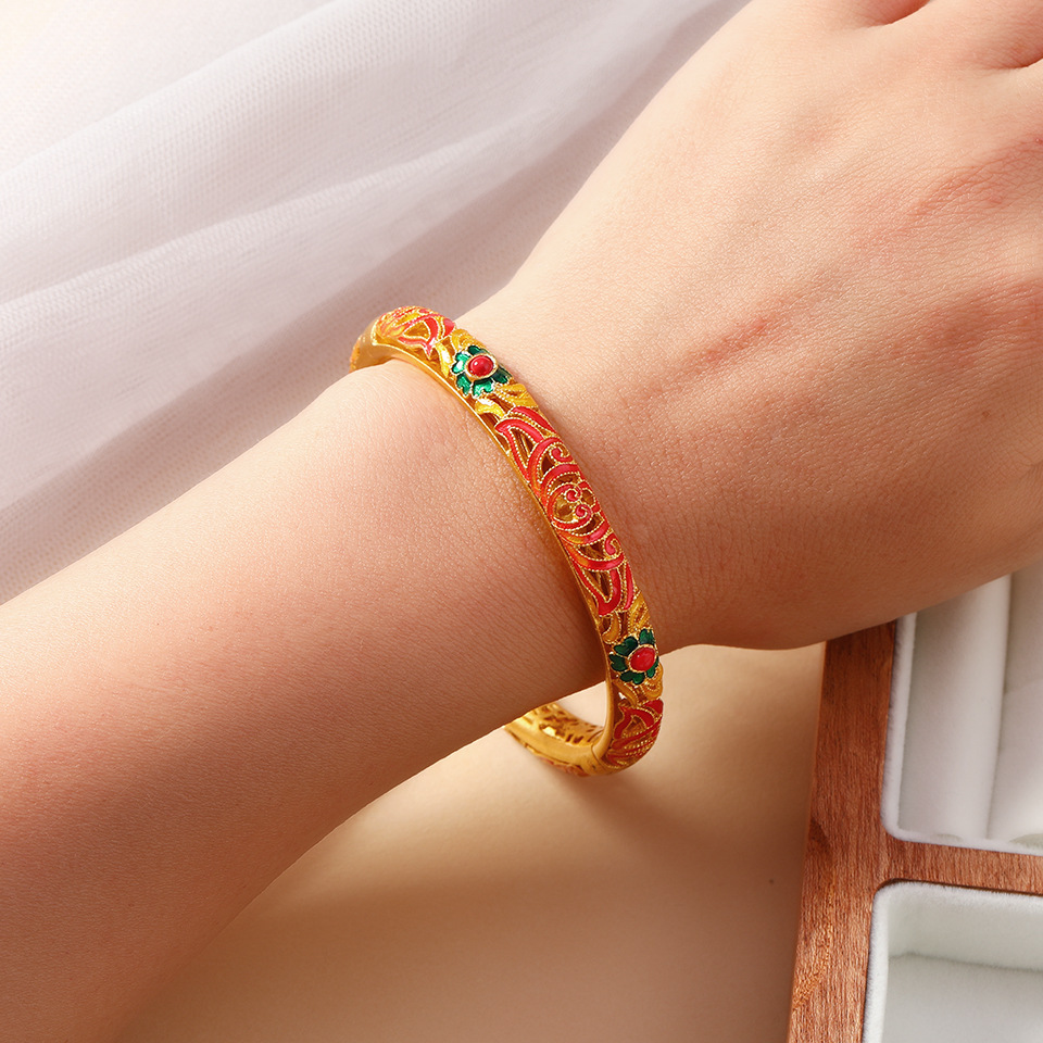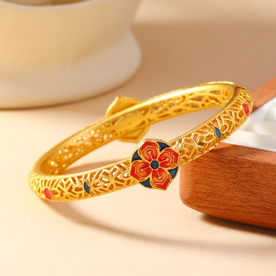 古法沙金24K黄金色雕花手镯宫廷风花丝镂空镯子高级感婚嫁送礼女