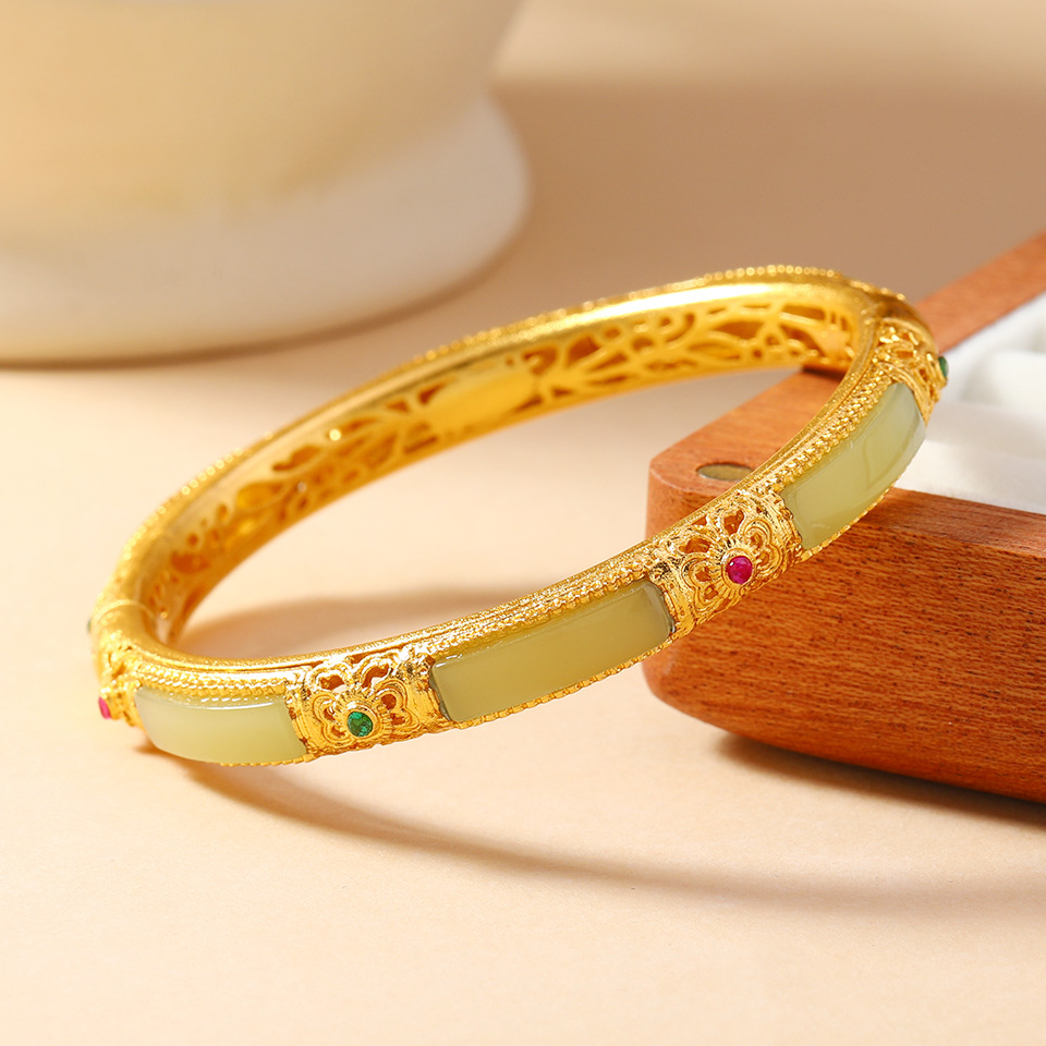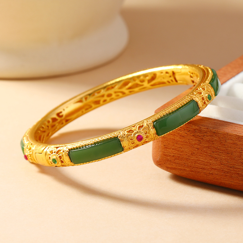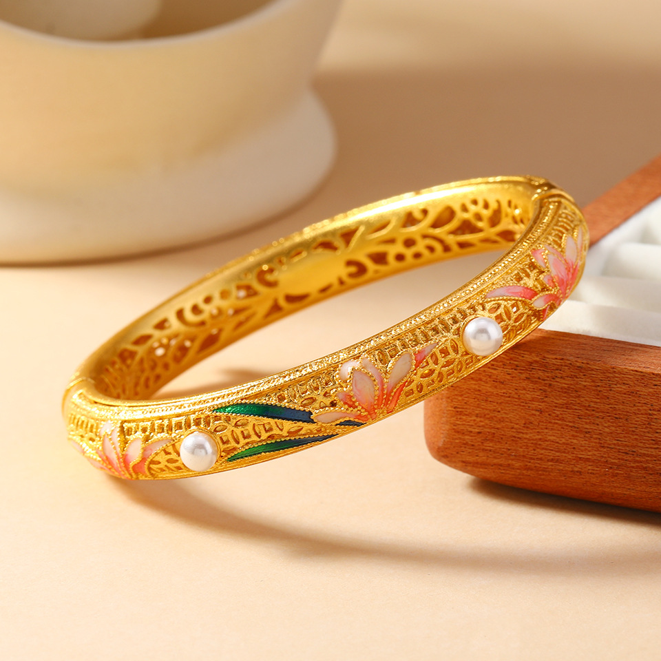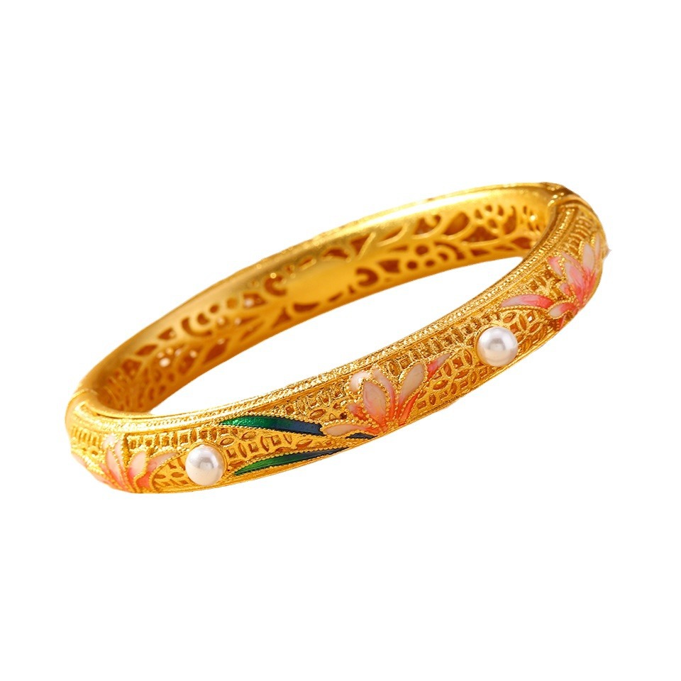 古法沙金24K黄金色雕花手镯宫廷风花丝镂空镯子高级感婚嫁送礼女