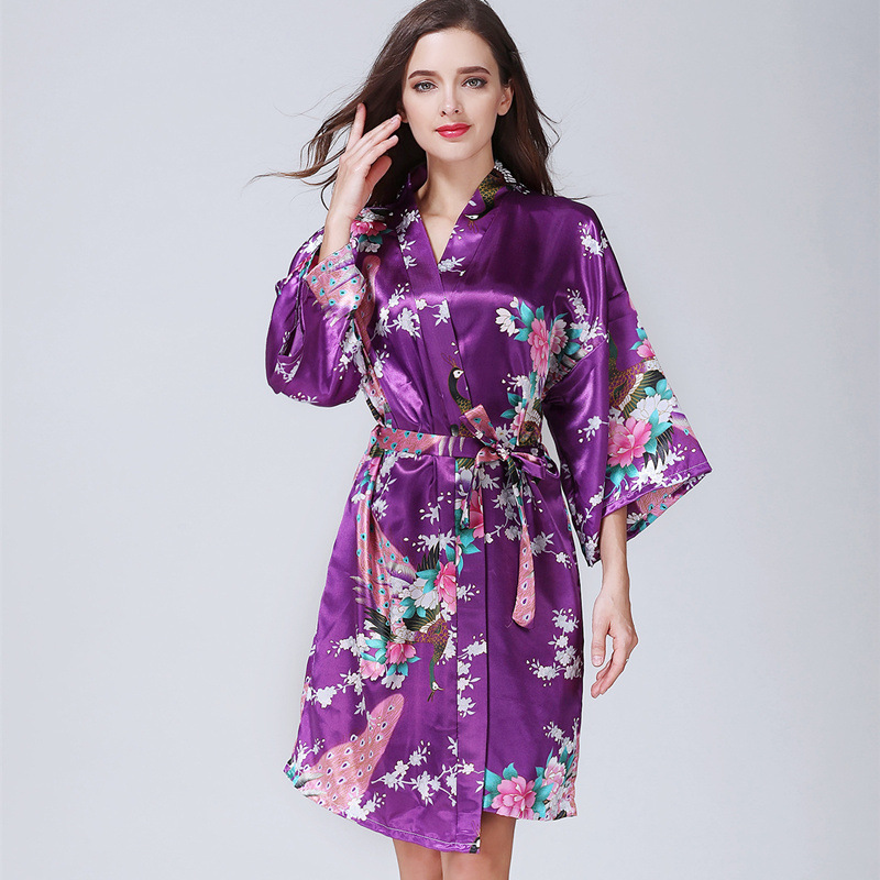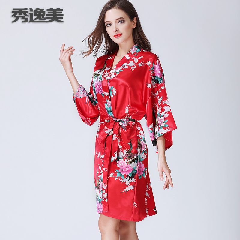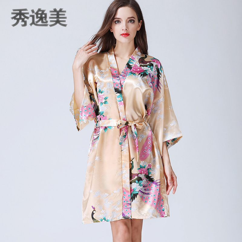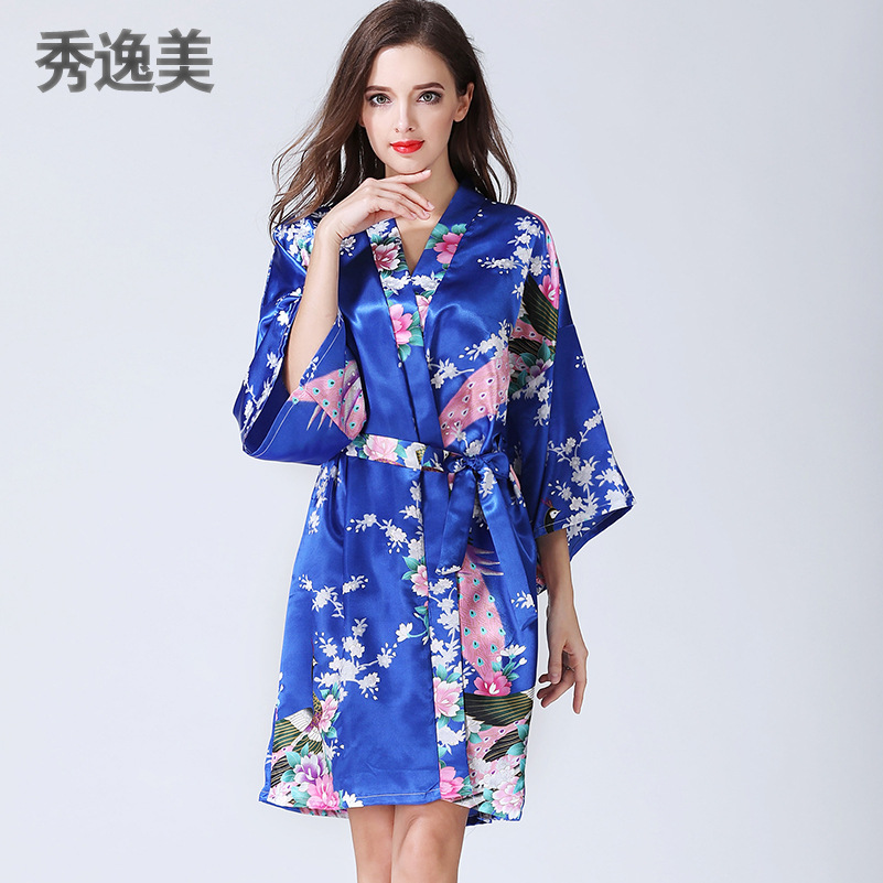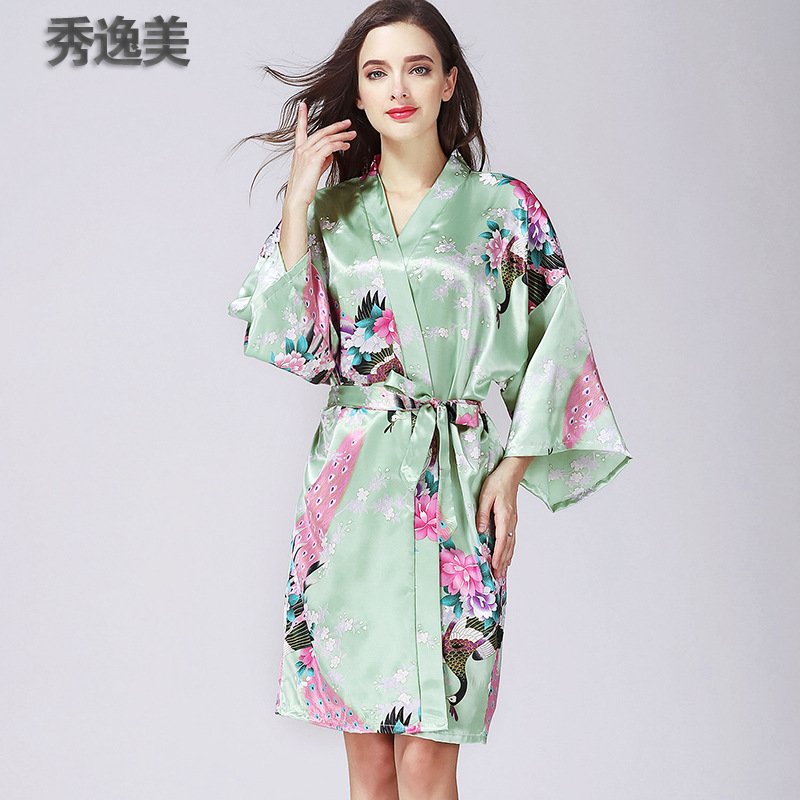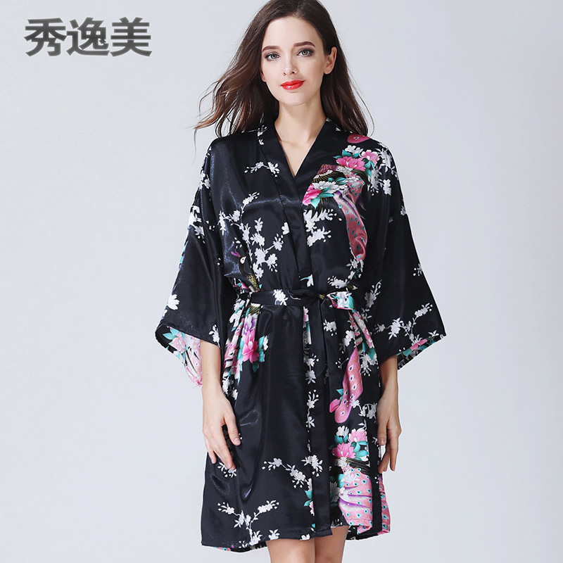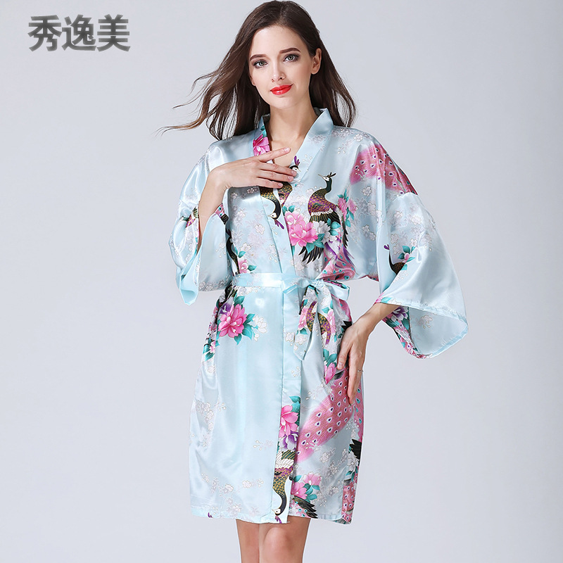 睡衣女秋冬季中袖仿真丝睡袍浴袍性感家居服春秋孔雀浴衣日本和服