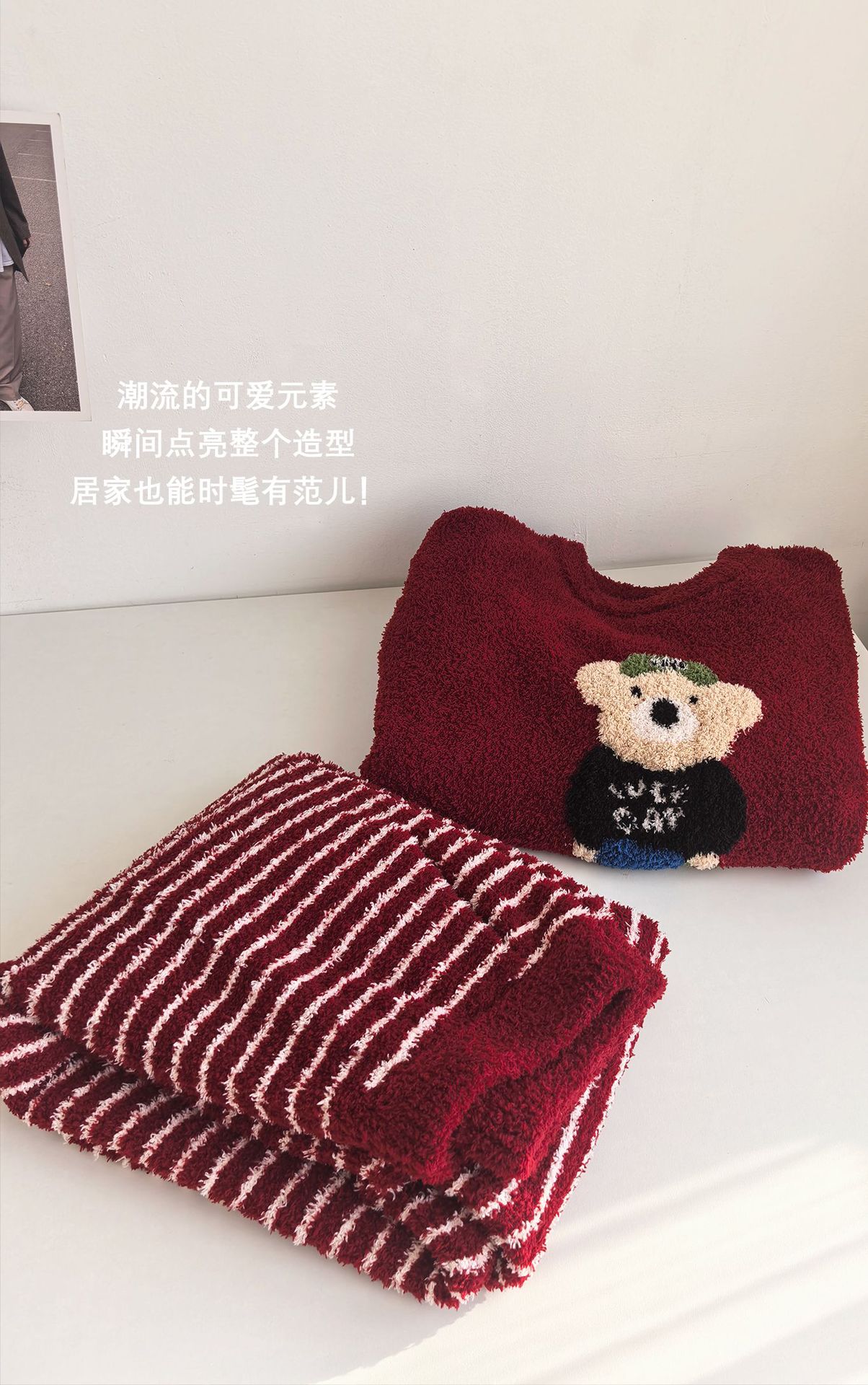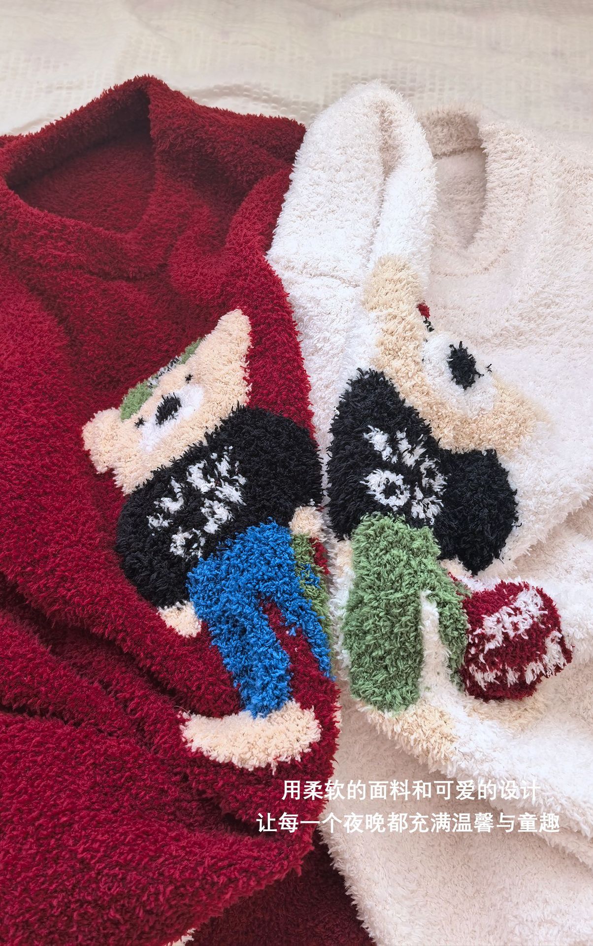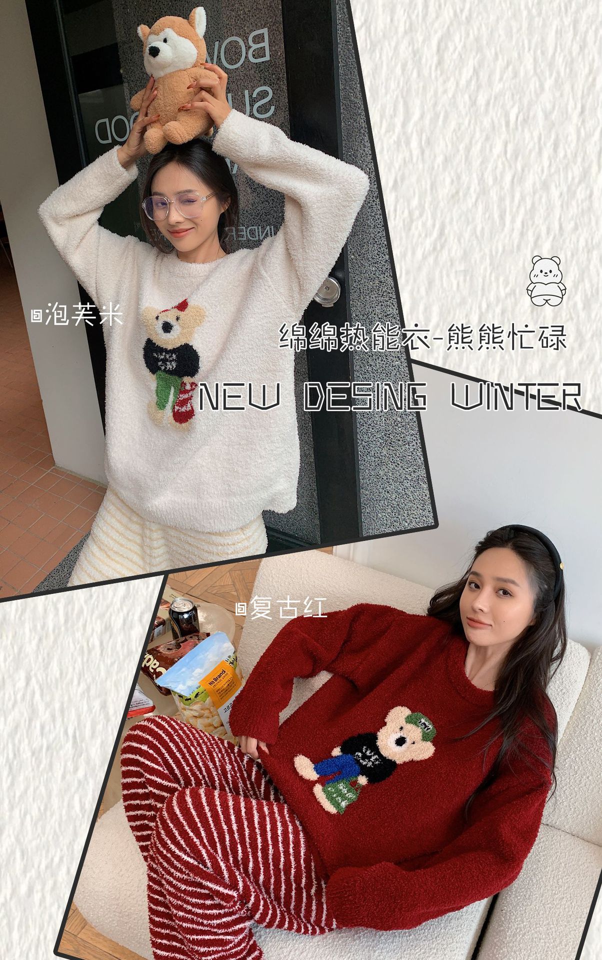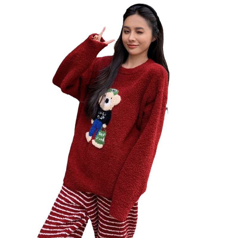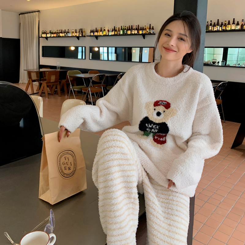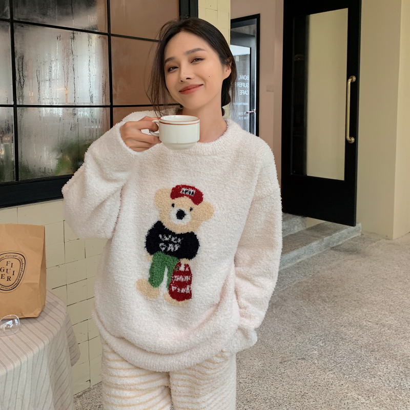 绵绵热能睡衣套装提花小熊冬季加绒加厚半边绒家居服柔软宽松保暖