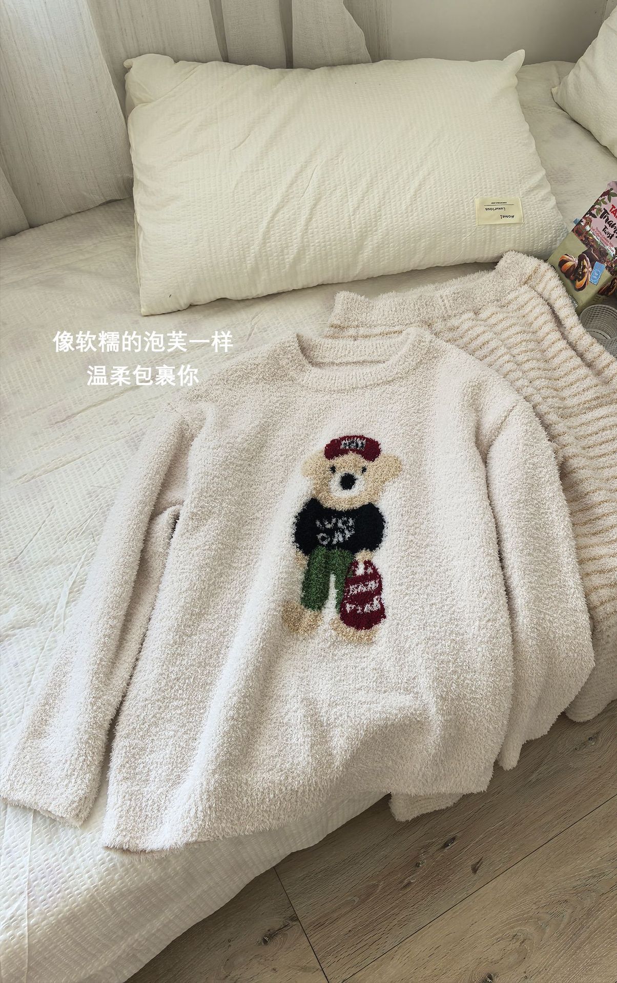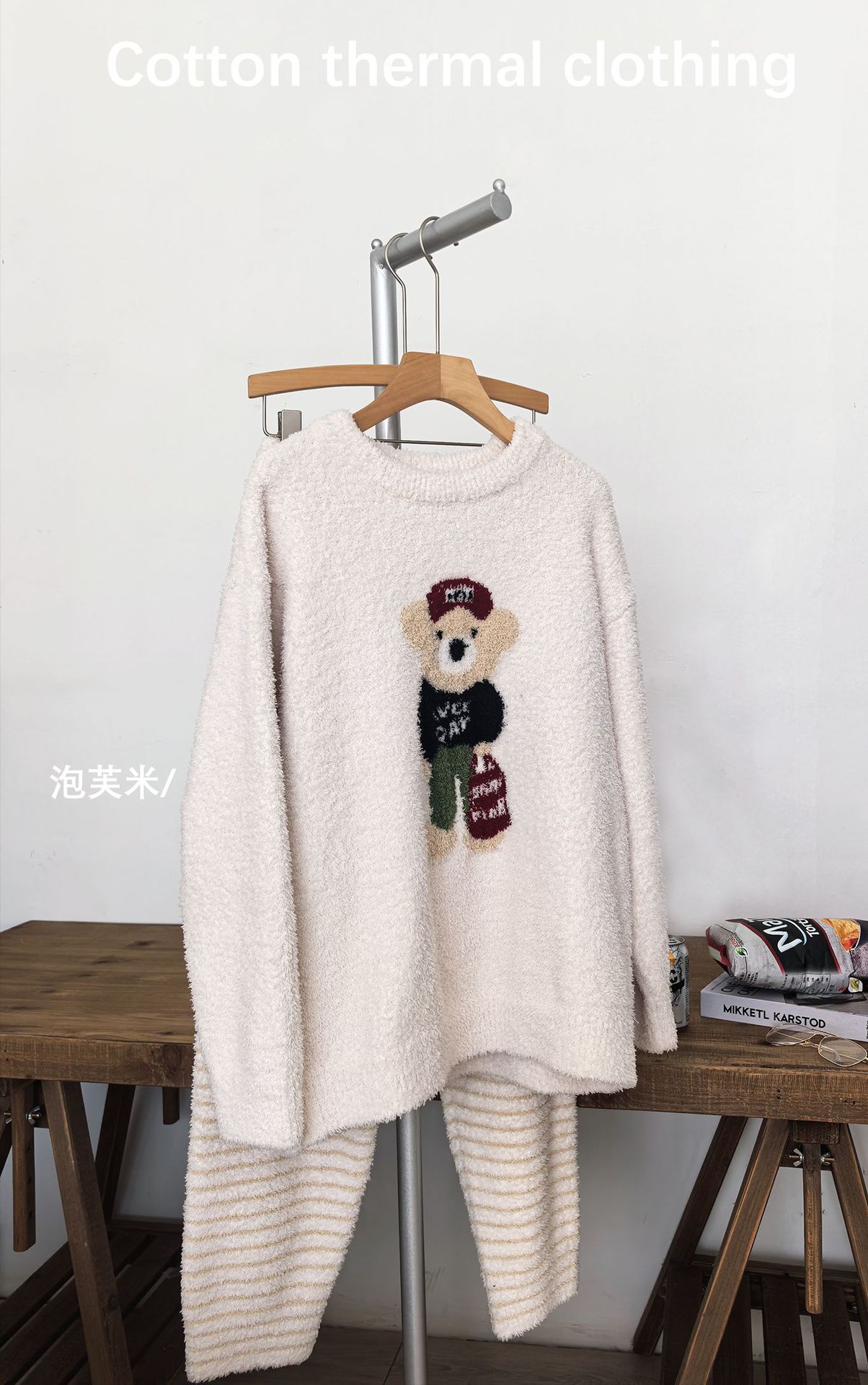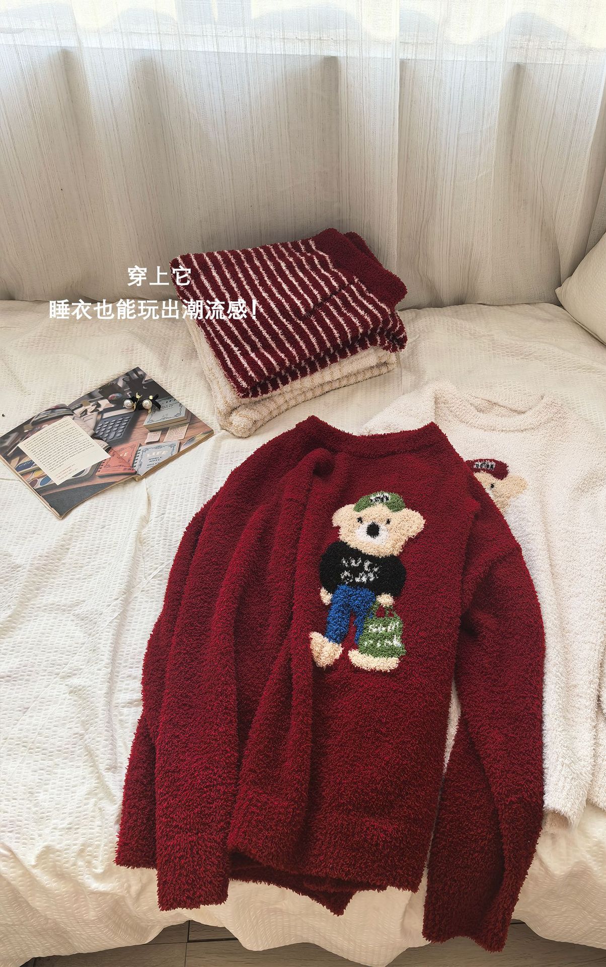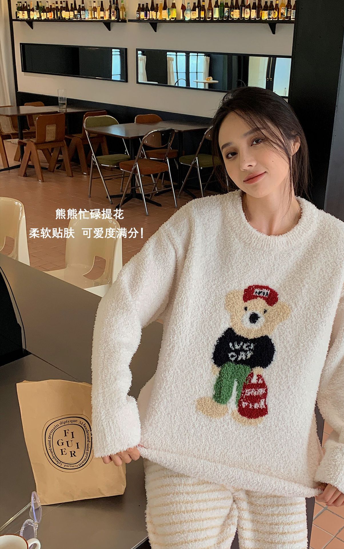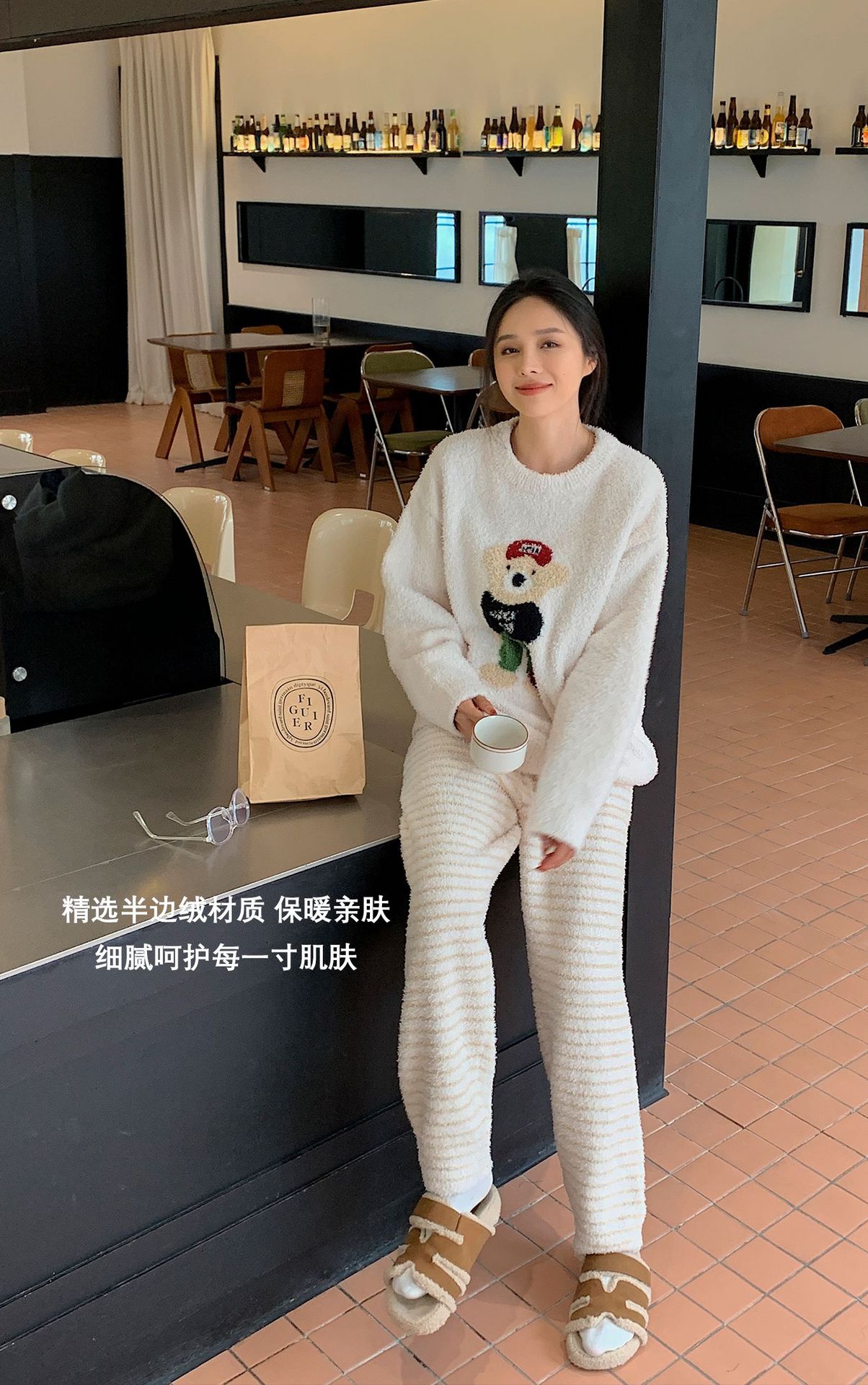 绵绵热能睡衣套装提花小熊冬季加绒加厚半边绒家居服柔软宽松保暖