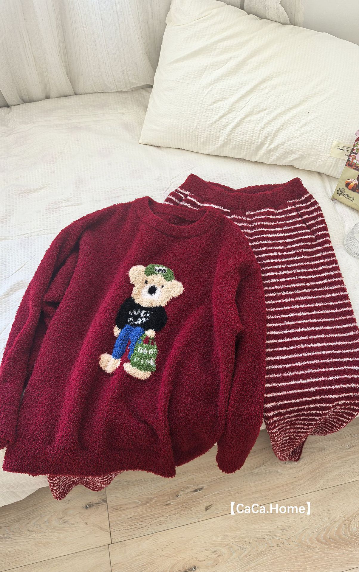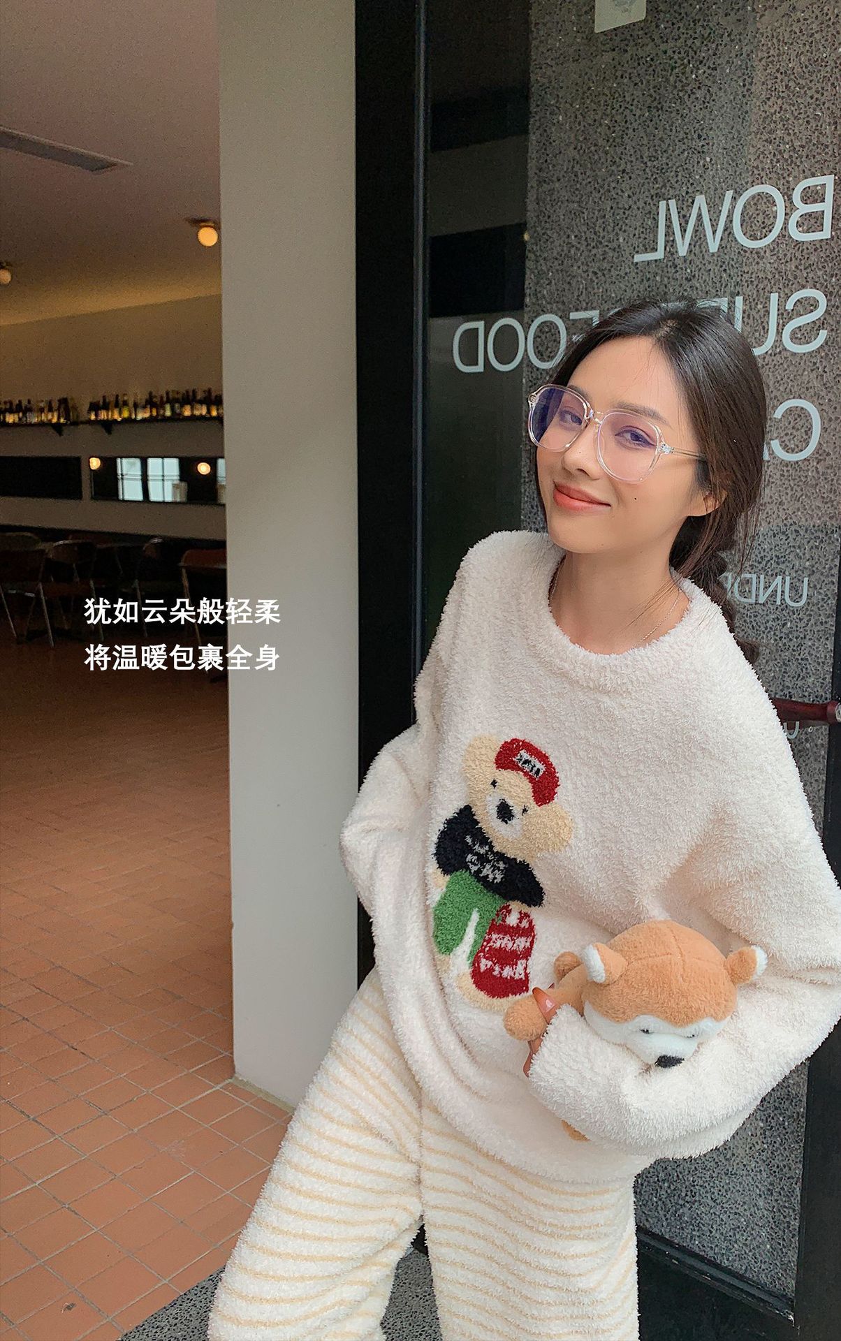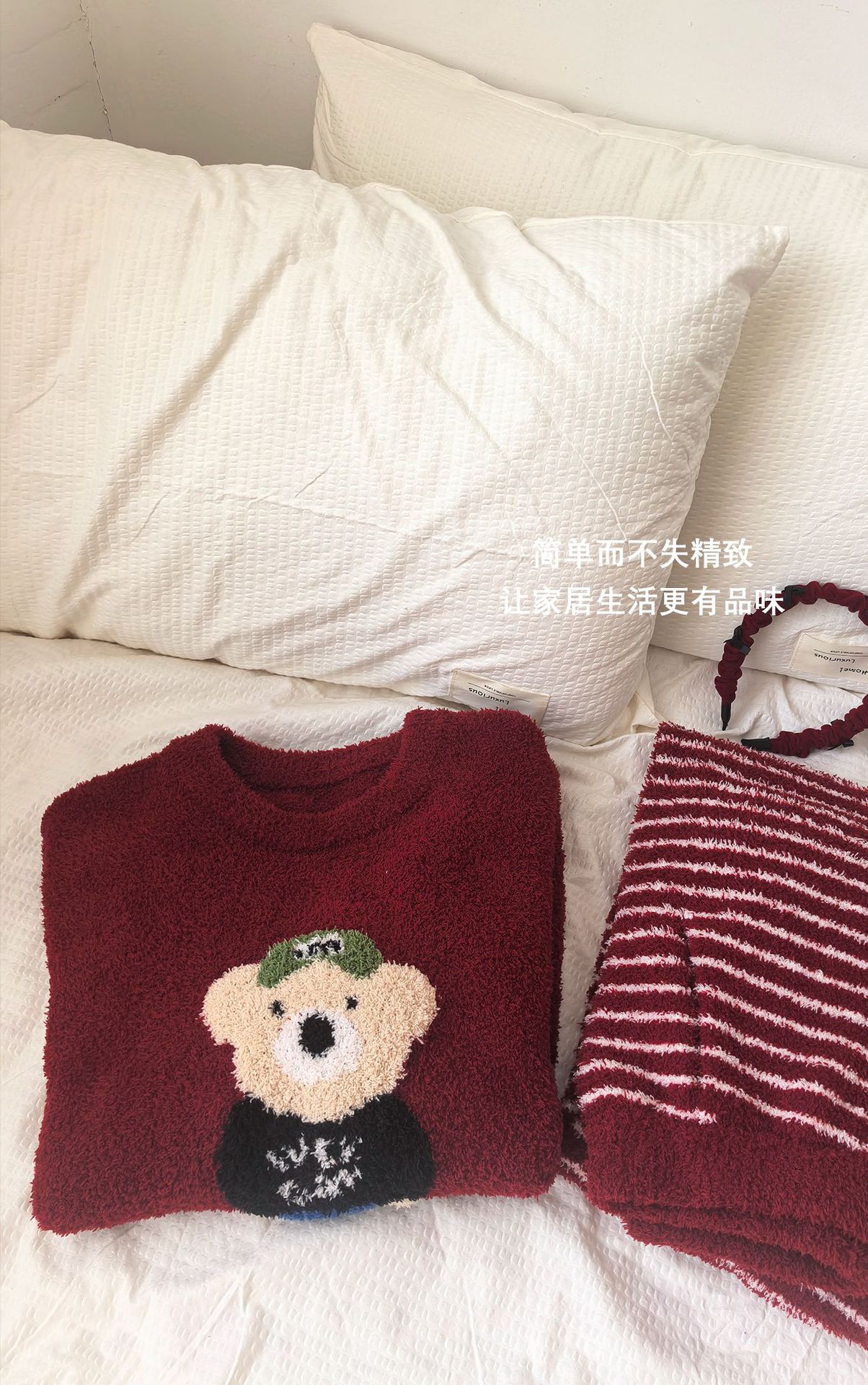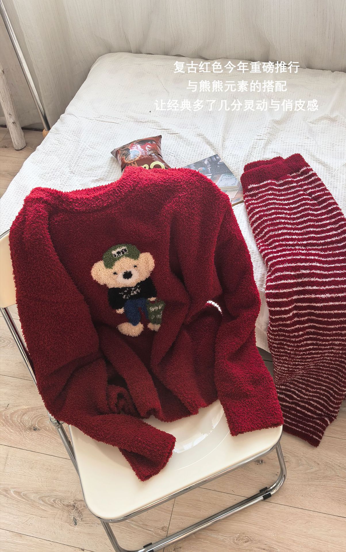 绵绵热能睡衣套装提花小熊冬季加绒加厚半边绒家居服柔软宽松保暖
