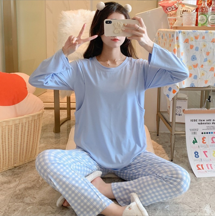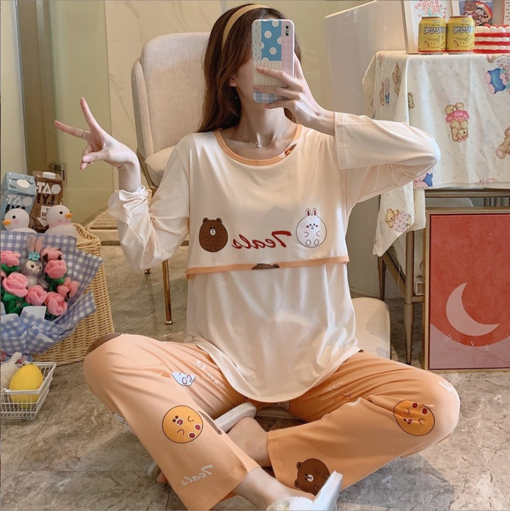 月子服喂奶衣薄款产后哺乳睡衣女孕妇卡通春秋仿棉产妇春夏天春天