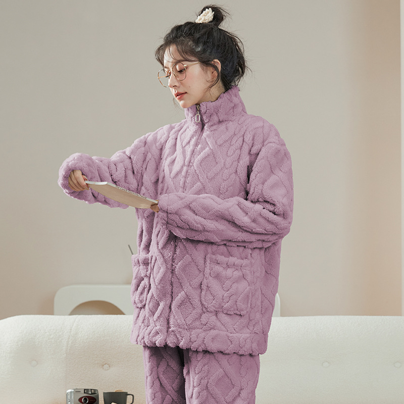 可外穿睡衣女男士秋冬季法兰绒加厚立领连帽拉链珊瑚绒家居服套装