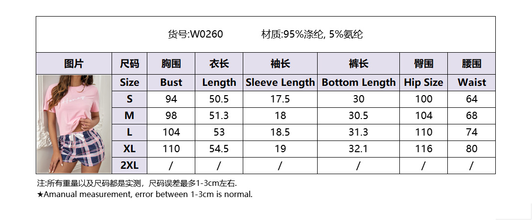 跨境家居服两件套字母印花格子短裤T恤蝴蝶结欧美睡衣套装Pajama