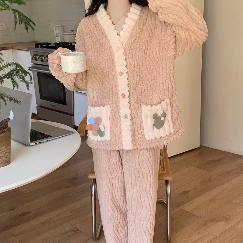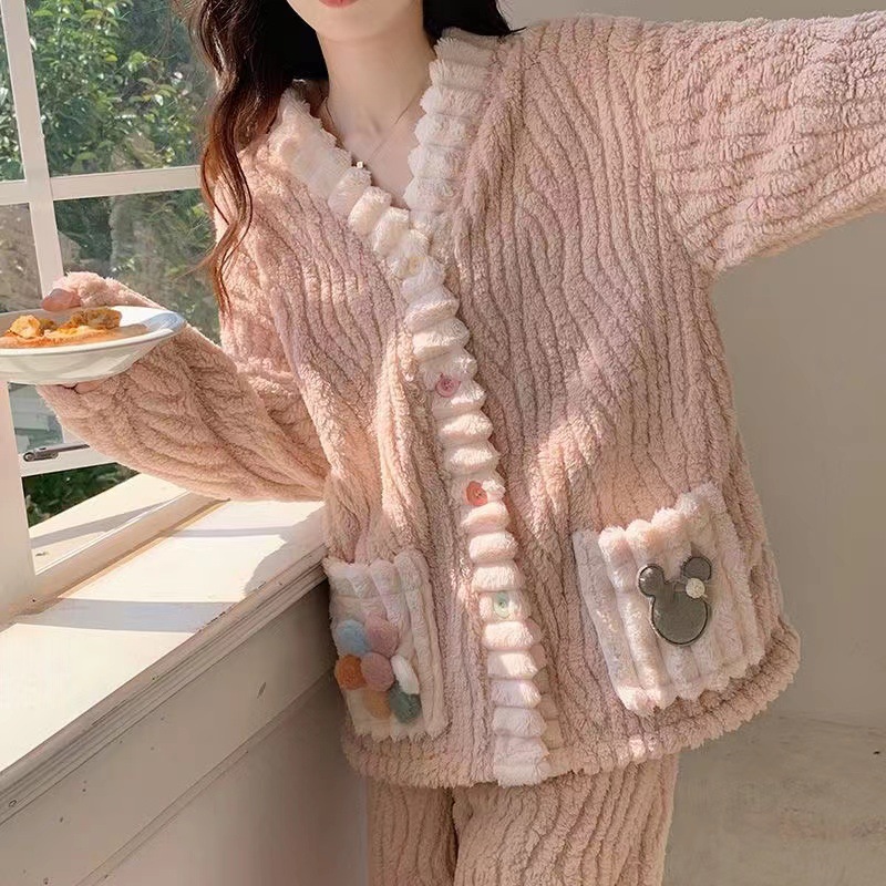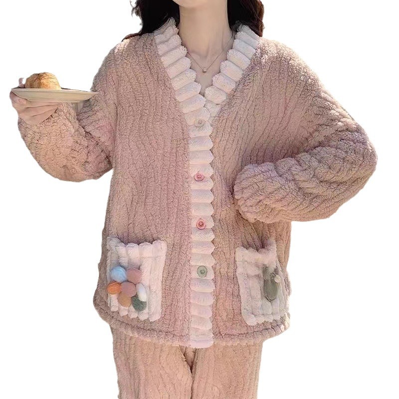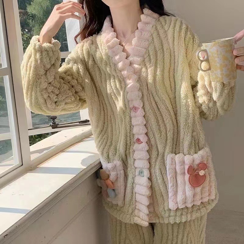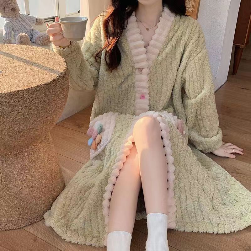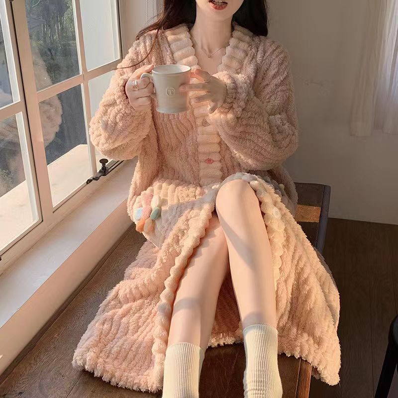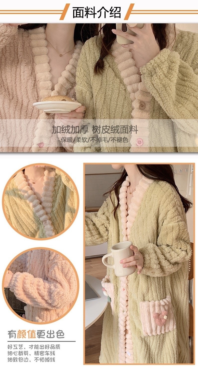 秋冬季彩虹睡袍开衫睡衣套装家居服女珊瑚绒加厚保暖月子服两件套
