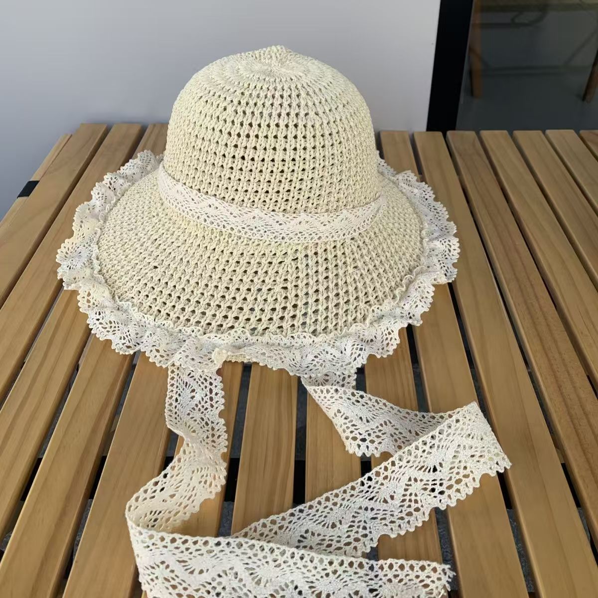 法式草帽女2024夏季新款透气蕾丝花边镂空防晒帽海边帽子遮阳帽