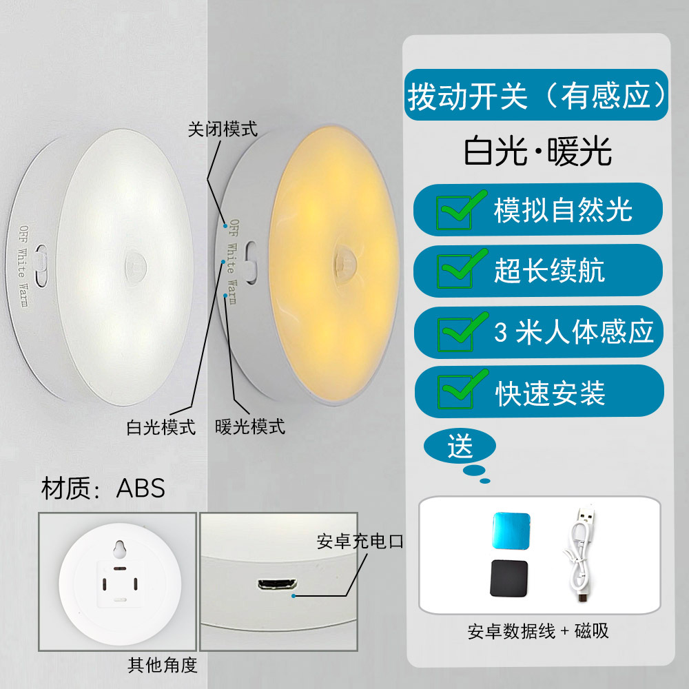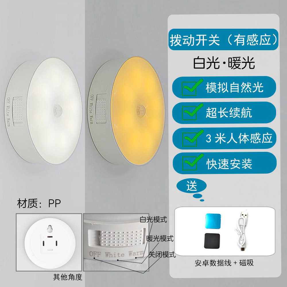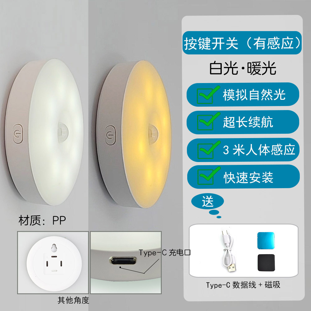 圆形磁吸人体感应灯USB充电式无线智能起夜灯免打孔衣橱柜小夜灯