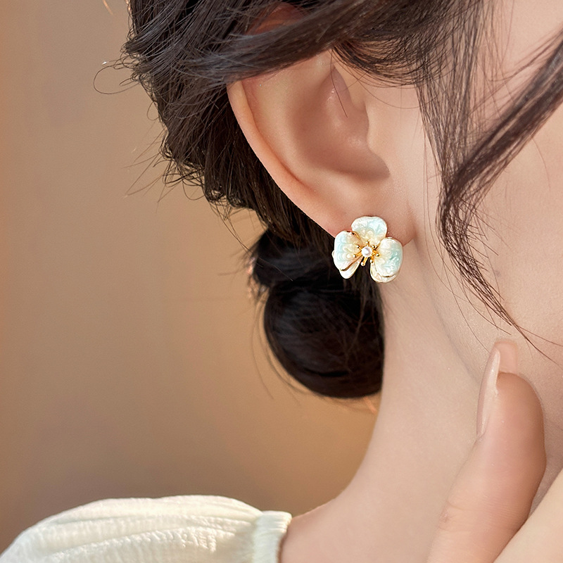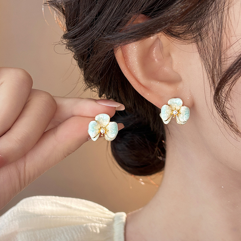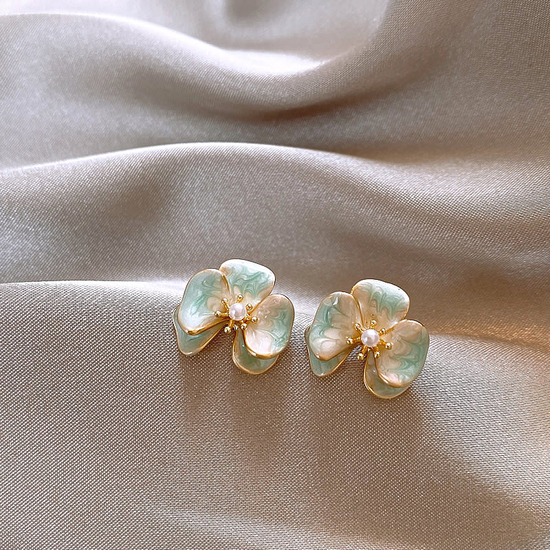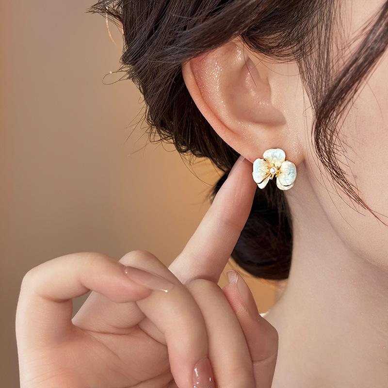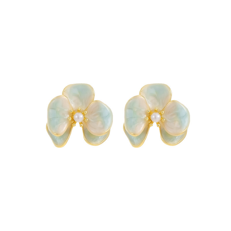 银针蓝色滴油晕染花朵珍珠耳钉小巧精致百搭耳环时尚甜美轻奢耳饰