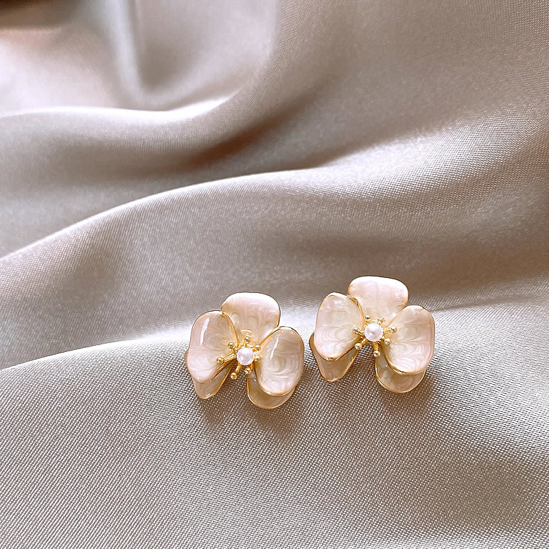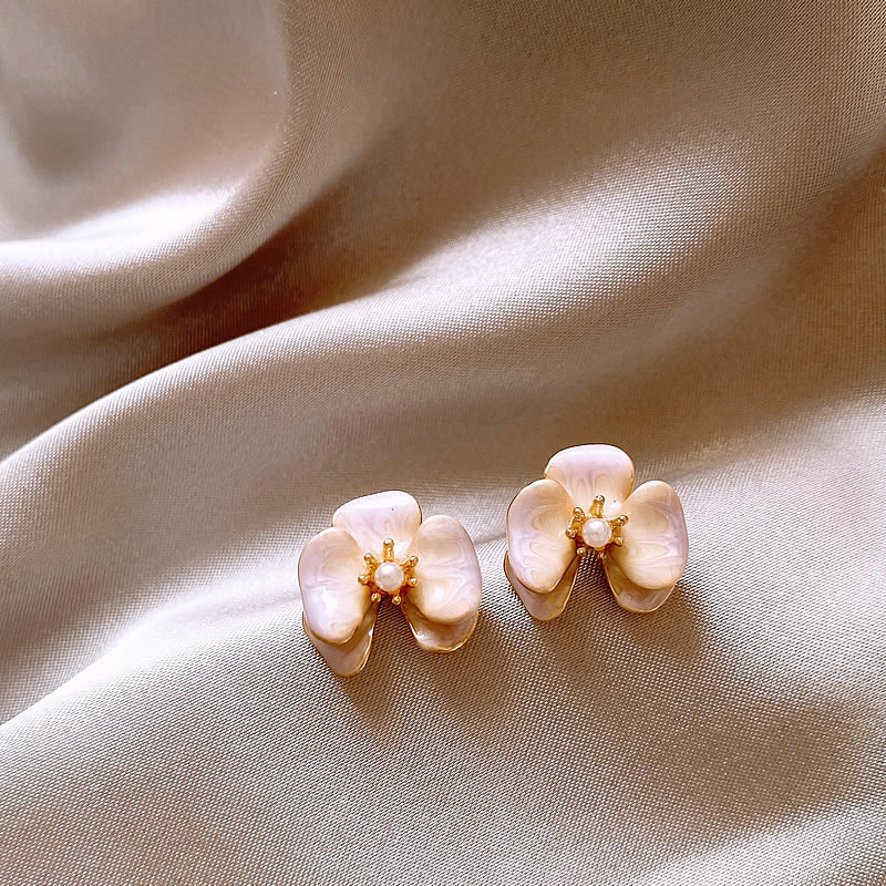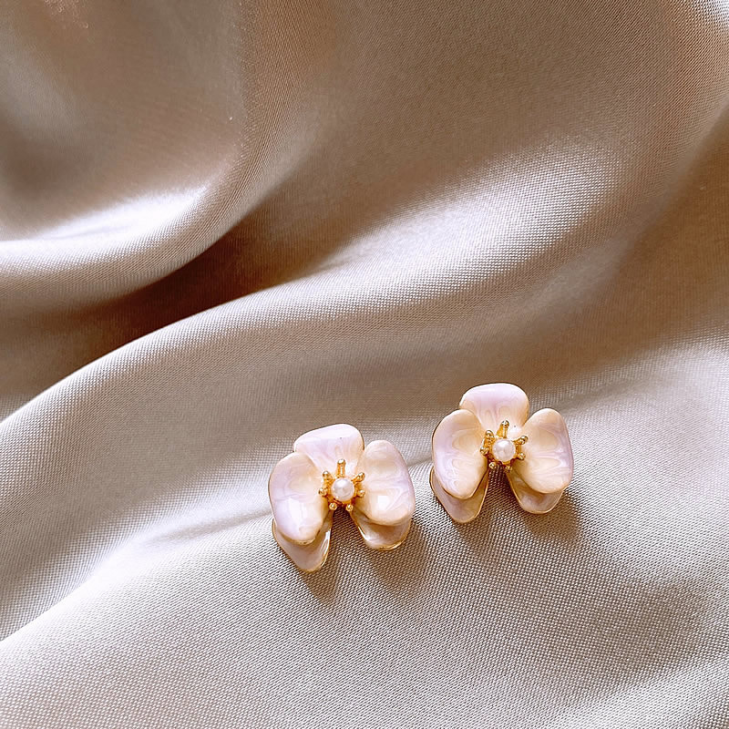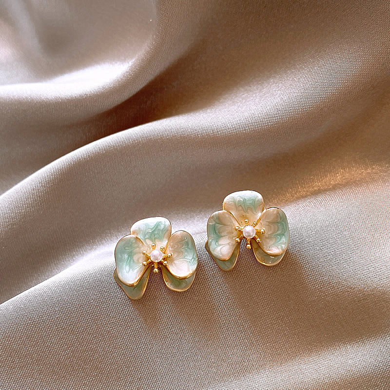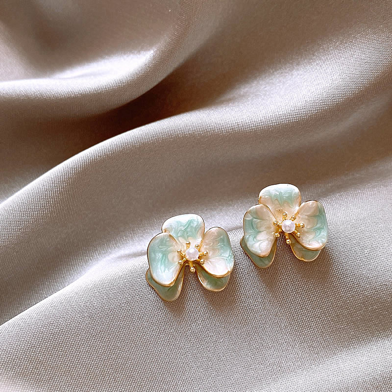 银针蓝色滴油晕染花朵珍珠耳钉小巧精致百搭耳环时尚甜美轻奢耳饰