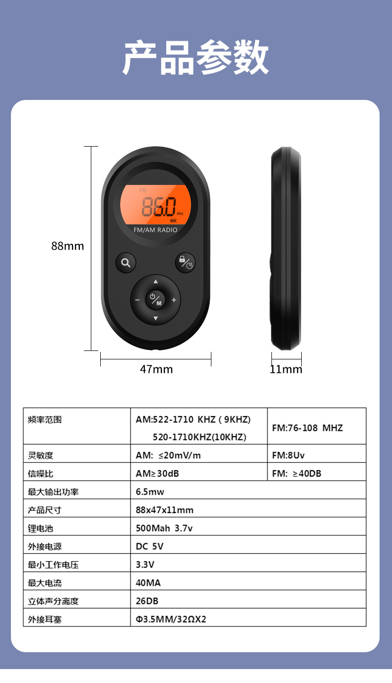 5.接收灵敏度: AM: ≤20mV/m FM:8Uv